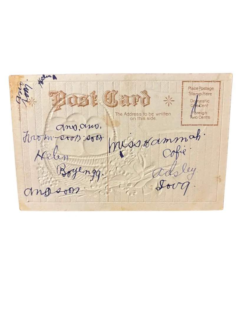 This listing is for one antique Easter postcard. The front of the postcard depicts a straw basket filled with colorful Easter eggs. The basket is surrounded by beautiful flowers. The background is an excellent shade of red and metallic silver. On the back, original owners writing. This is not postmarked or stamped, but it is estimated to be printed circa 1910. It was printed in Germany and is embossed. The postcard is in overall great antique condition with some minor staining on the corner- as seen in photograph. Will be shipped top loaded for protection.