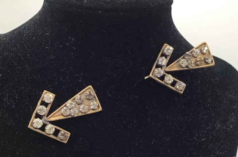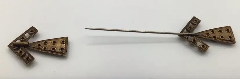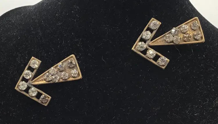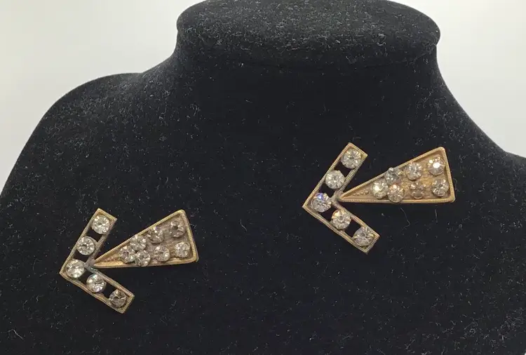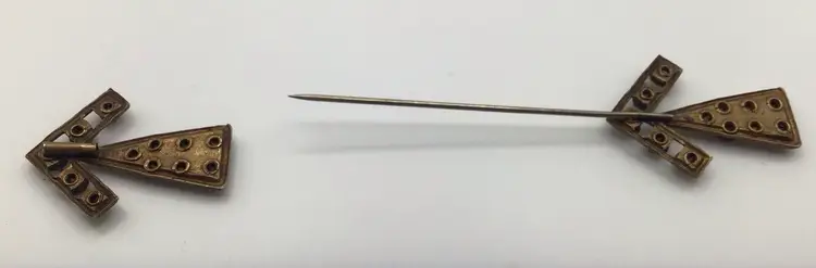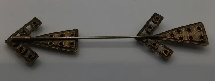 Bronze tone double prong set rhinestone arrow 1920s. Can be worn on lapel, cardigan or scarf. #120