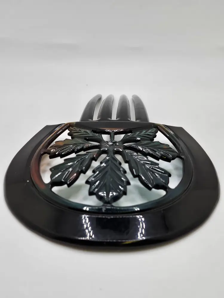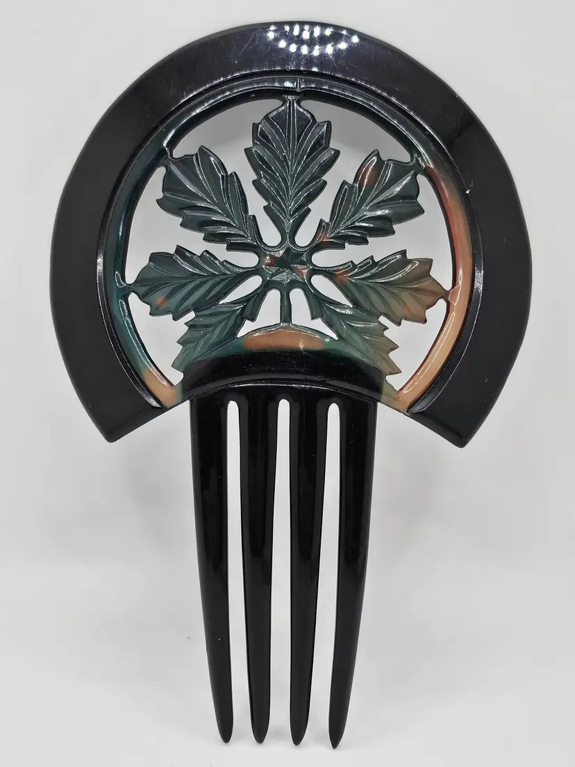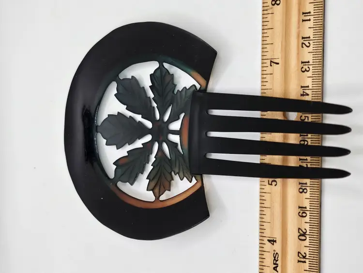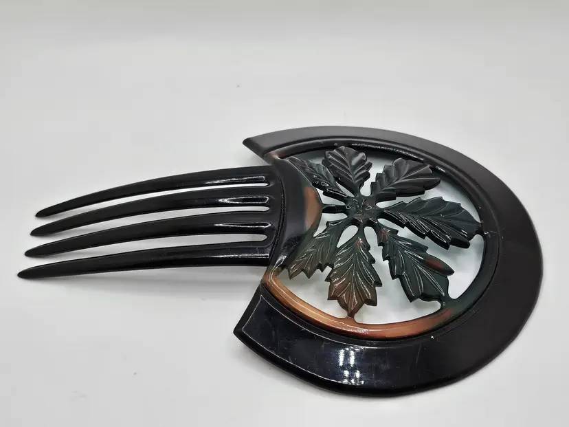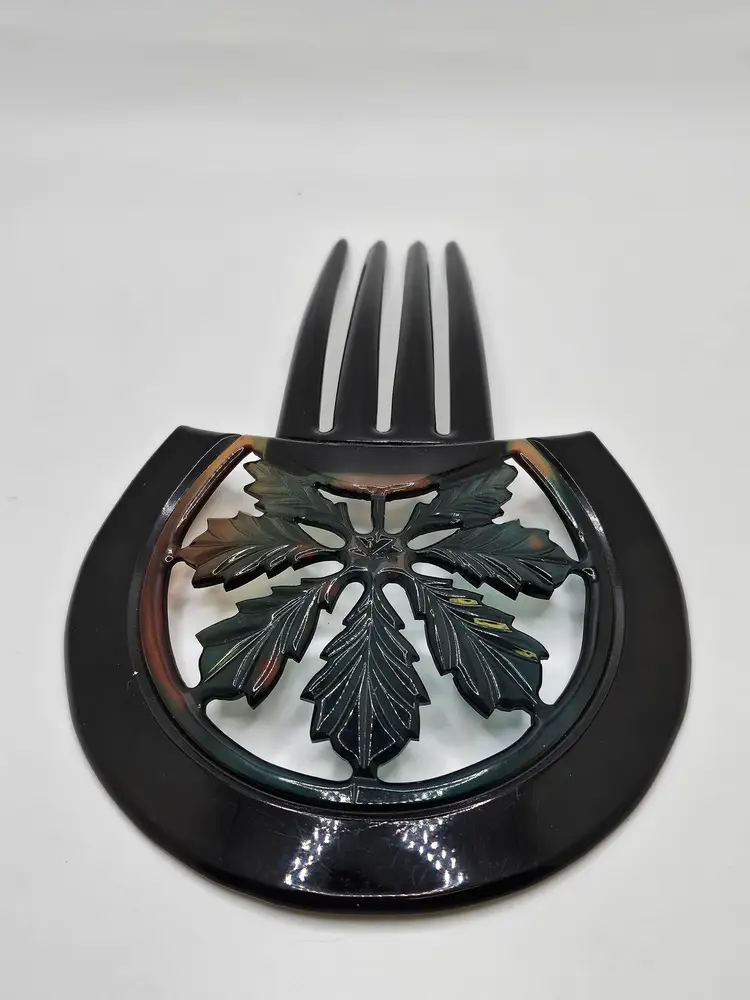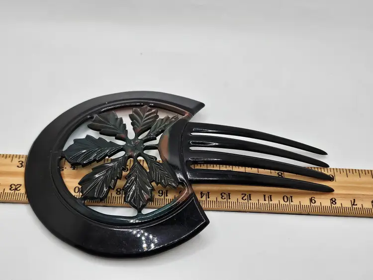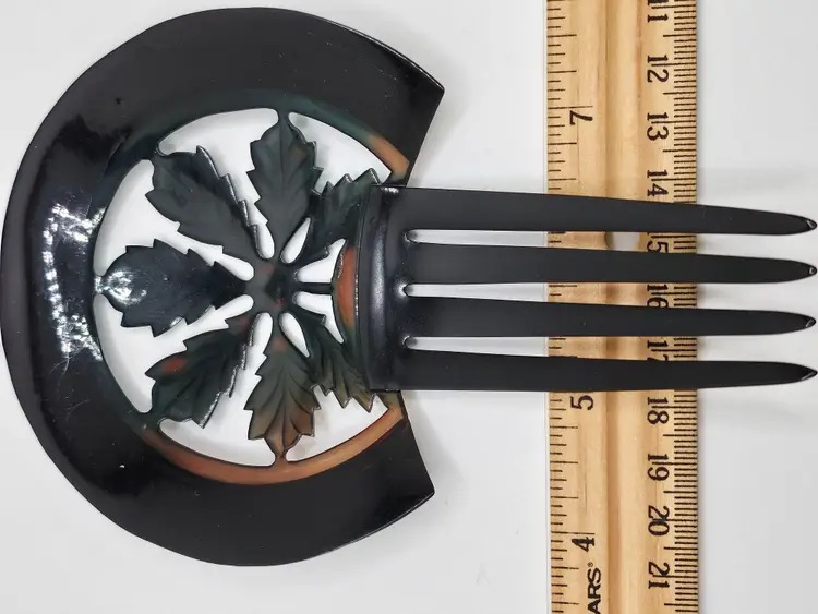This absolutely STUNNING antique beauty is large and in charge! Measuring a whopping 6" long × 4" wide (top) × 1.25" wide (comb teeth) × 0.75" tall Showing very minimal signs of age and wear. Has hues of black, brown, dark Emerald green, and some tan when in light. Has four (4) curved comb teeth and a beautiful leaf or floral design carved into it. Made out of celluloid. I have several of these and in different shapes, styles, and sizes.