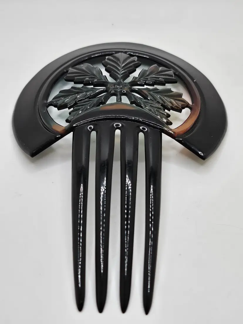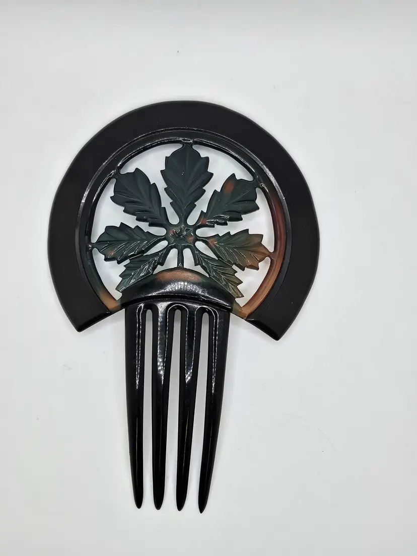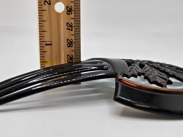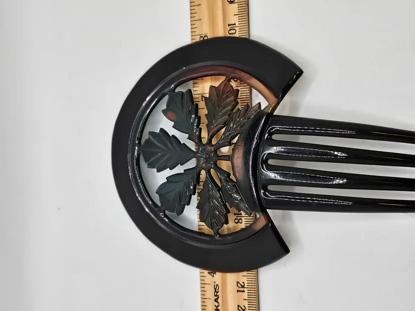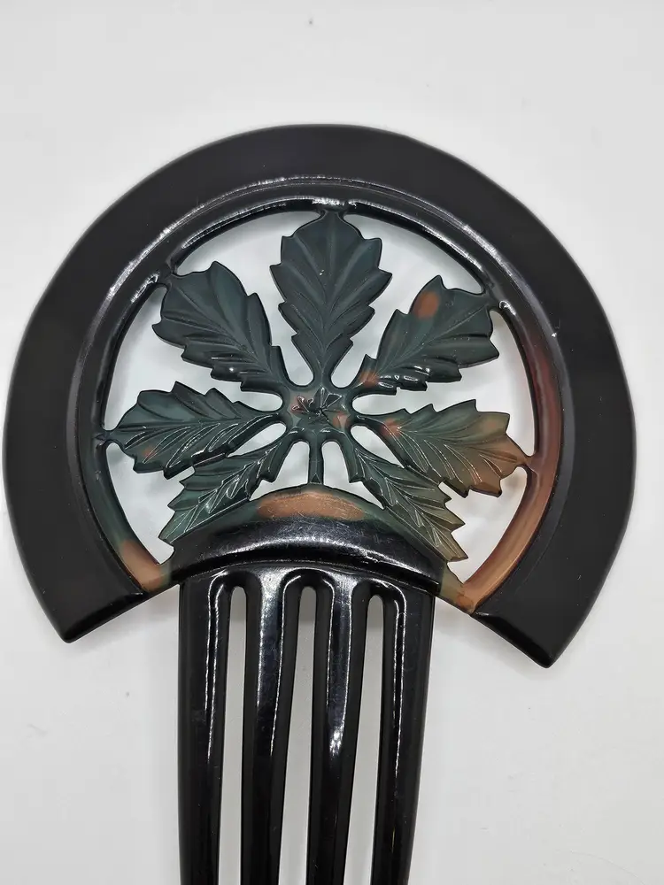 This absolutely STUNNING antique beauty is large and in charge! Measuring a whopping 6" long × 4" wide (top) × 1.25" wide (comb teeth) × 0.75" tall Showing very minimal signs of age and wear. Has hues of black, brown, dark Emerald green, and some tan when in light. Has four (4) curved comb teeth and a beautiful leaf or floral design carved into it. Made out of celluloid. I have several of these and in different shapes, styles, and sizes.