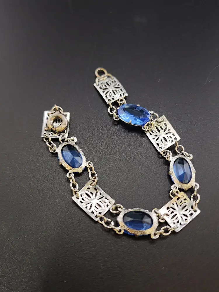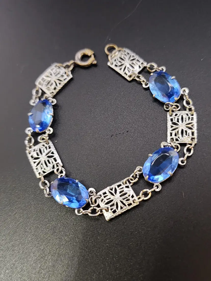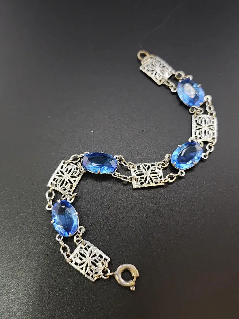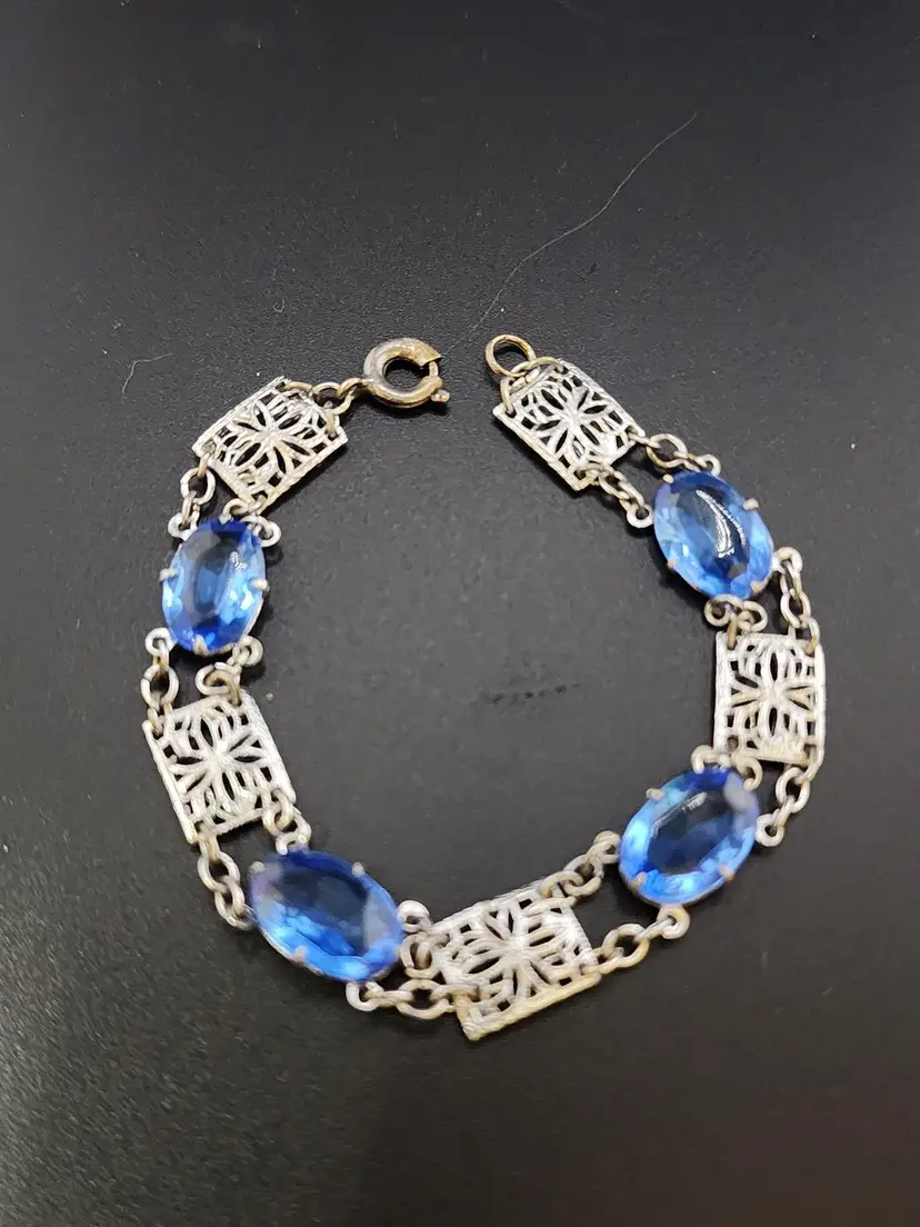 Size: 6.5" Color: Silver, Blue Condition: Very good condition Era: Circa 1920s Signed: None Details: lightweight bracelet with beautiful stones!