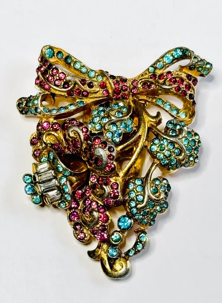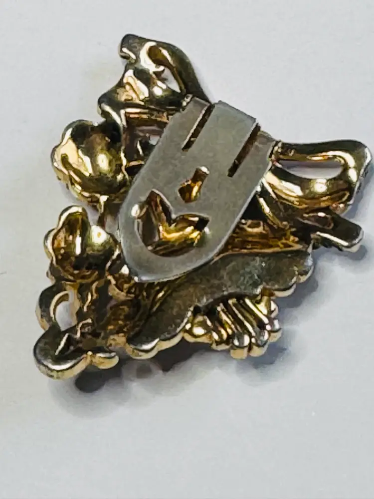 Measures 1.75” x 1.5”. I suspect this is early Mazer Brothers or Cohn & Rosenberg (Coro) because of the workmanship and gold plating. Some plating wear in front from normal use, needs some cleaning, otherwise in VGVC