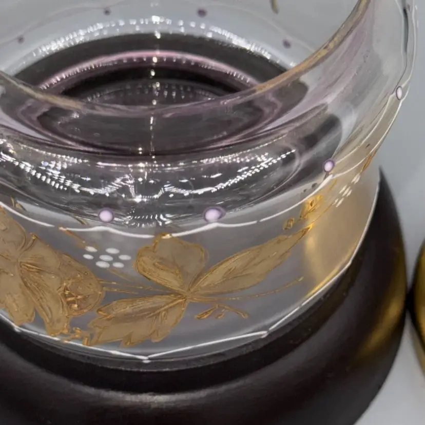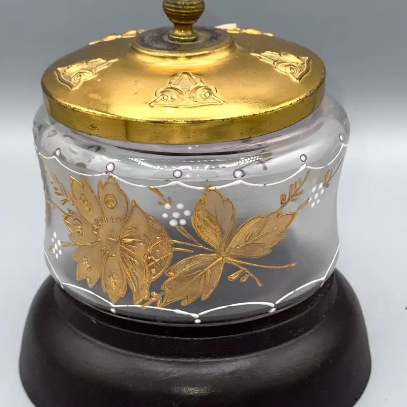 Antique jar dating from the Art Nouveau period (circa 1890s-1910s) beautiful hand-painted floral and leaf motifs in rich gold enamel, accented with white enamel "moriage" likely served as a biscuit barrel, cracker jar, sugar bowl, or perhaps a vanity/powder box. The organic, flowing designs are characteristic of high-end European art glass from Bohemia or France during the Belle Époque/Victorian transition period.