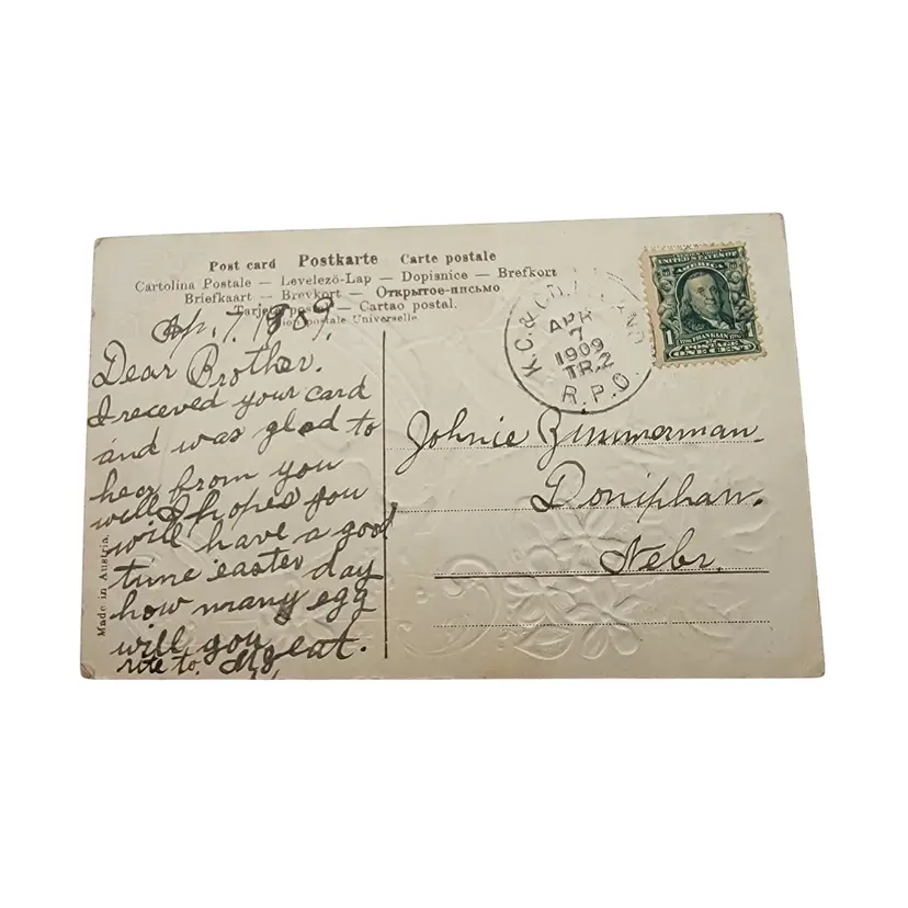 • Embossed and colorful floral and bunny design • Postmarked 1909 with handwritten message • Made in America, vintage collectible • Features classic Easter imagery • Standard postcard size