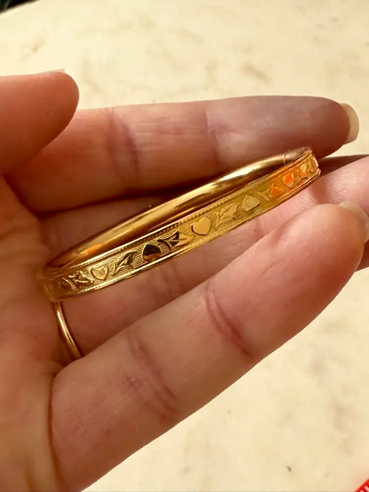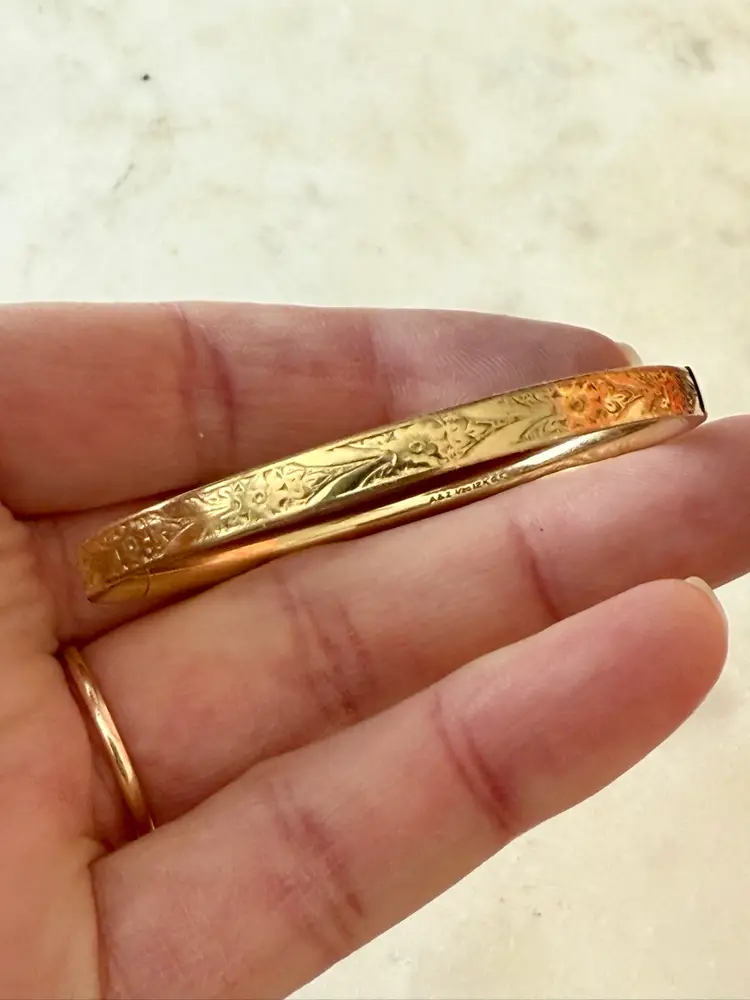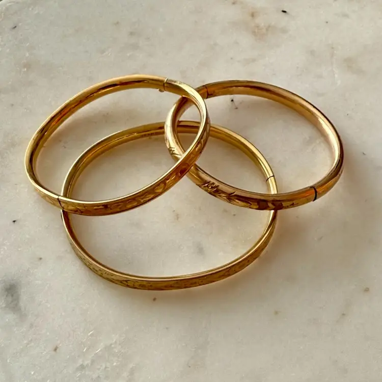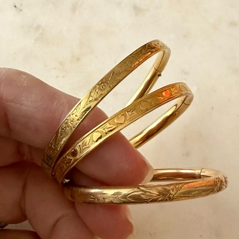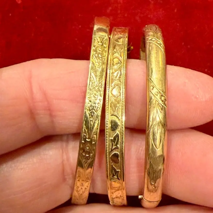 Antique Victorian Embossed Chased 1/20th 12K Gold Filled Baby Bracelets Lot of (3) as Featured in Photos. All in very nice overall condition with minimal signs of use consistent with wear and age. All clasps work securely with internal safety bar. All hallmarked 1/20th 12K gold filled. Inner circumference determined by photos. Accommodates infant and small child size. Sweet gift for infant, baby shower, small child, christening or birthday.