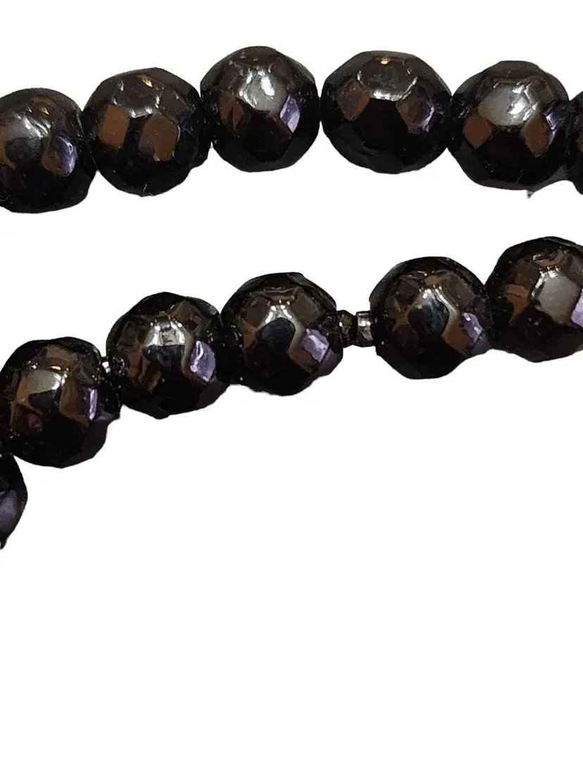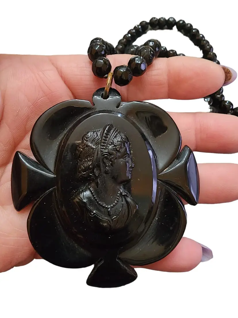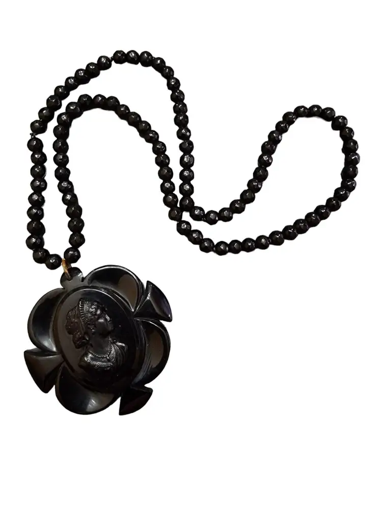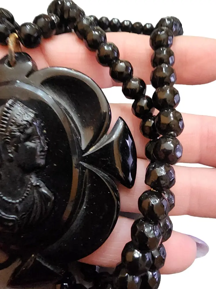 Color: Black Condition: Very good Signed: None Details: The cameo is huge. The beaded necklace is made of black 8-mm faceted crystal. Loop over! It has a small knot a quarterly of the way up.