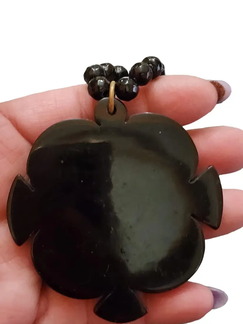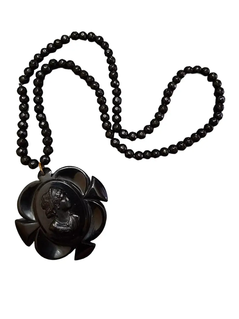 Antique Bakelite Cameo Pendant On Black Crystal Beaded Necklace (A4936)