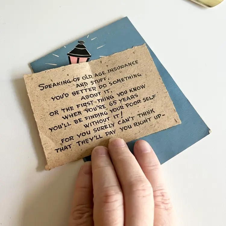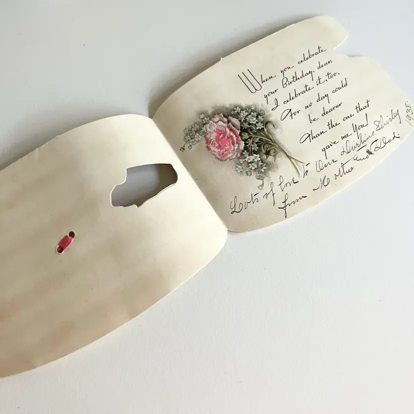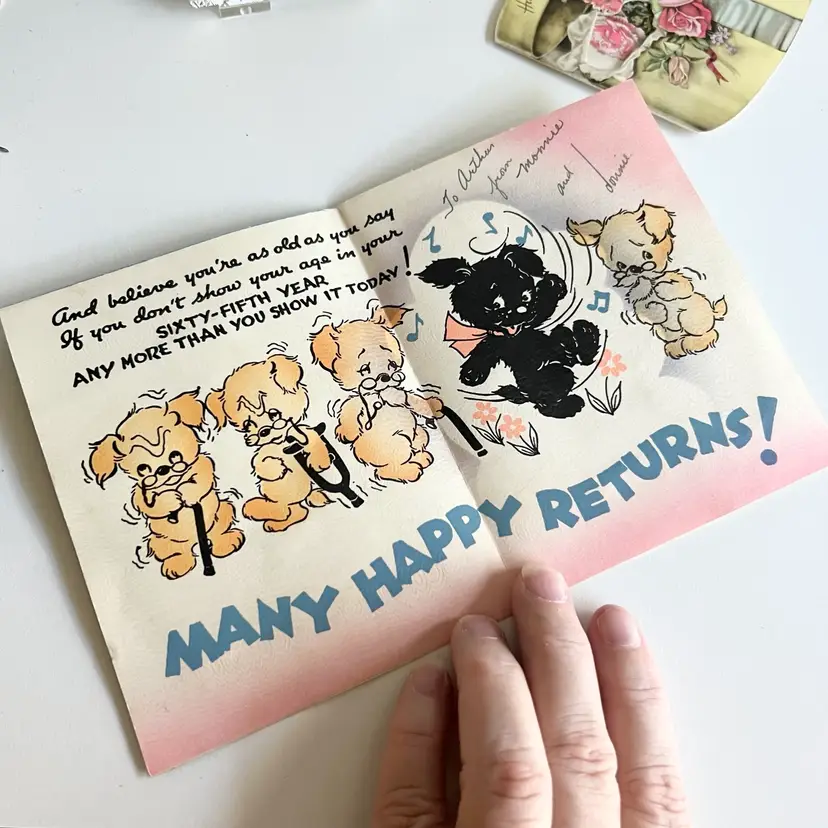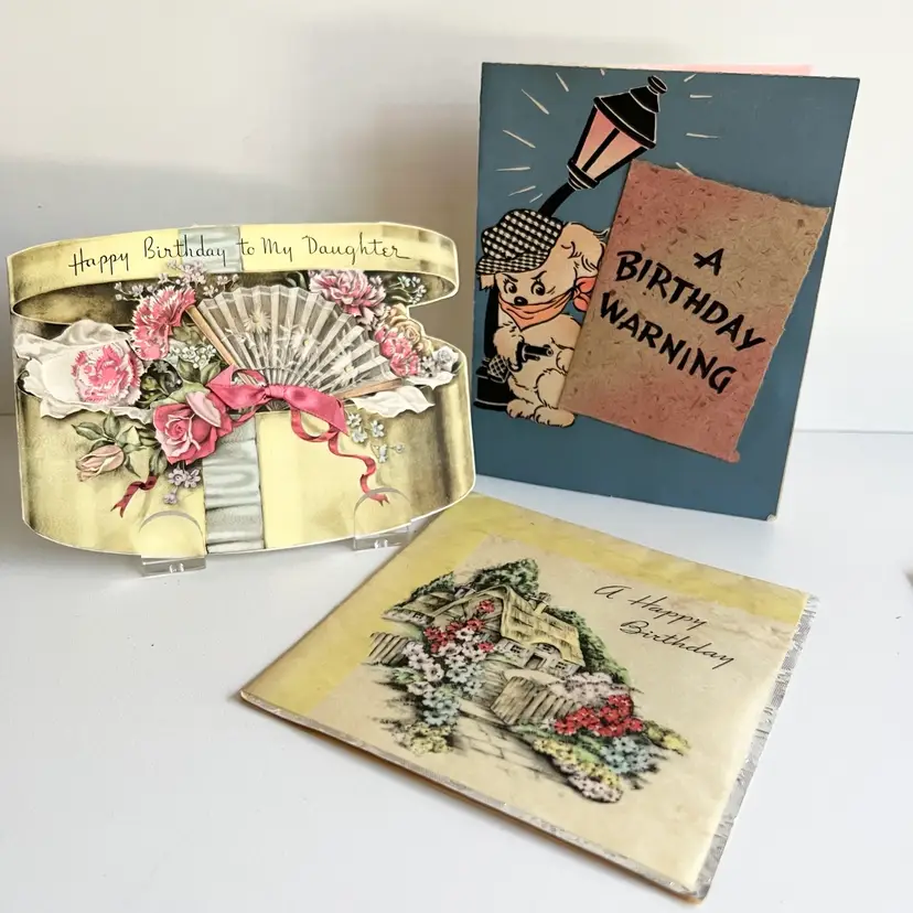 A trio of really cool birthday cards from the 1920s. Great for displaying in flower frogs or stands. One has a bit of satin ribbon on it. One has a foil insert and one has a little birthday warning message on the front. Super unique and special. Even the paper is interesting. The largest one is 5 1/2”x 4 1/2 inches. Ships from Canada.
