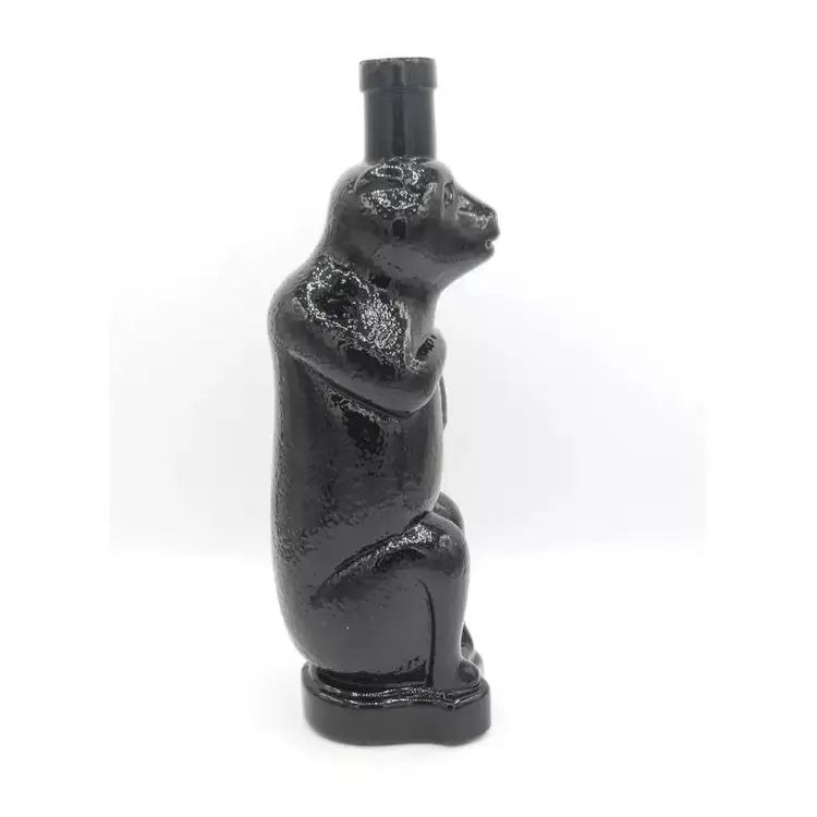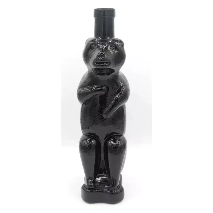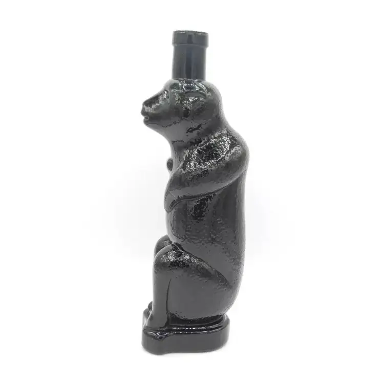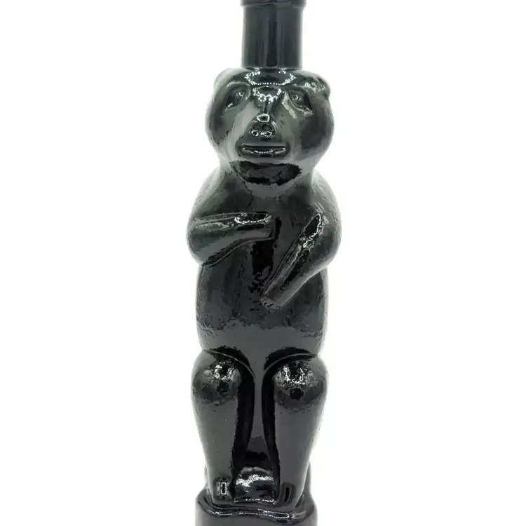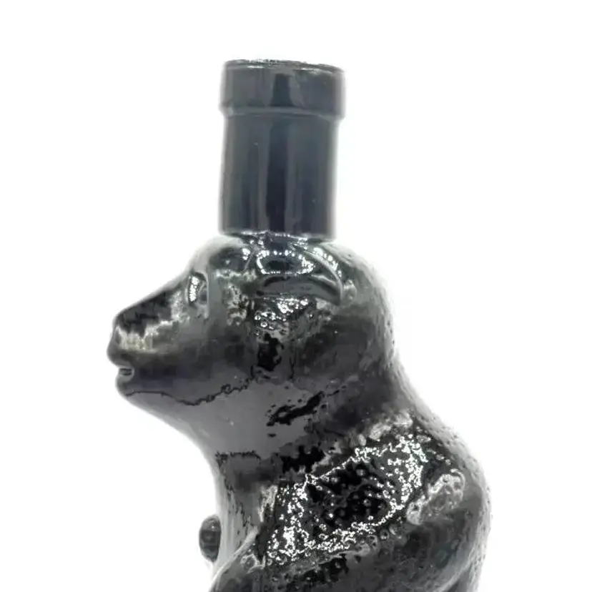 This very rare, antique, 1885-1895, black amethyst glass Kummel beer bottle features a unique figural bear design that is a must-have for any breweriana collector. Made in Germany, this rare bottle adds a touch of history and charm to your collection. The deep black color of the glass makes it a striking addition to any display. The bottle is a figurine style, depicting a bear in a standing position. The intricate details of the bear's face and fur make this piece a true work of art. This collectible item is perfect for those who appreciate the history and craftsmanship of beer bottles. This is the REAL DEAL and not one of the much later reproductions that have the screw top ridges and longer neck. THIS IS AN AUTHENTIC, GERMAN KUMMEL BOTTLE!! It is 11" tall. It is in GREAT condition. No cracks or damage! Please see all pics, as they are part of the description.