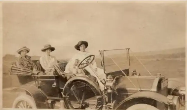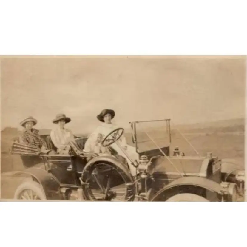 Antique black and white photo of 3 women and 1 child sitting in old car. Gives idea of fashions of the past and type of car for the time period. No date as to when taken.