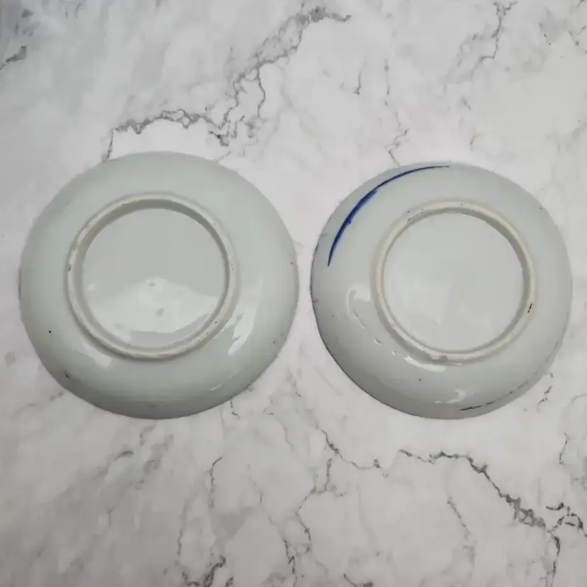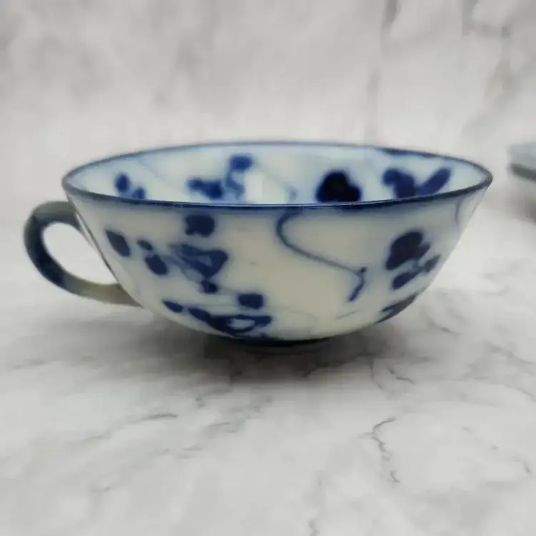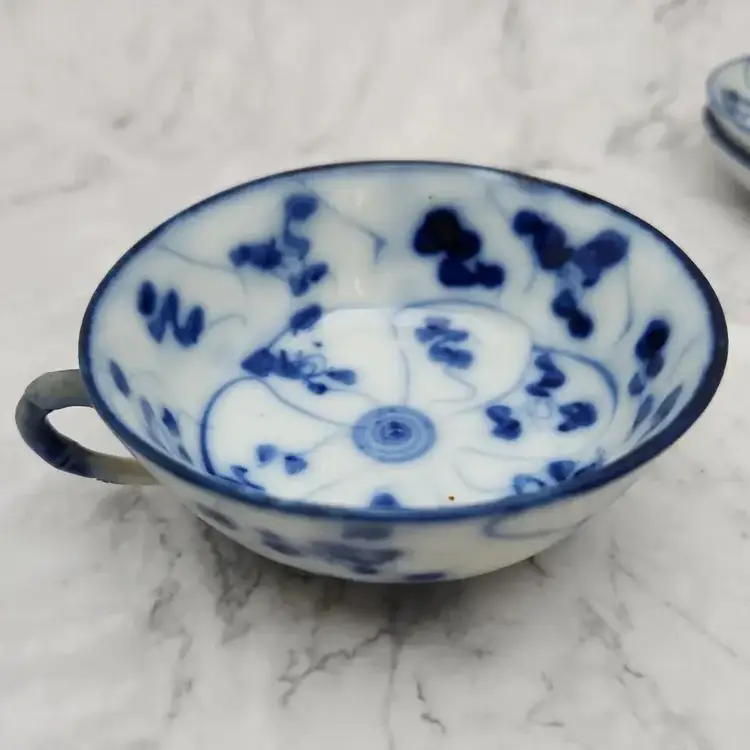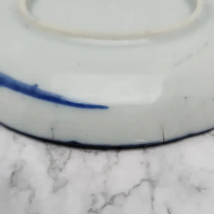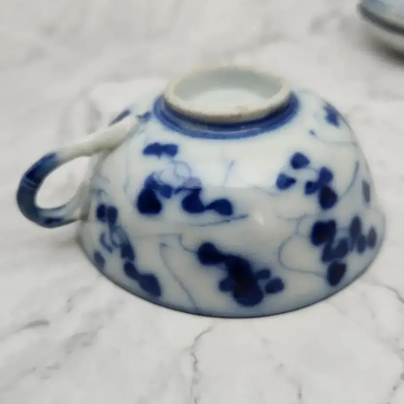 Please see the photos for its characteristics. These items were handmade and hand painted. Because of their age and time of manufacture, they are not perfectly round or perfect all around in height. Note on the saucer with the darker blue rim, there are 2 small cracks. These cracks are really smooth to the touch and not sharp.