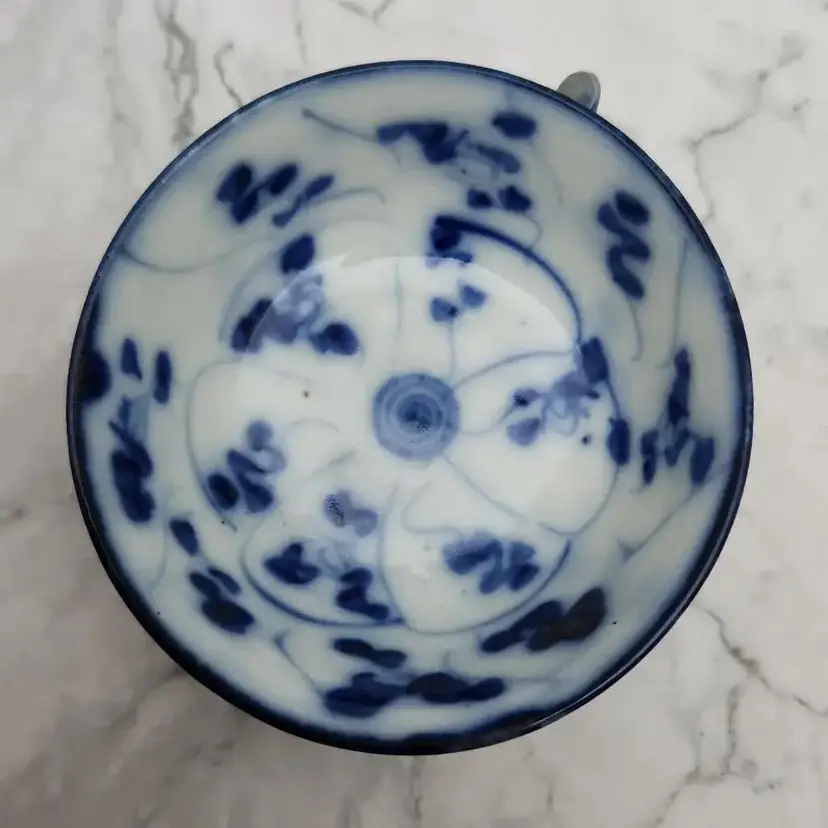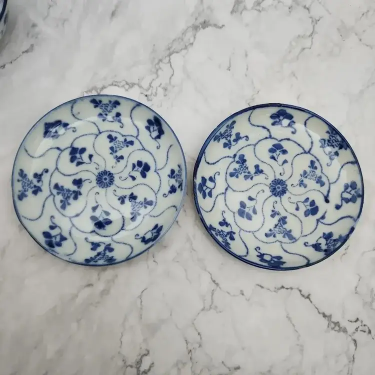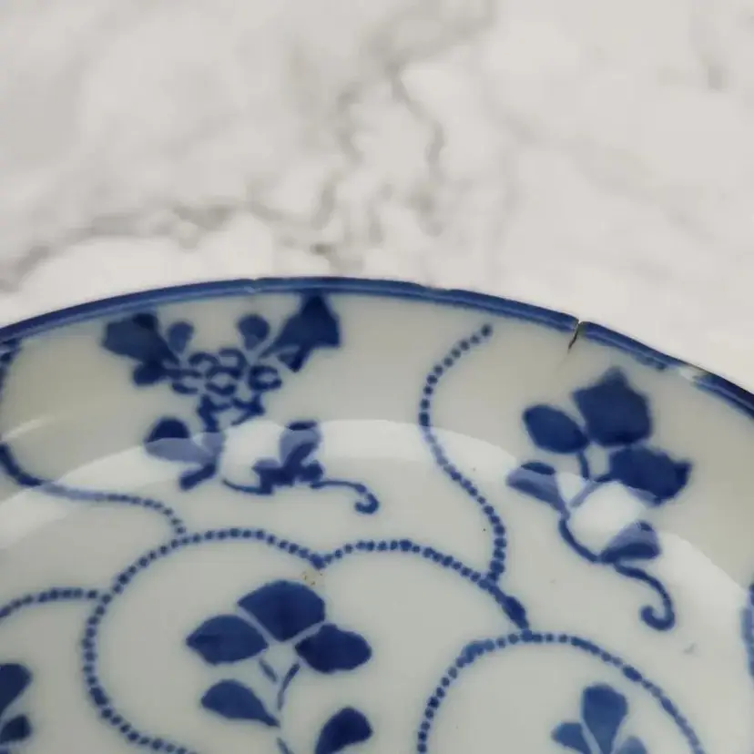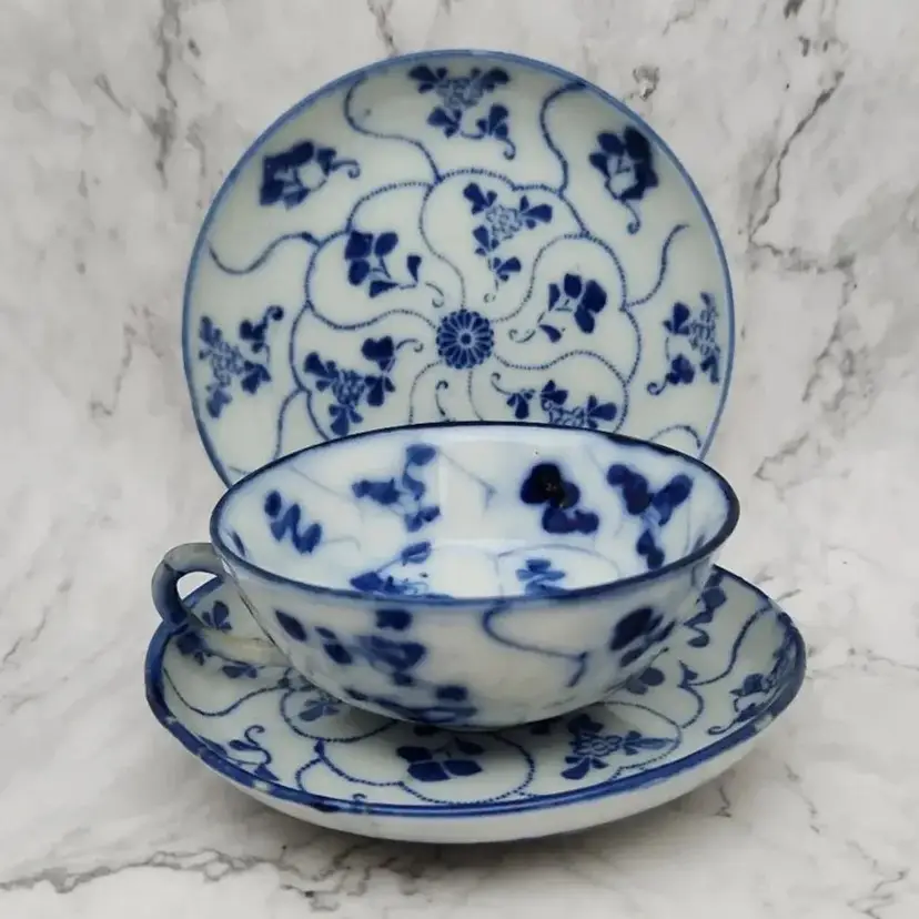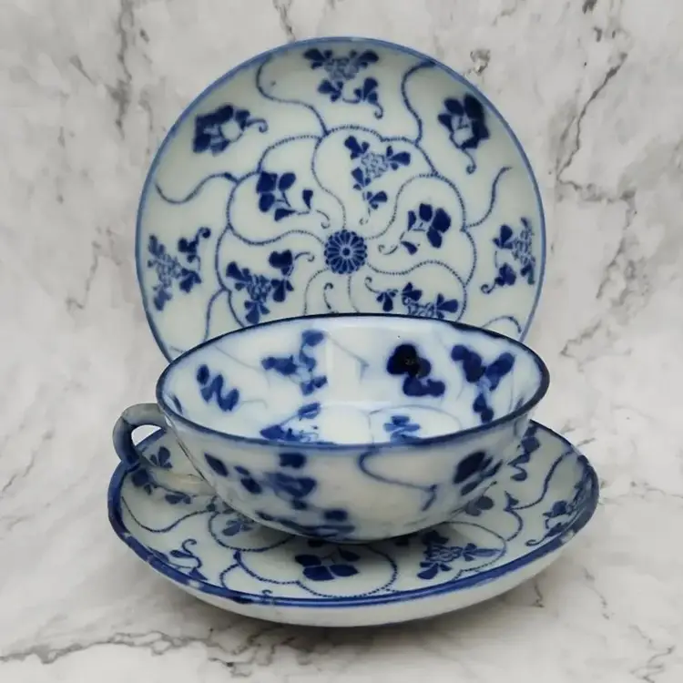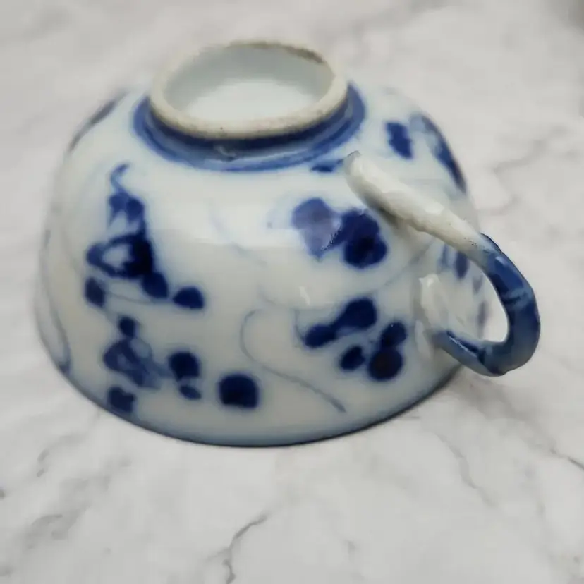Please see the photos for its characteristics. These items were handmade and hand painted. Because of their age and time of manufacture, they are not perfectly round or perfect all around in height. Note on the saucer with the darker blue rim, there are 2 small cracks. These cracks are really smooth to the touch and not sharp.