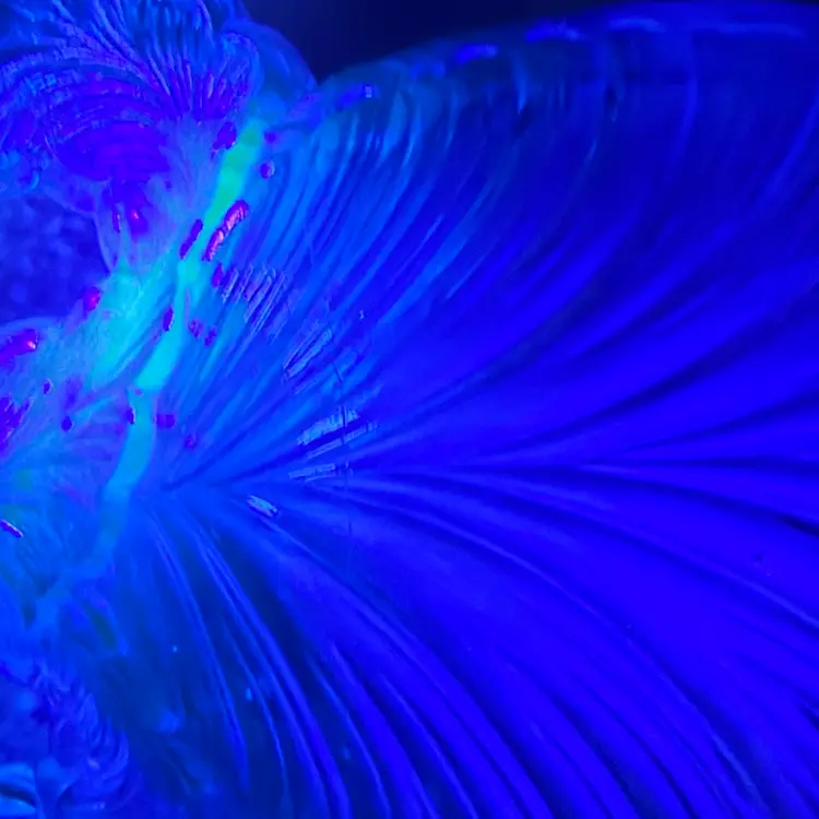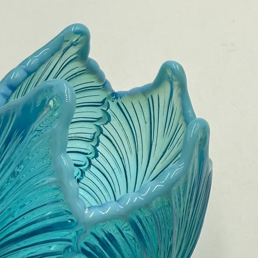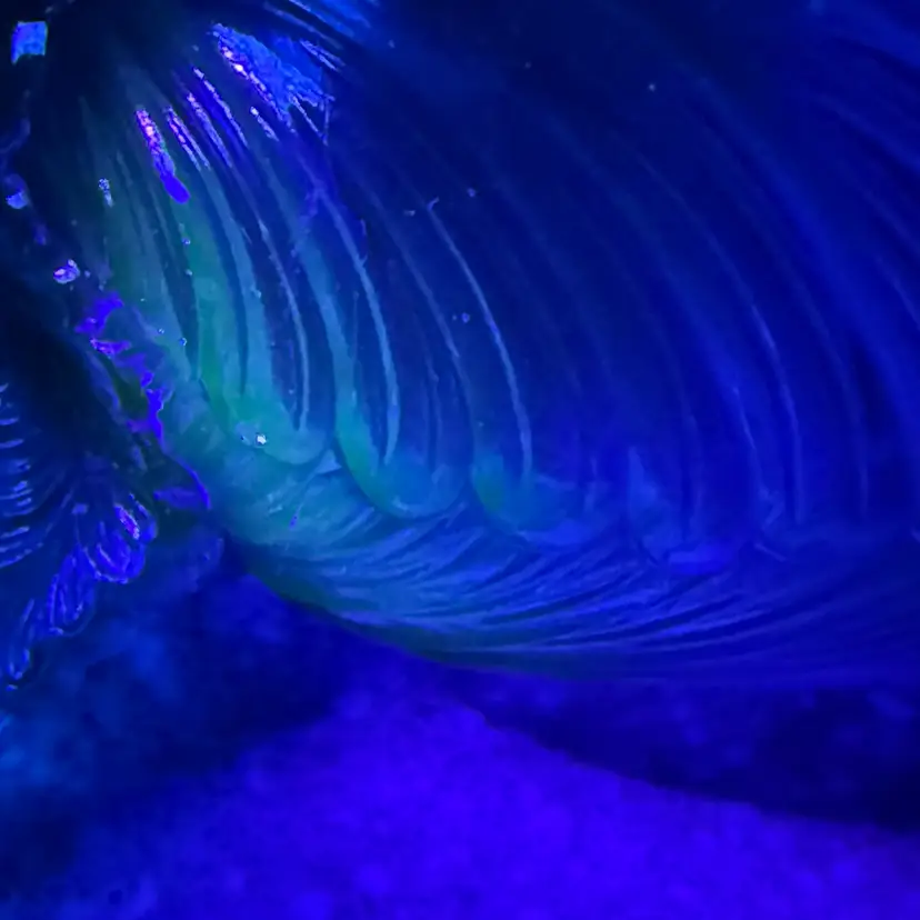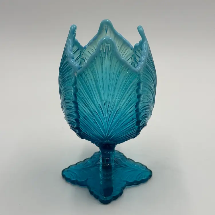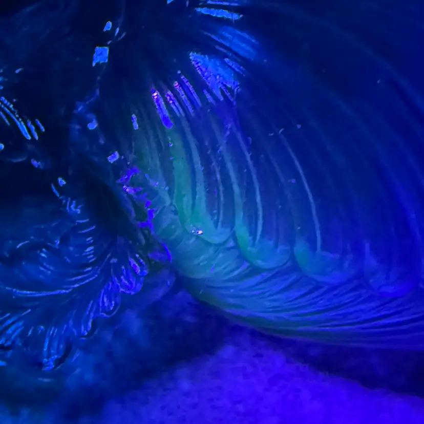 In good condition. Does not have any chips or cracks. It does have a faint UV glow to it. Measures 6 inches tall and 4 1/4 inches wide from arm to arm.