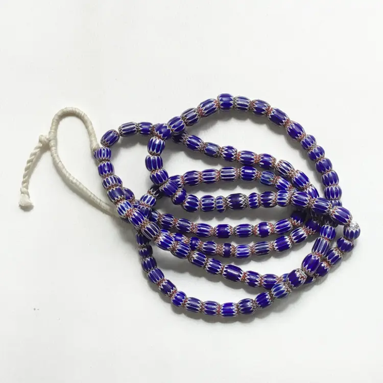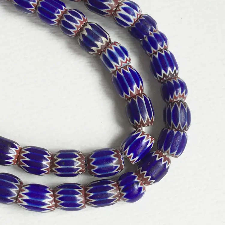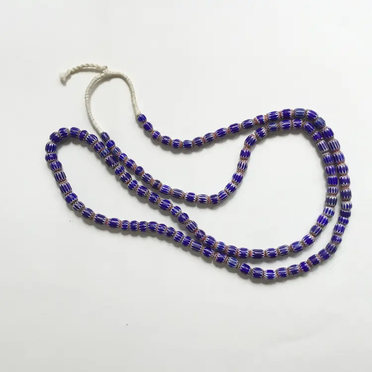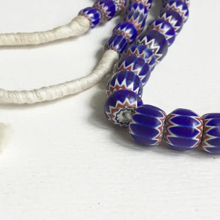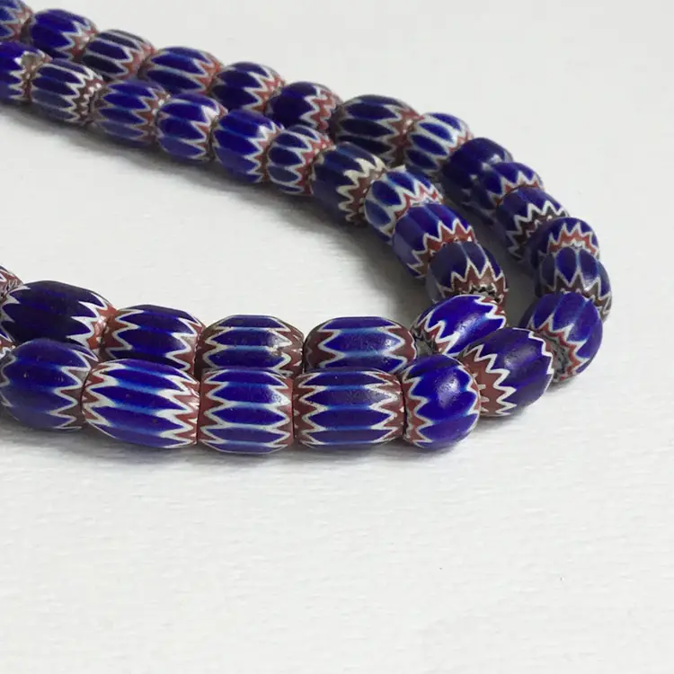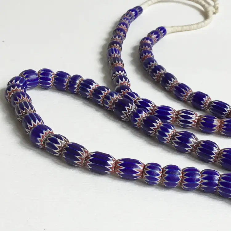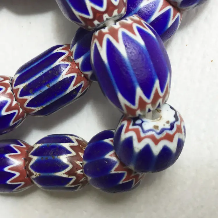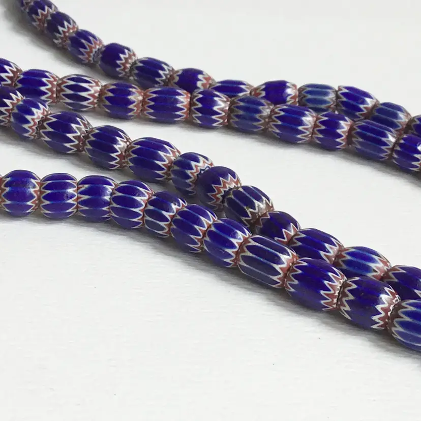 Strand of mostly six layer chevron trade glass beads in blue, red and white. Strand is approximately 46" in length including the cord. Length of the area of the beads are approximately 41" long.