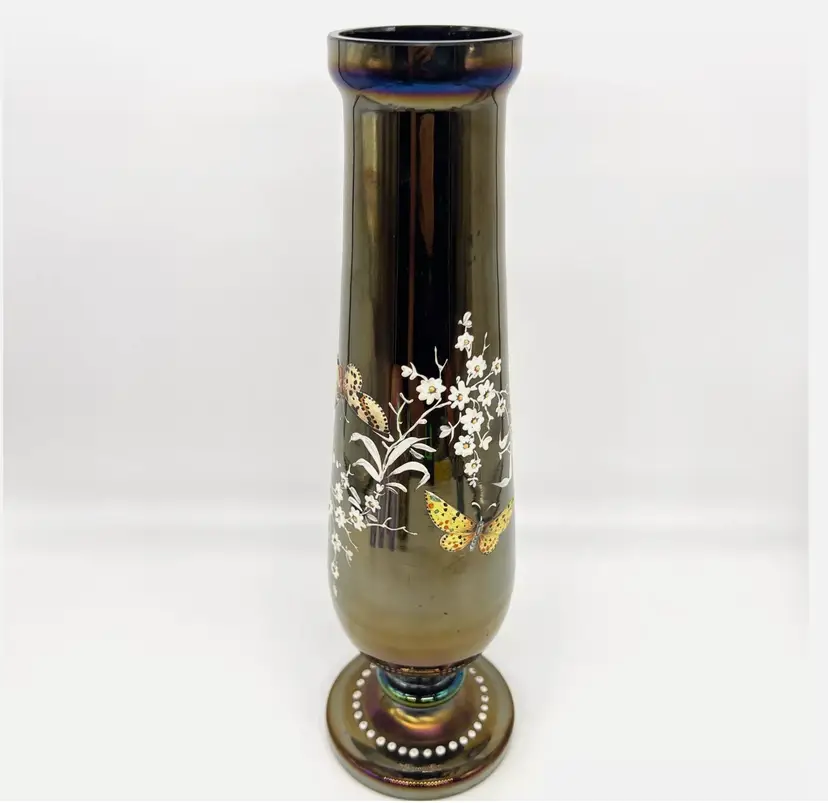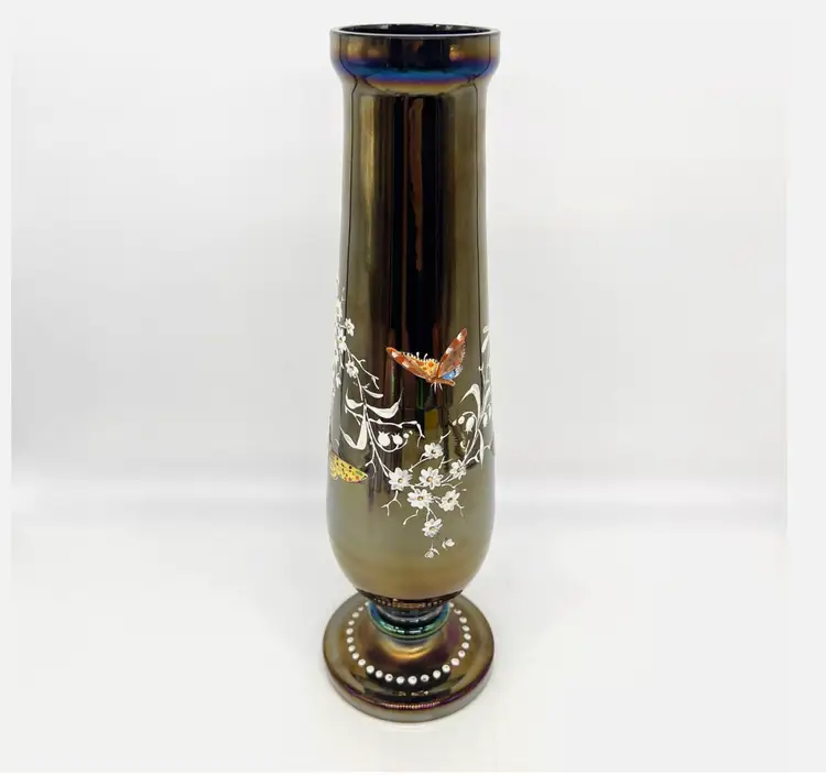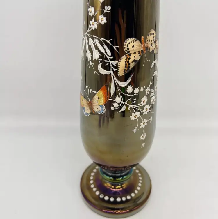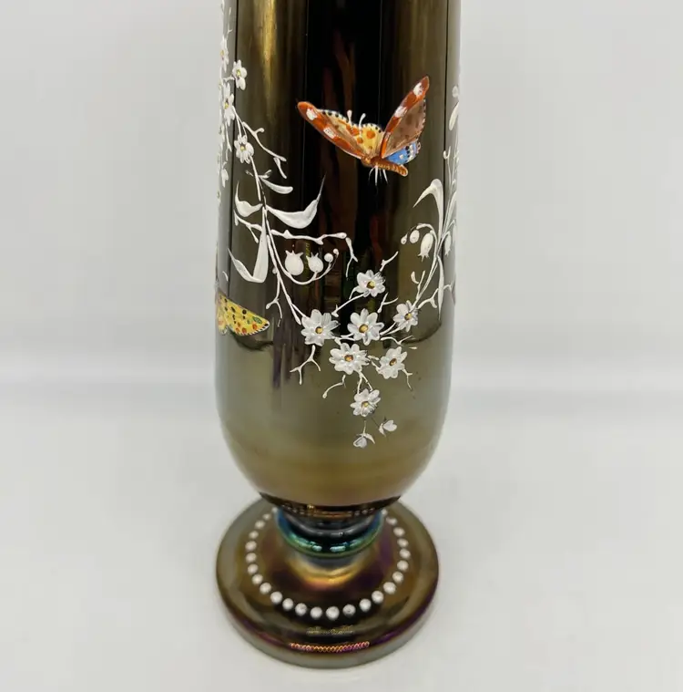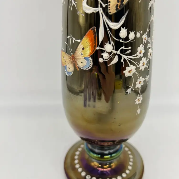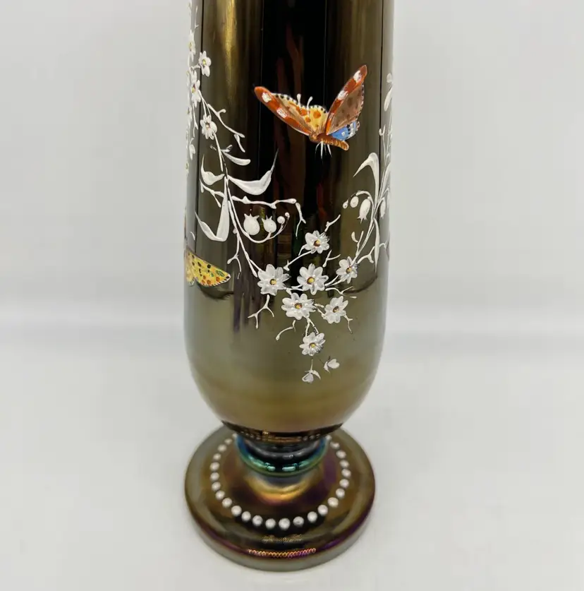 This art glass vase has a very heavy iridescent finish. It is hand painted with enamel butterflies and florals. There are no markings or signatures, but it is part of the Gary Oldman collection presumed to be Moser.