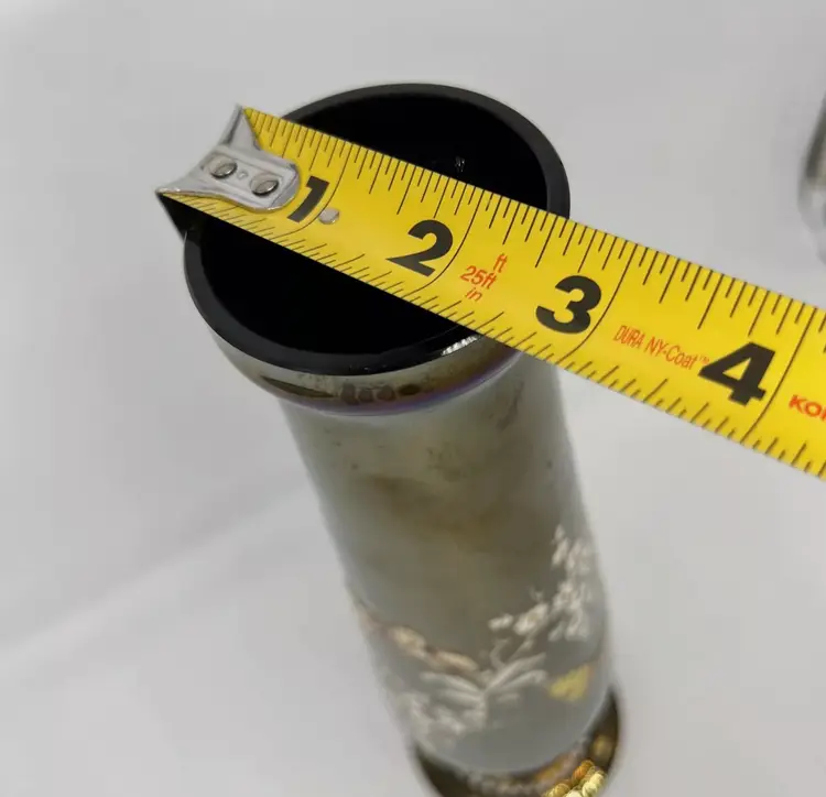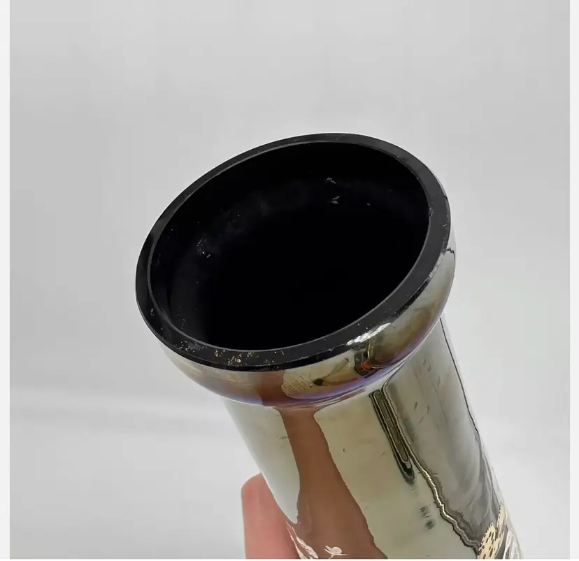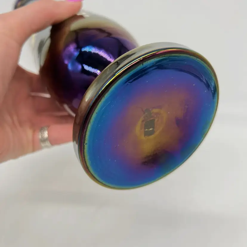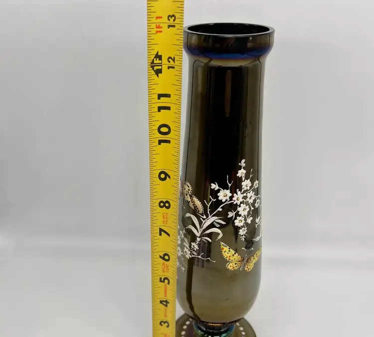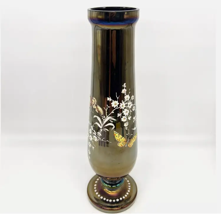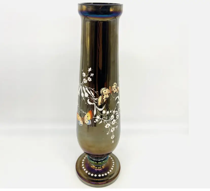 This art glass vase has a very heavy iridescent finish. It is hand painted with enamel butterflies and florals. There are no markings or signatures, but it is part of the Gary Oldman collection presumed to be Moser.