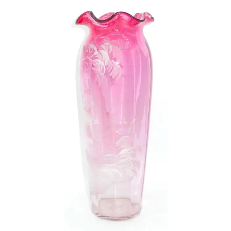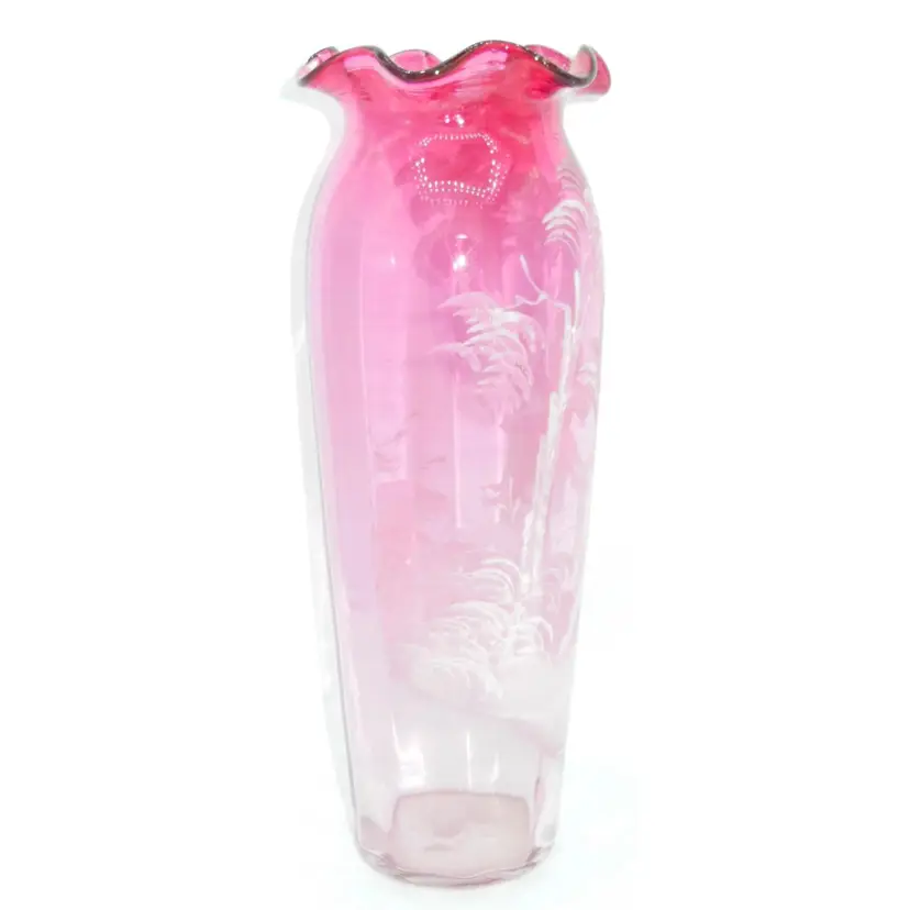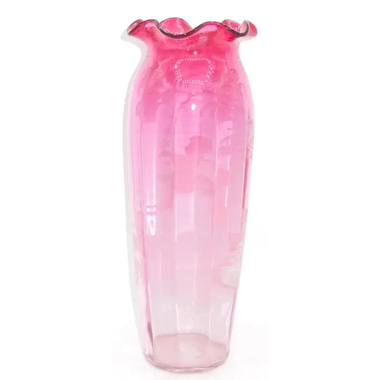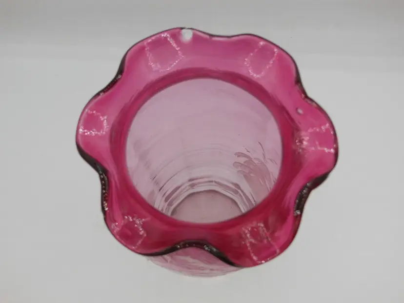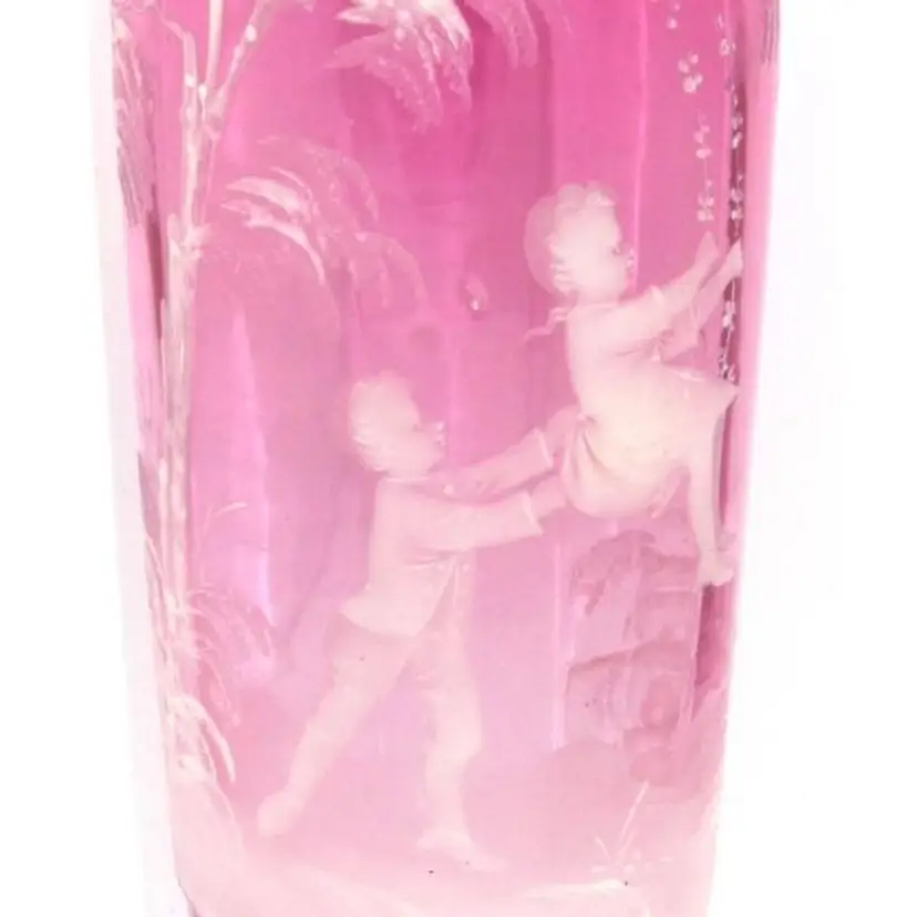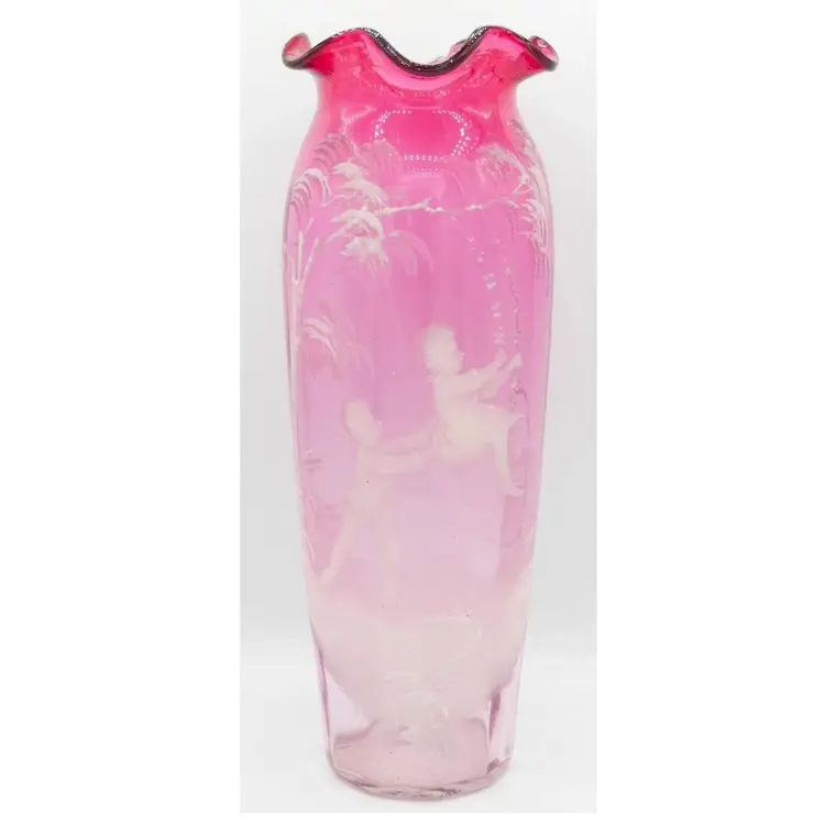 This is an amazing, Antique Bohemian, Hand Blown, Enameled Cranberry Glass, Mary Gregory Vase, Depicting Little Boy Pushing Little Girl On A Swing~ 10 Optic Panels Date This Vase As PRE-WAR (1879-1939). It has a rough pontil scar on the bottom. It measures: 10.5" high and 4.25" diameter at widest area. It is in great condition, except for one chip on the rim, (see last pic) that looks like it could have been a popped air bubble-as there is anther air bubble nearby inside the glass. The chip can be covered easily, if you wish, with a marker of the same, or very close color-a pink highlighter may work. This amazing vase still displays so wonderfully and is such a piece of MG beauty and history, that It's a chip that can be forgiven, as CLL would say. lol Please see all pics, as they are part of the description.