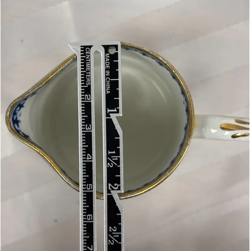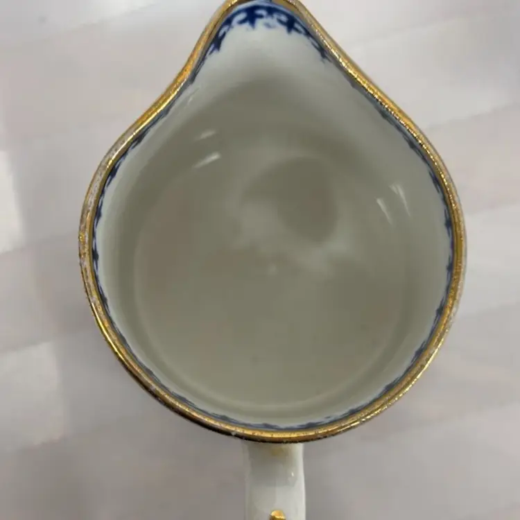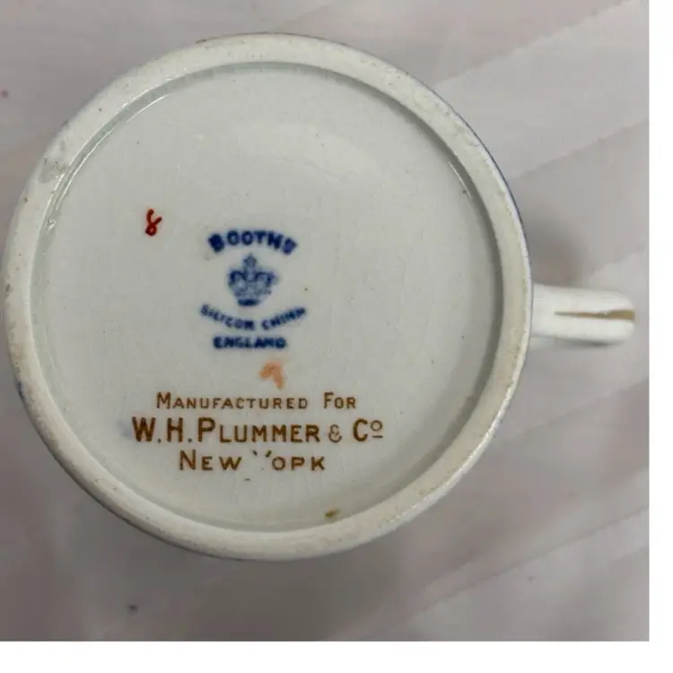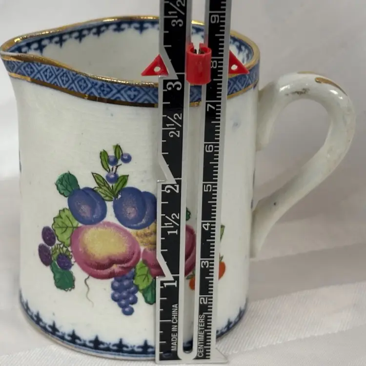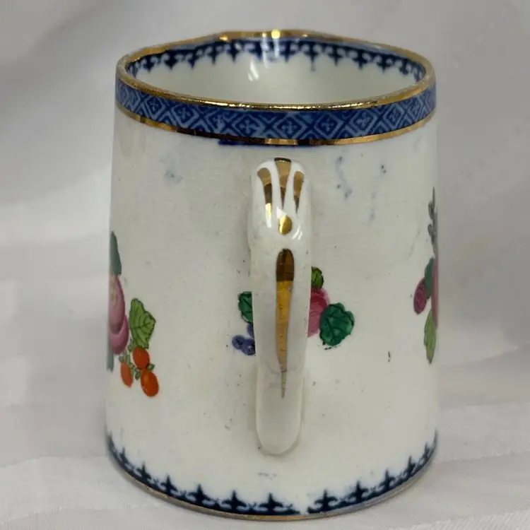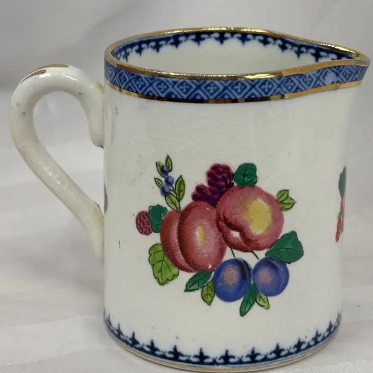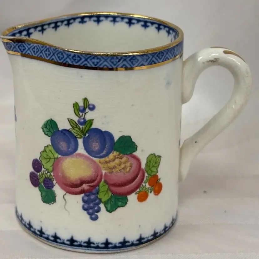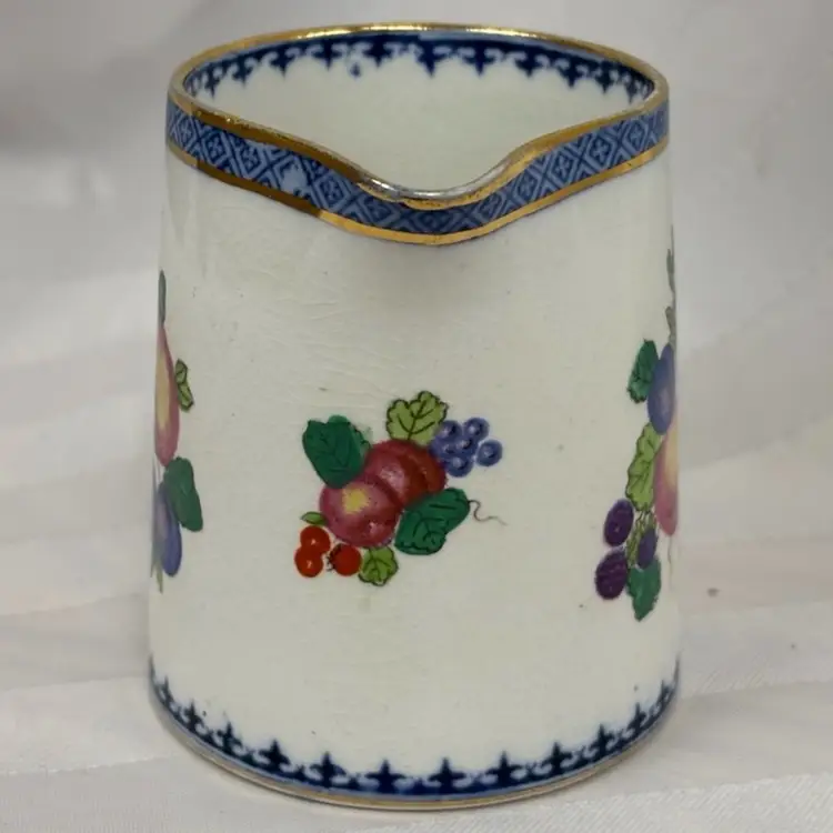 This is a Booths Silicon China creamer, made in England. It is decorated with a fruit pattern featuring plums, peaches, grapes, and berries. The creamer has a white background with blue and gold trim along the rim and base. The handle is simple and white, and the overall shape is slightly rounded. Booths was a pottery manufacturer founded in 1851 in Staffordshire, England, known for producing durable and decorative earthenware. The "Silicon China" mark indicates a type of semi-porcelain developed by Booths to be more resistant to chipping and cracking. The fruit pattern is a common motif in antique china, often associated with the aesthetic movement of the late 19th century. Similar fruit designs can be seen on pieces from other manufacturers, such as Richard Ginori's "Italian Fruits" pattern.