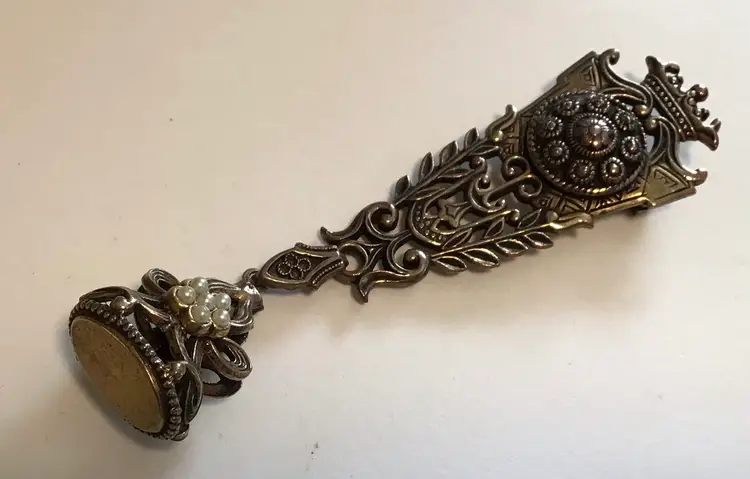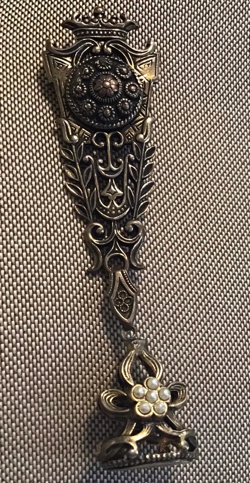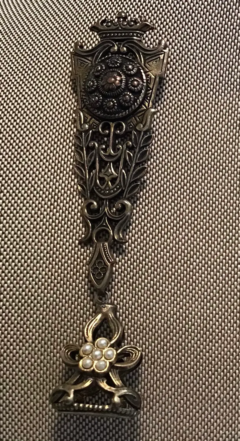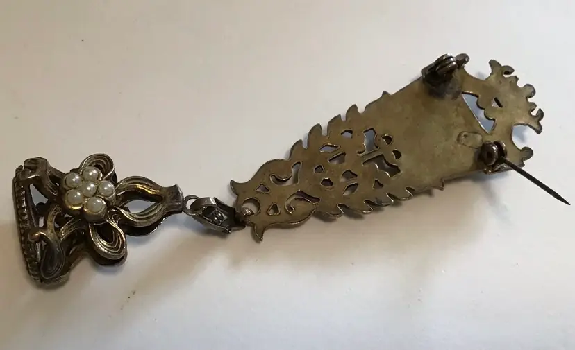 Regal ornate articulated brooch with faux Pearl floral dangle. 3-3/4”x1”. #302