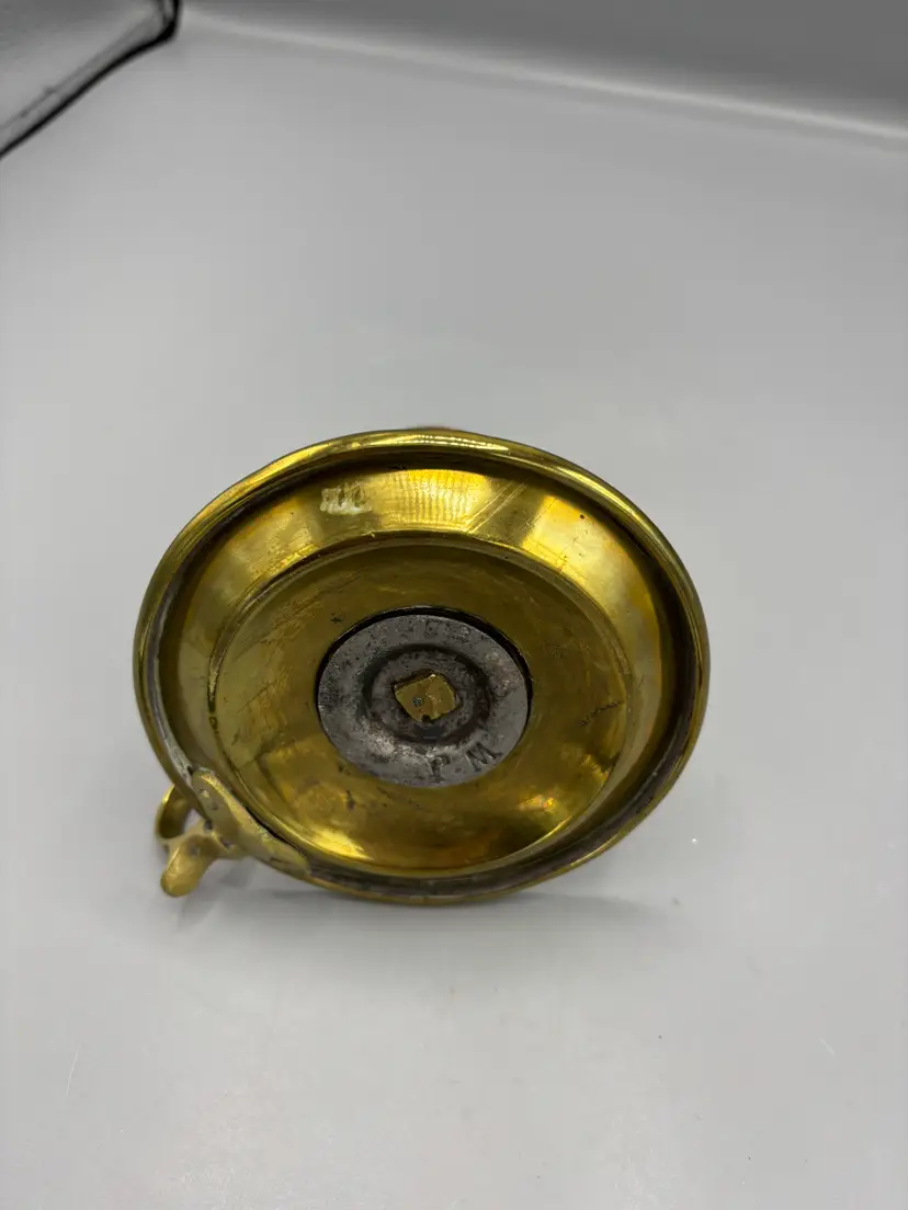 This elegant brass chamberstick features classic proportions at 4 by 4½ inches, designed for intimate candlelit ambiance. The antique finish showcases authentic patina characteristic of period metalwork, making it a distinguished addition to traditional or eclectic interiors. Perfect for bedside tables, dining settings, or as a collector's piece.
