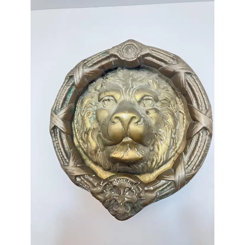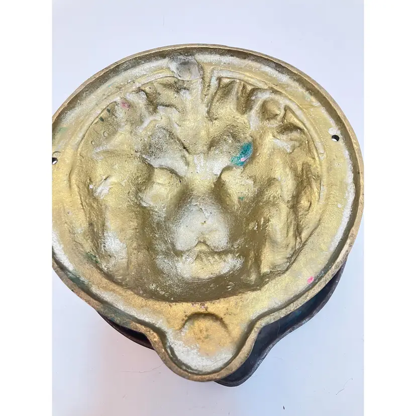 This is a unique 4.4 lb brass plated metal cast lion head door knocker. Mounting holes are 7 in apart on either side of the lion's head. Unique piece!