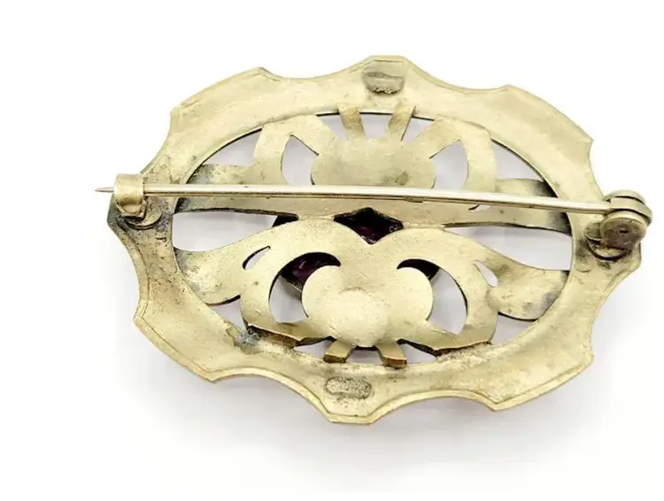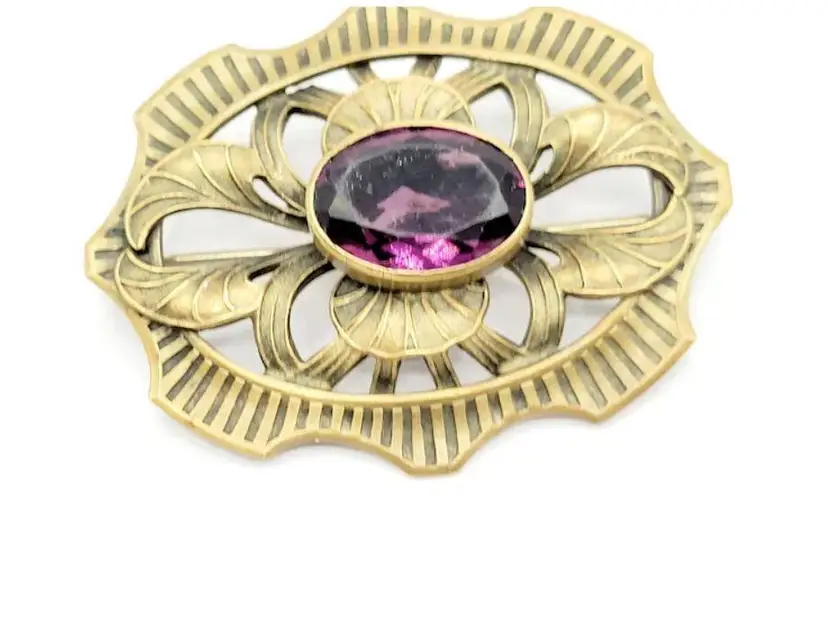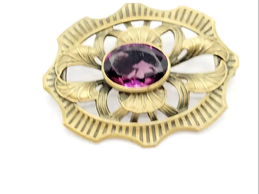 Nice older sash pin, its pretty heavy, has the c clasp, and is brass. Multi faceted glass stone, there are a few tiny flea bites here and there, which is typical in these older glass pieces, nice detailing to the setting, 2.5" by 2".