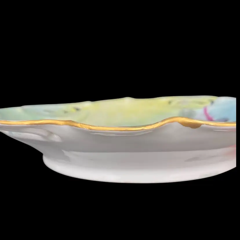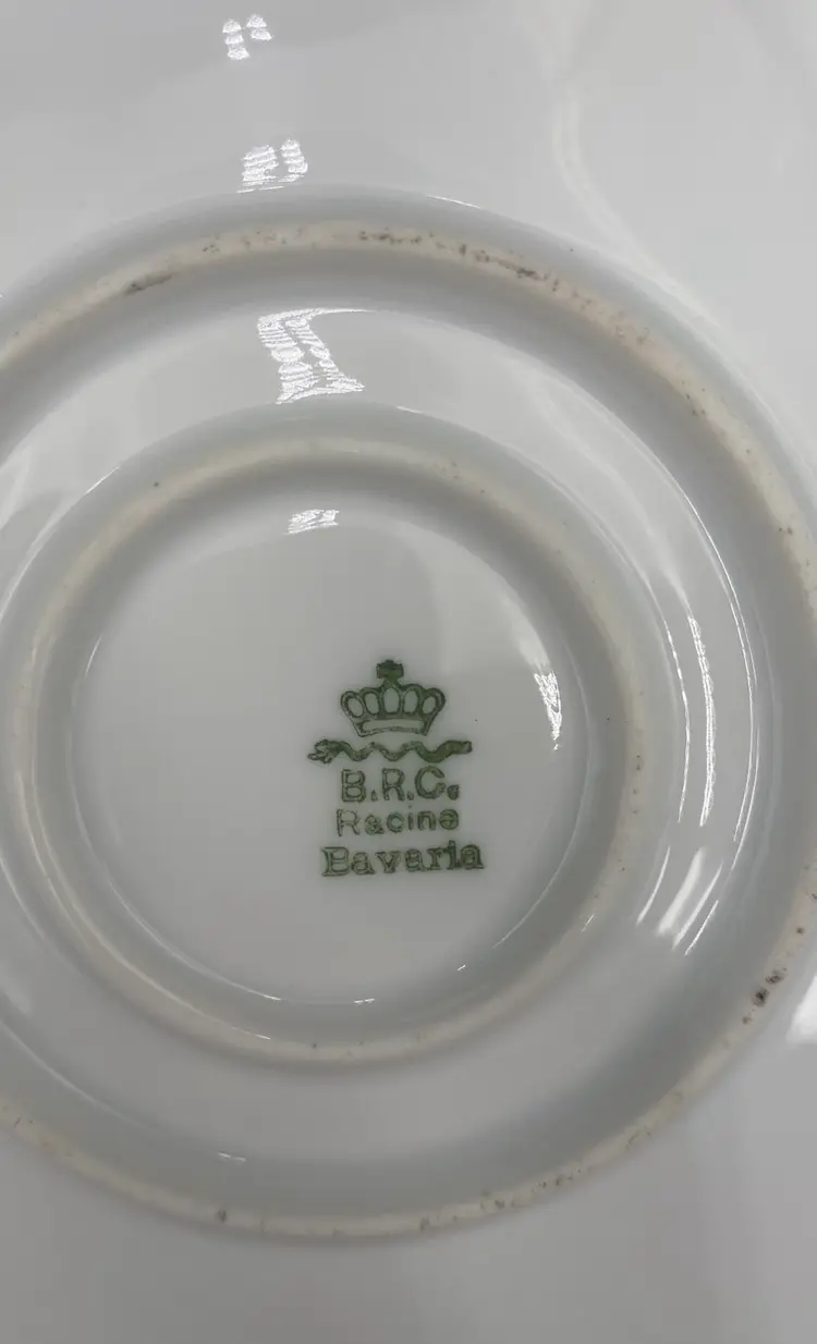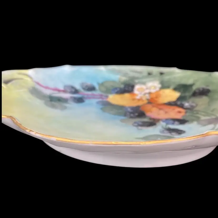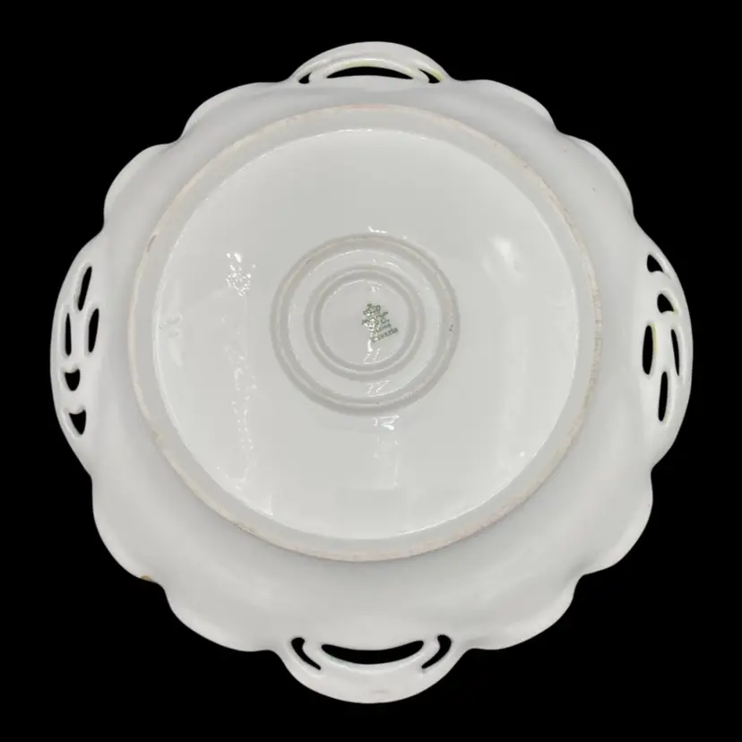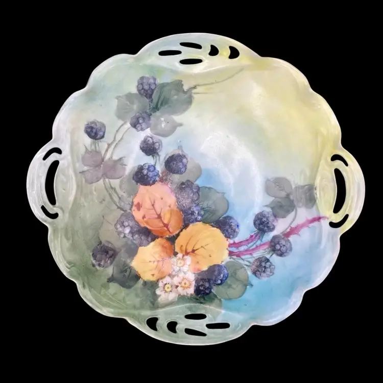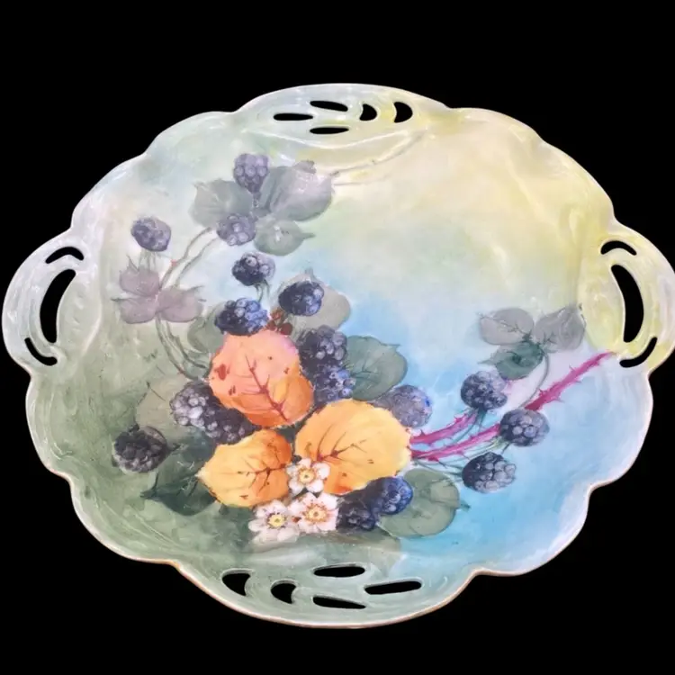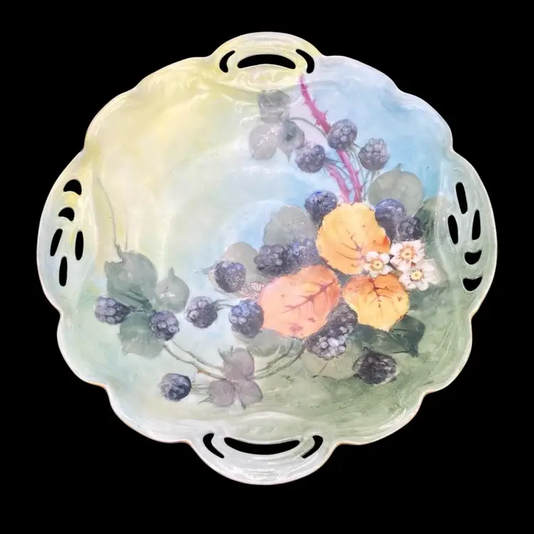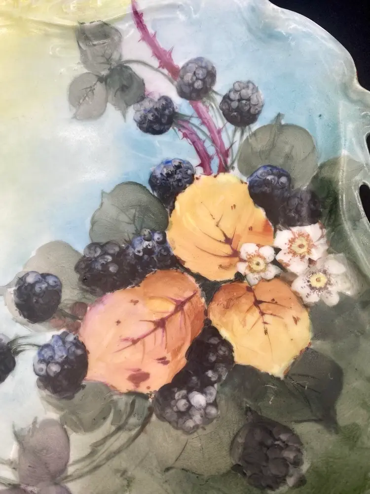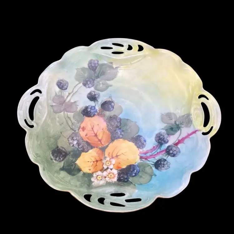 This stunning antique platter from BRC (Bauer, Rosenthal & Co.) features a beautiful hand-painted Racine pattern with a theme of blackberries. Made of high-quality porcelain, this platter has a round shape with reticulated edges, gold rims, and a lovely matte finish. It was manufactured in Bavaria between 1897-1903, making it a rare and valuable antique item. With a length of 11.50 inches, a width of 10.75 inches, and a height of 1.75 inches, this platter is perfect for serving your favorite dishes or displaying as a decorative piece. Its beautiful colors and printed backstamp add to its charm and authenticity.