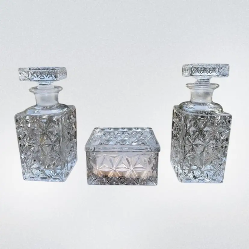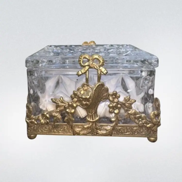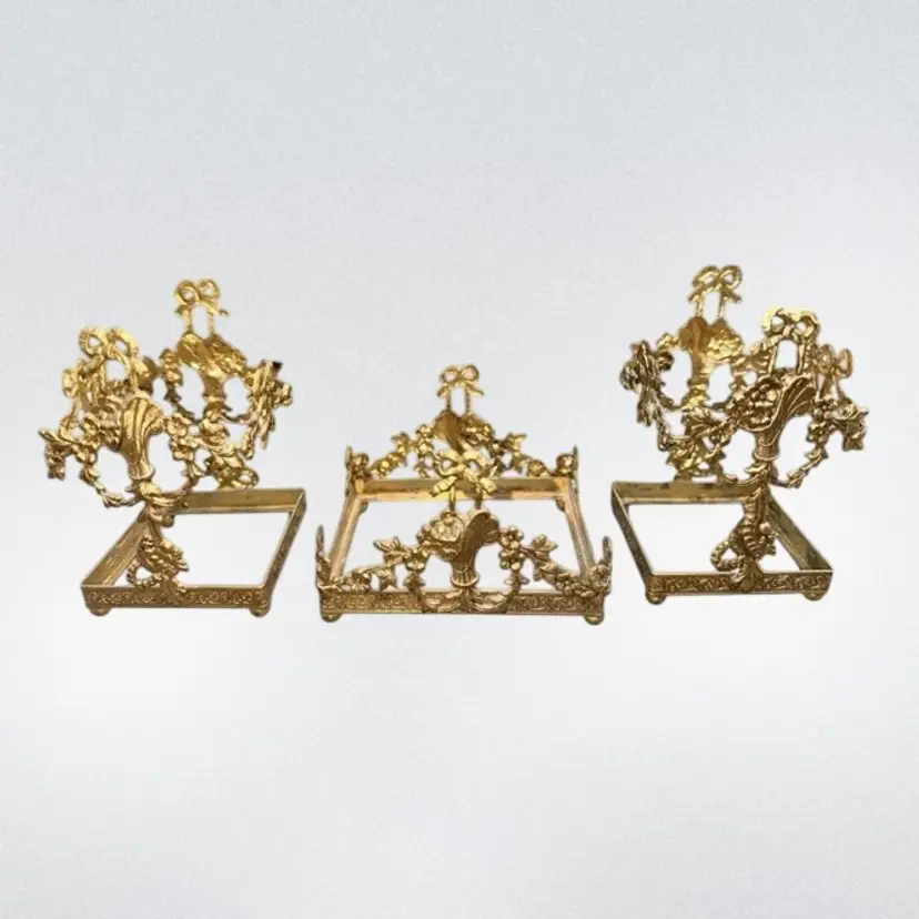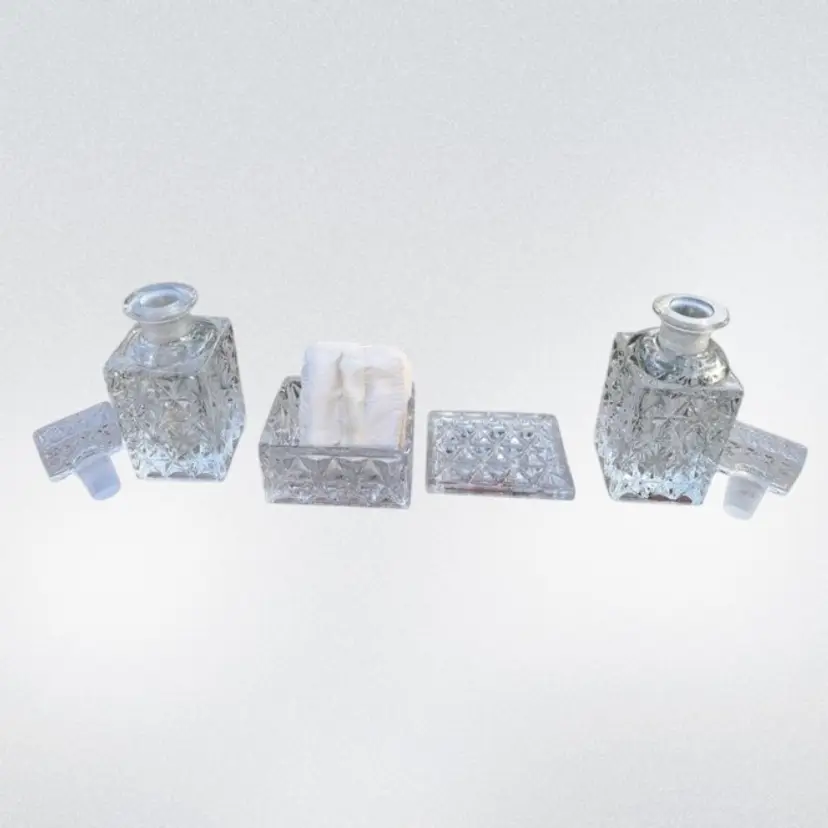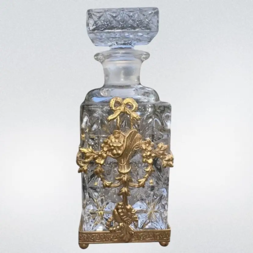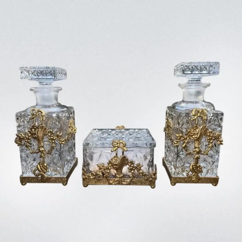 Absolutely stunning 3 pc ANTIQUE BRONZE ORMOLU FILIGREE PERFUME BOTTLES & POWDER JAR APOLLO DORE FLOWER BASKET Includes 2 perfume bottles and a Powder jar including poof Fantastic condition with no chips, or cracks. There are no chips on the inside dauber either. Inside of stand each perfume bottle measures 6 inches tall by 2 1/4 in.² Powder jar measures almost 2 1/2 inches tall by 3 1/2 inches by just under 3 inches