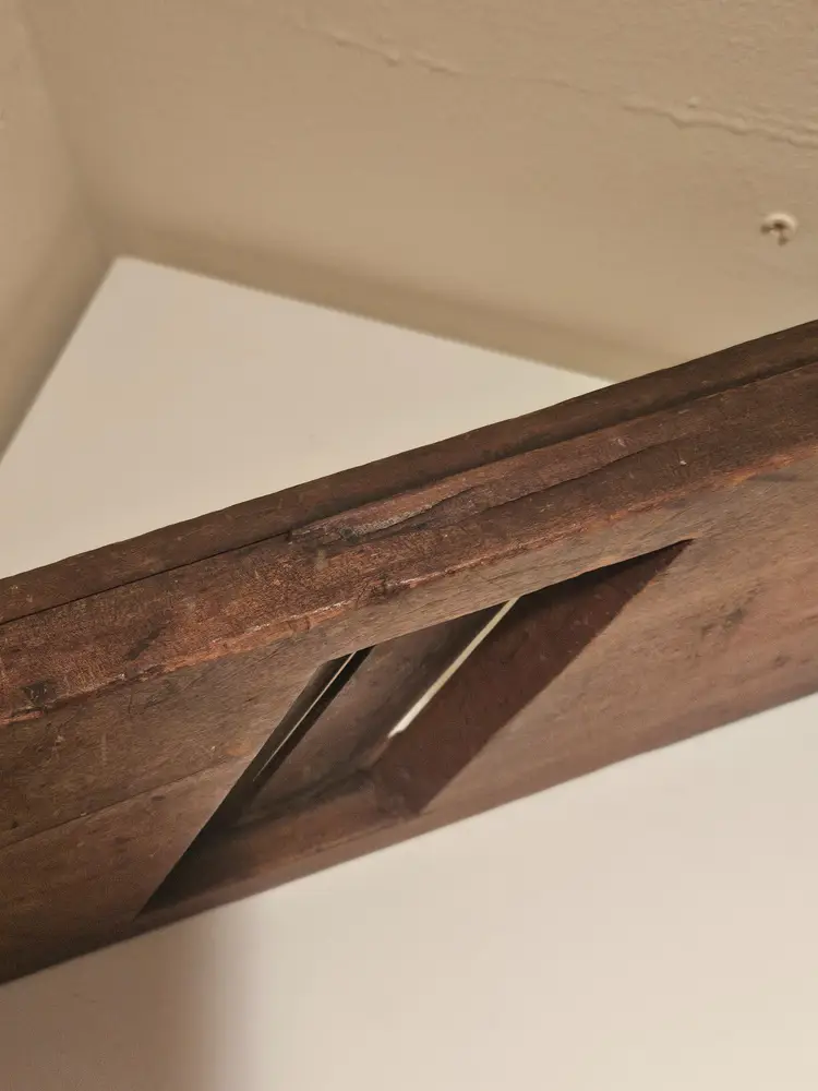 Feet at bottom are worn uneven, so it stands crooked. Hanging hole at top. SEE PICTURES of condition due to age. Blades are rusted-this is for DECOR ONLY.