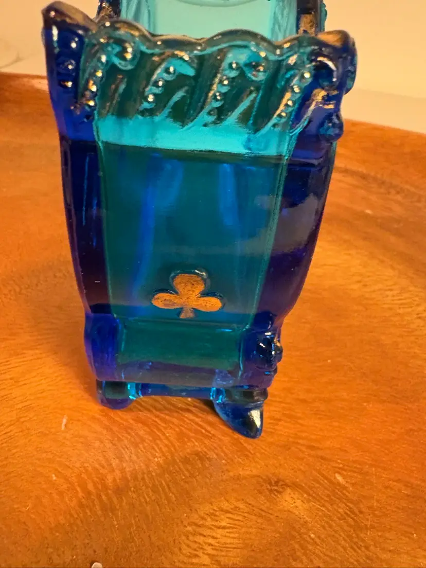 This is an antique piece for your card table. It was a souvenir. This has shown wear on the paint however, the glass is in excellent condition. 3.75” tall x 3” wide x 1.75” deep standard size card deck 11.5oz