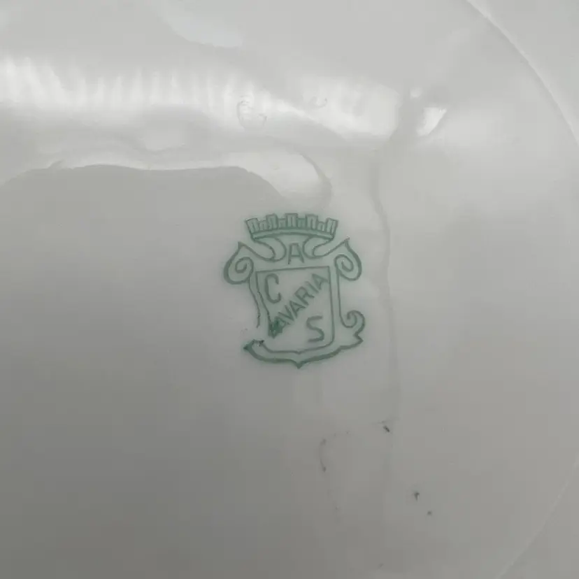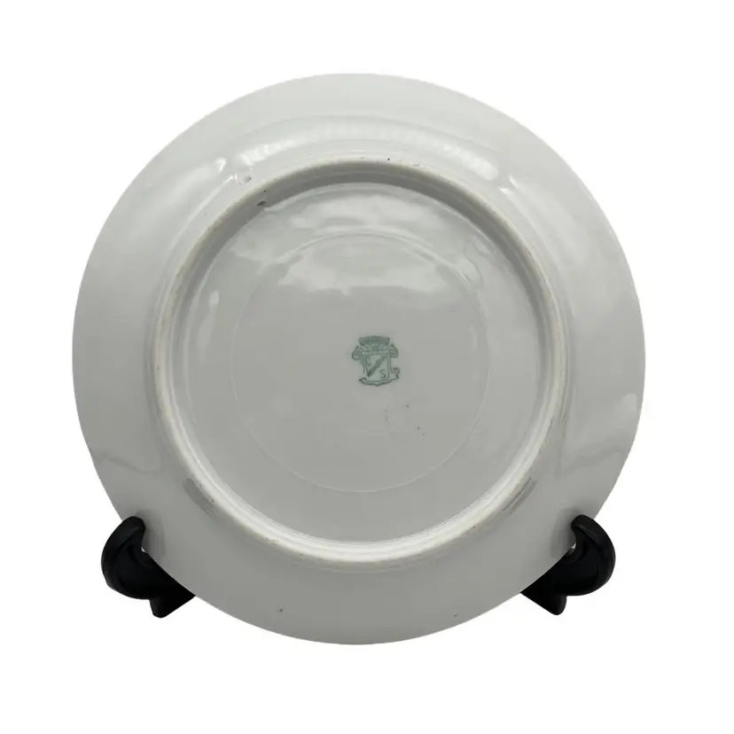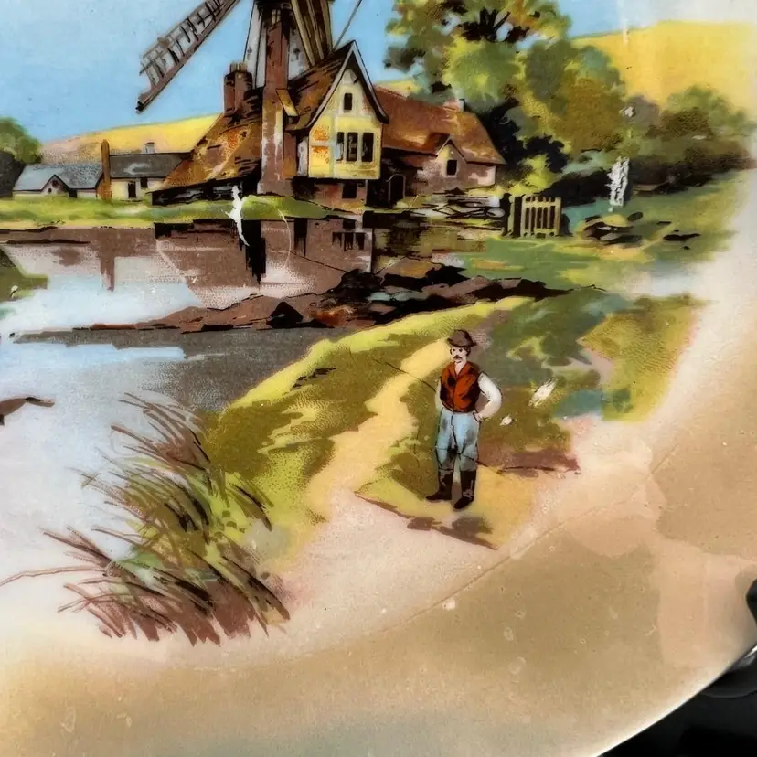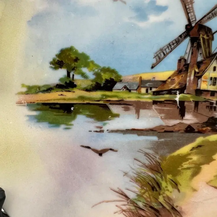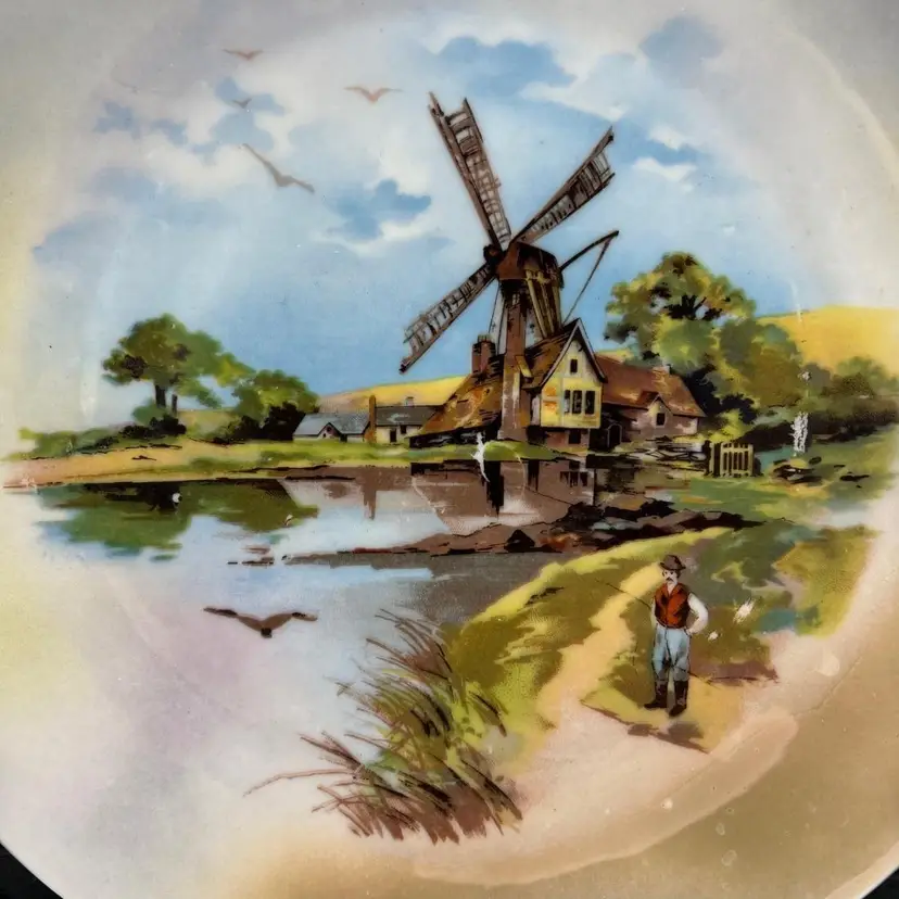 Antique Carl Schumann collectible plate featuring a windmill. It is from sometime from the late 1800s to the early 1900s based on the design of the back stamp. The plate measures approximately 8 1/4" across.