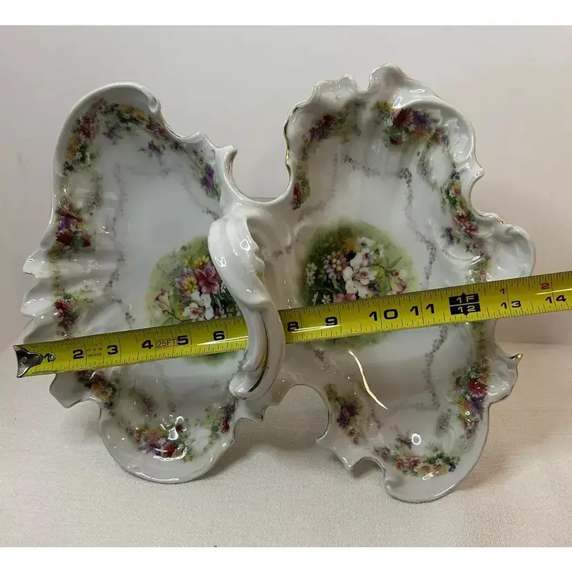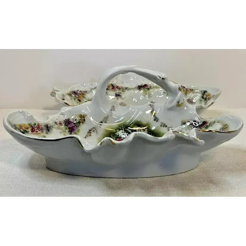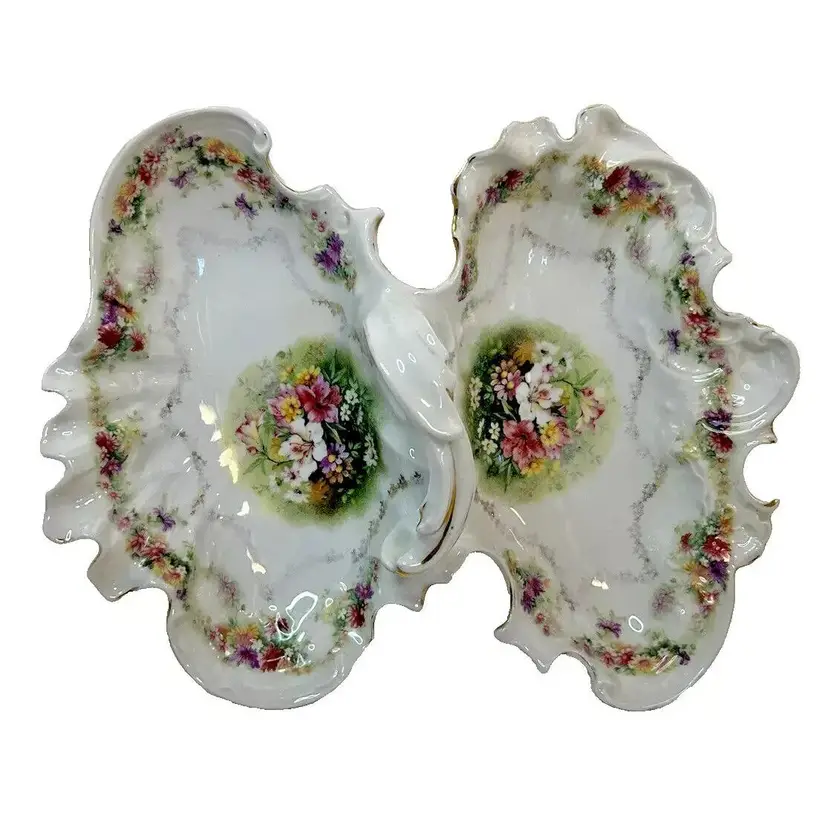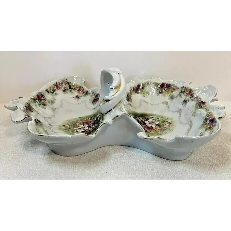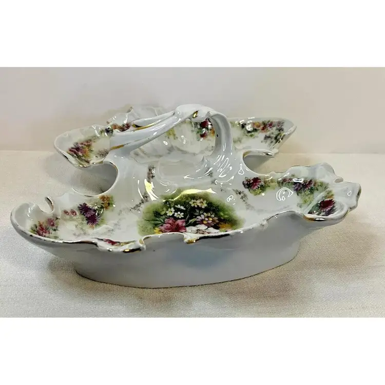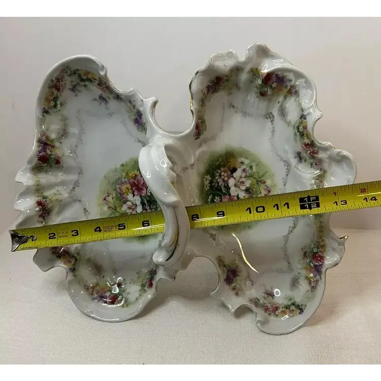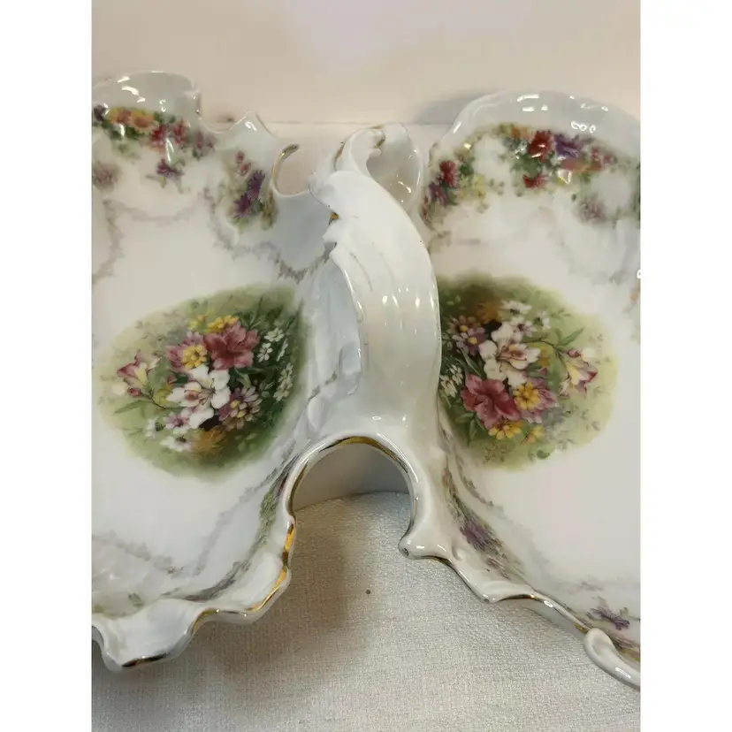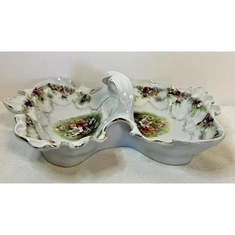 This beautiful antique Carl Tielsch "C.T." German Porcelain Divided Handle Serving Dish hails from the 1910's and is decorated with white, yellow and deep purples florals surrounded with gold florals and trim throughout with gold gilding. The piece is marked with the "Eagle~C.T.~Germany" and it is numbered as well, which helps to identify the authenticity of this wonderful piece. This is a beautiful piece that is quite unique and hard to find. This is a substantial piece which measures 13.5" wide x 11" long x4.5" tall (handle), please see pictures for confirmation of measurements. This Antique Carl Tielsch "C.T." German Porcelain Divided Handle Serving Dish is in excellent condition, with NO chips, cracks, crazing or repairs. It does however have some loss of paint and gold gilding, which is consistent with its antique age.