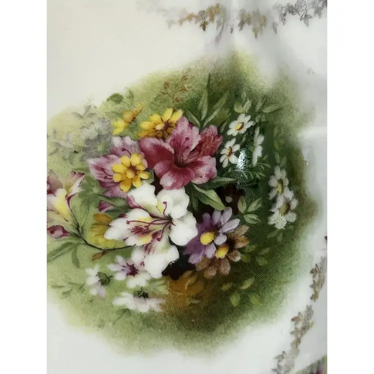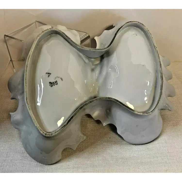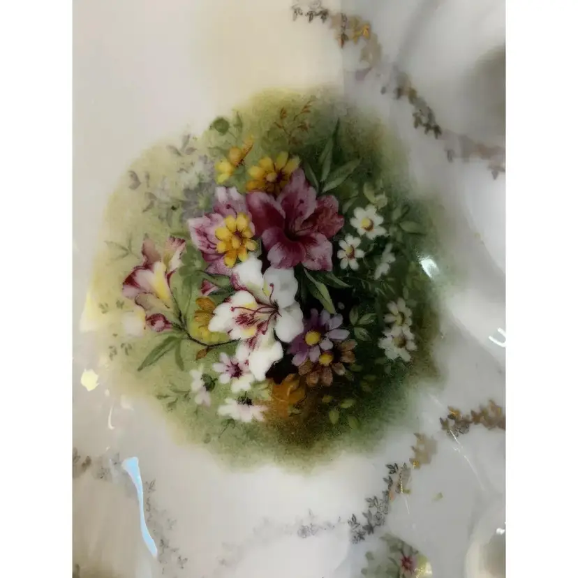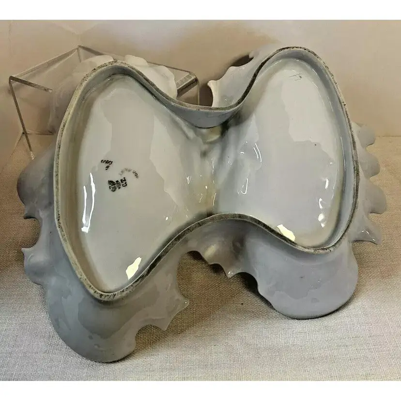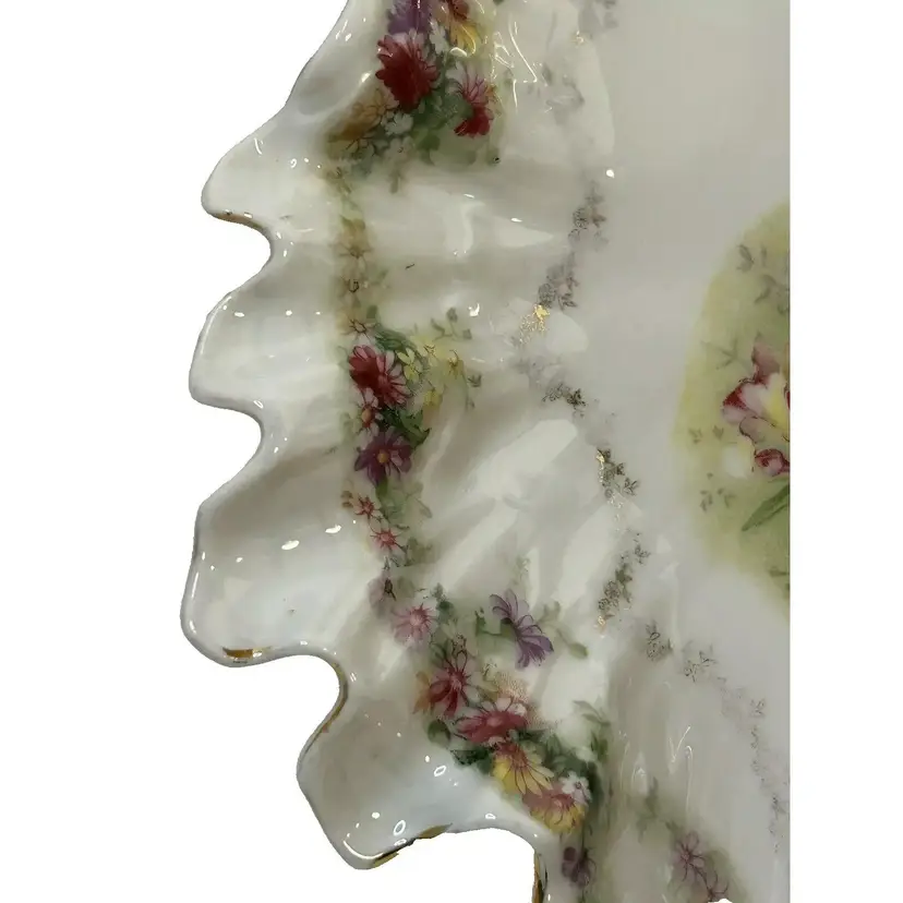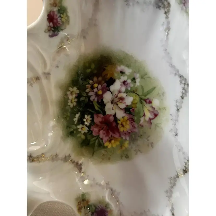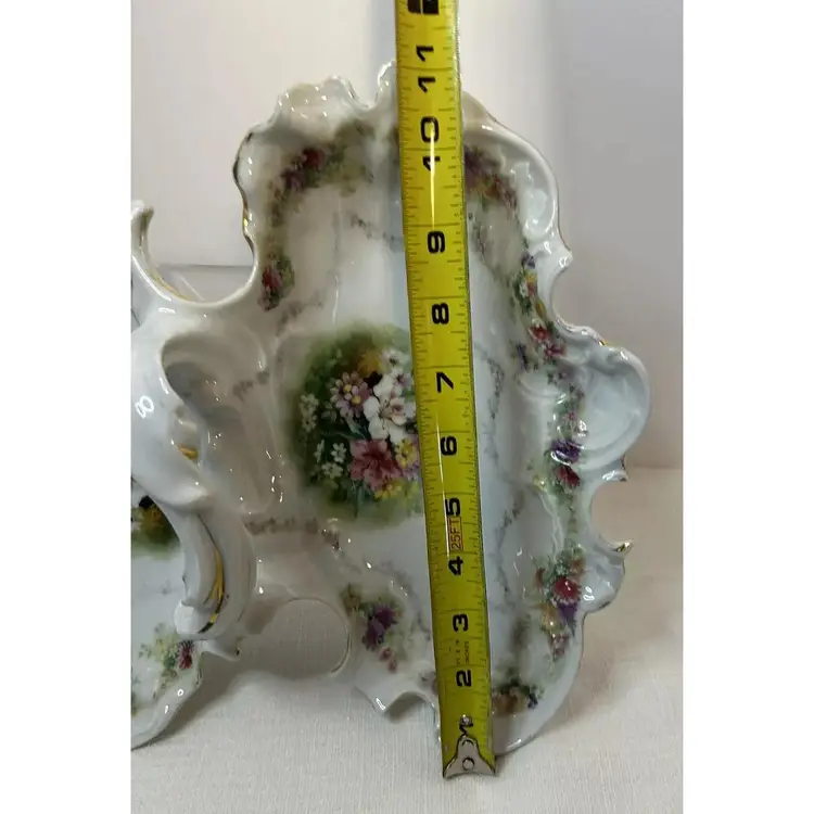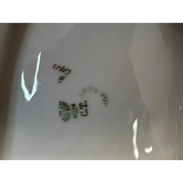This beautiful antique Carl Tielsch "C.T." German Porcelain Divided Handle Serving Dish hails from the 1910's and is decorated with white, yellow and deep purples florals surrounded with gold florals and trim throughout with gold gilding. The piece is marked with the "Eagle~C.T.~Germany" and it is numbered as well, which helps to identify the authenticity of this wonderful piece. This is a beautiful piece that is quite unique and hard to find. This is a substantial piece which measures 13.5" wide x 11" long x4.5" tall (handle), please see pictures for confirmation of measurements. This Antique Carl Tielsch "C.T." German Porcelain Divided Handle Serving Dish is in excellent condition, with NO chips, cracks, crazing or repairs. It does however have some loss of paint and gold gilding, which is consistent with its antique age.