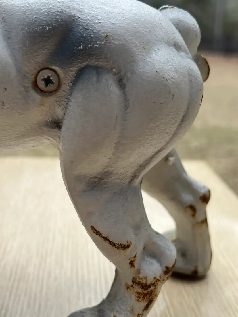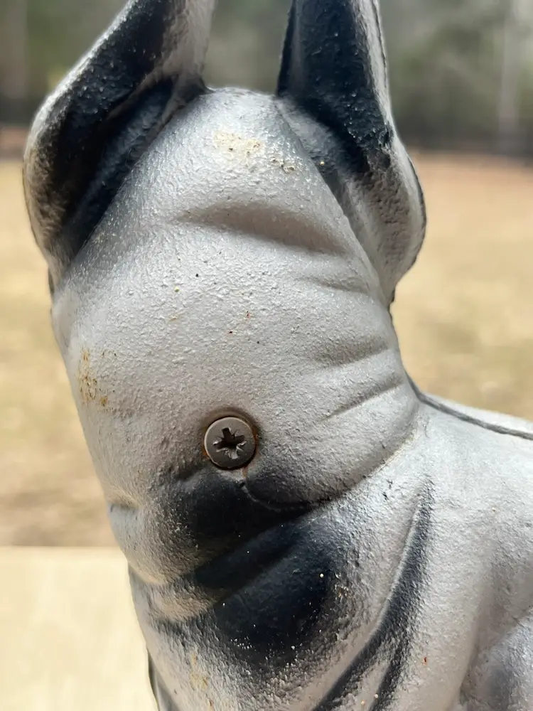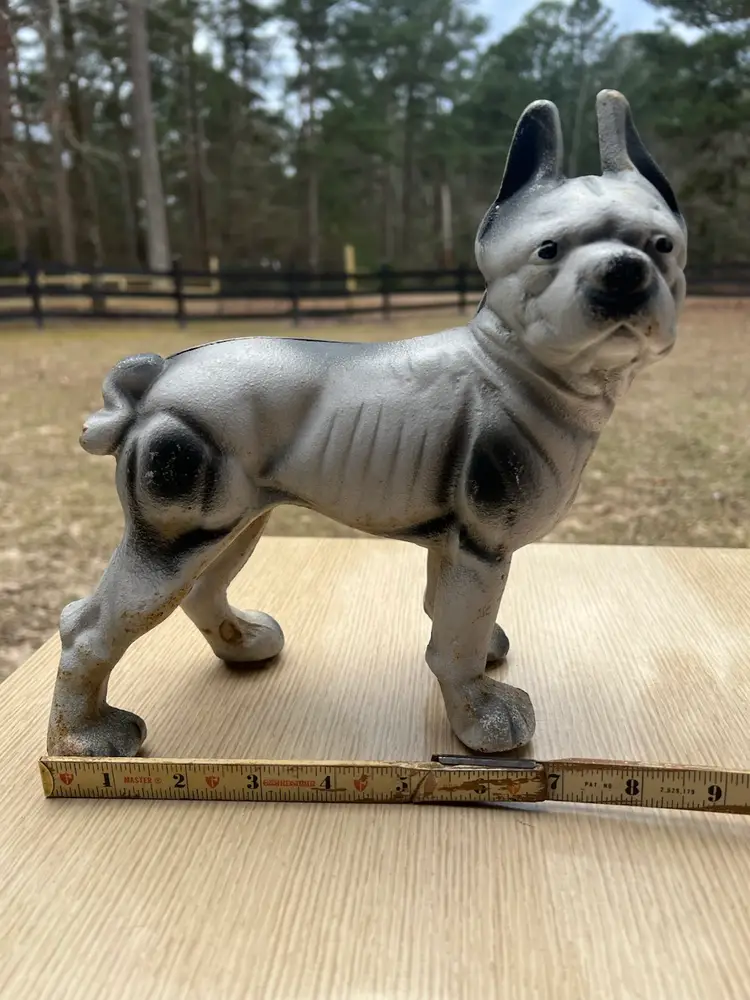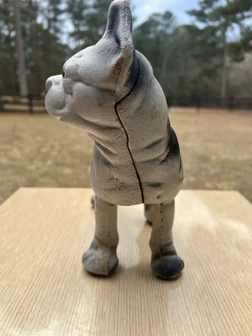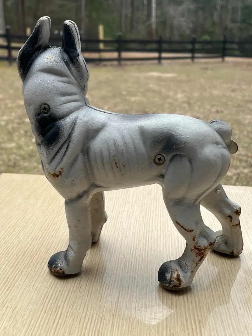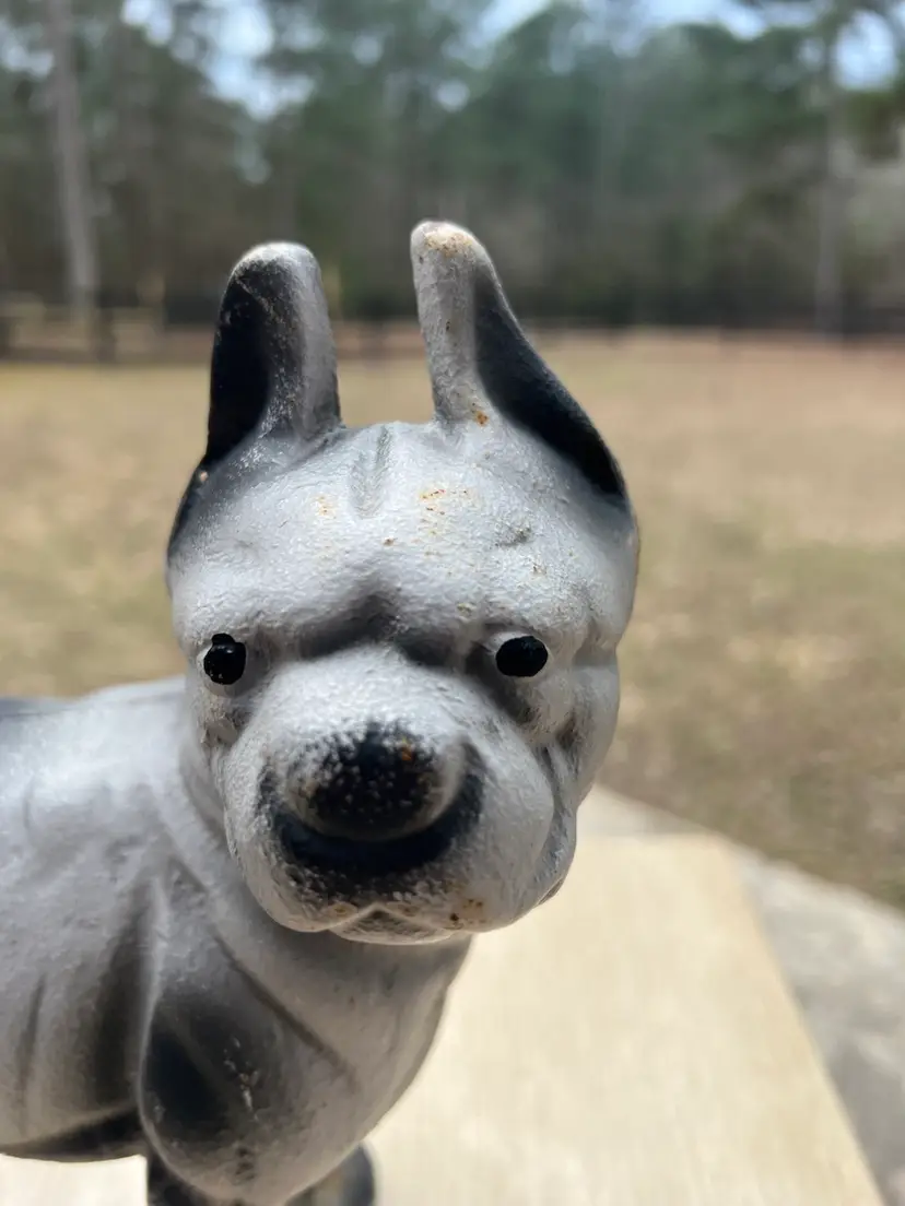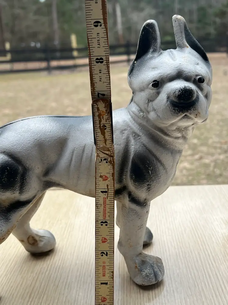 This antique door stop features a Boston Terrier bull dog design, crafted from cast iron in the United States. The material used ensures durability and adds a vintage touch to any space. This collectible piece would be a charming and functional addition to a home or office, serving as both a decorative accent and a practical door stop.
