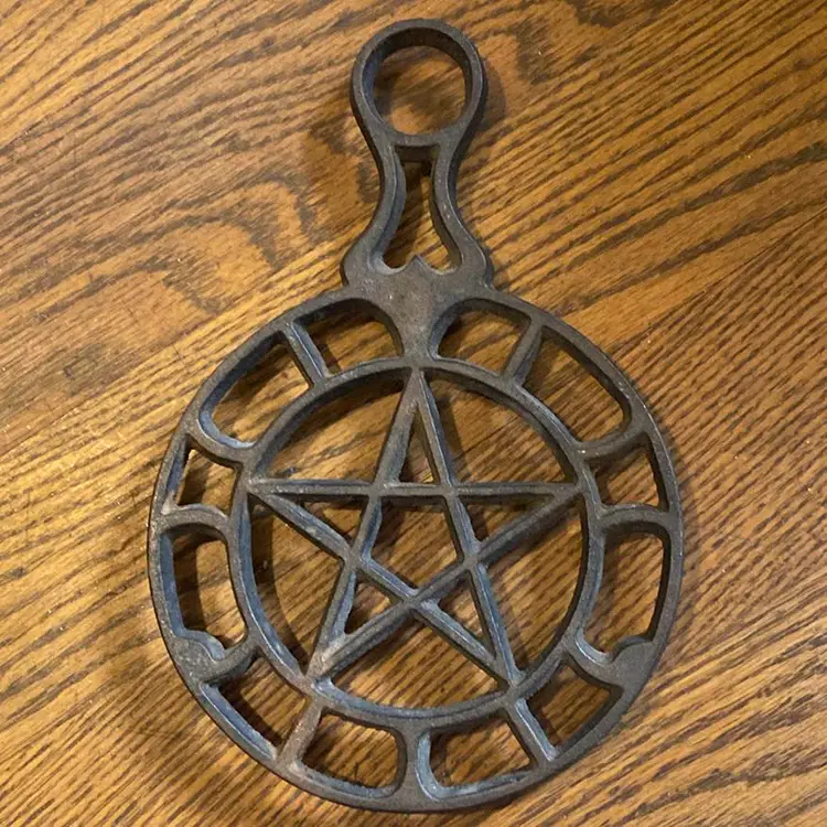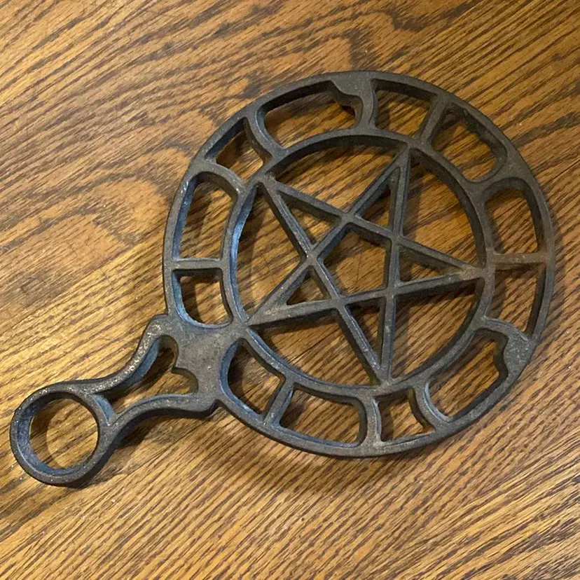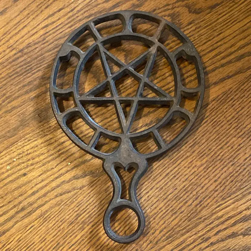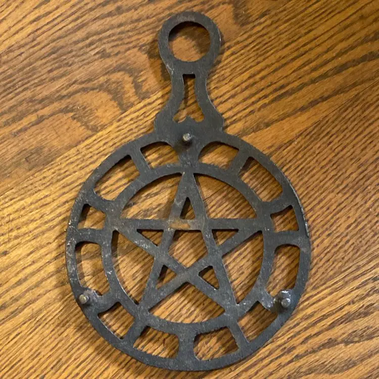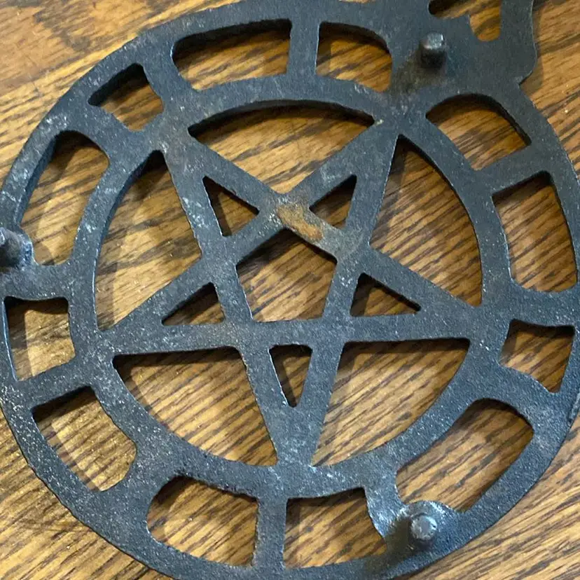 Really cool antique cast iron 5 pointed start pentagram trivet. Perfect for anyone that loves stars and antiques alike. Good condition, does show some mild rusting in spots like it needs coated in oil/ preserved again. No cracks or damage. Thanks!