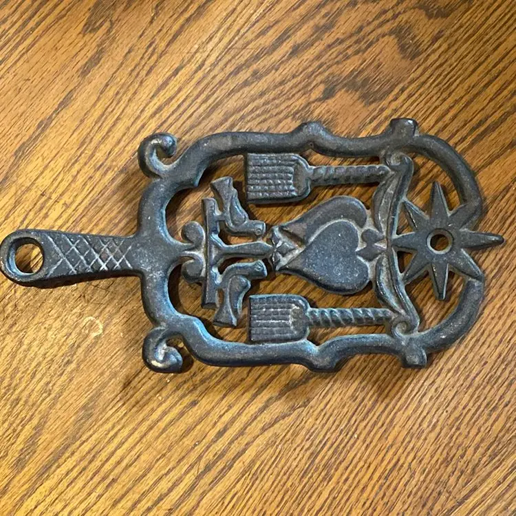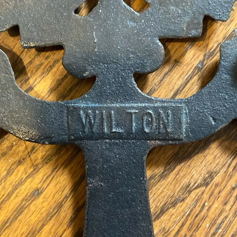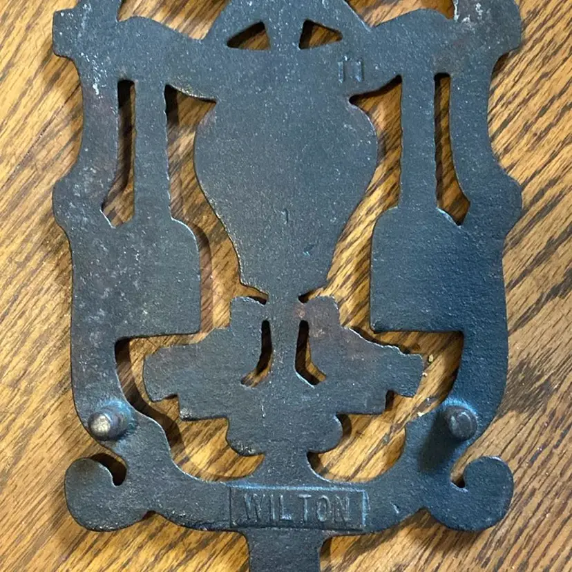 Really neat cast iron Wilton trivet with hearts, birds, brooms and sun. Stamped Wilton on the back with little 11 and 1. very cool piece. Perfect for farmhouse decor or anyone that collects antique trivets. Good condition no cracks. Thanks!