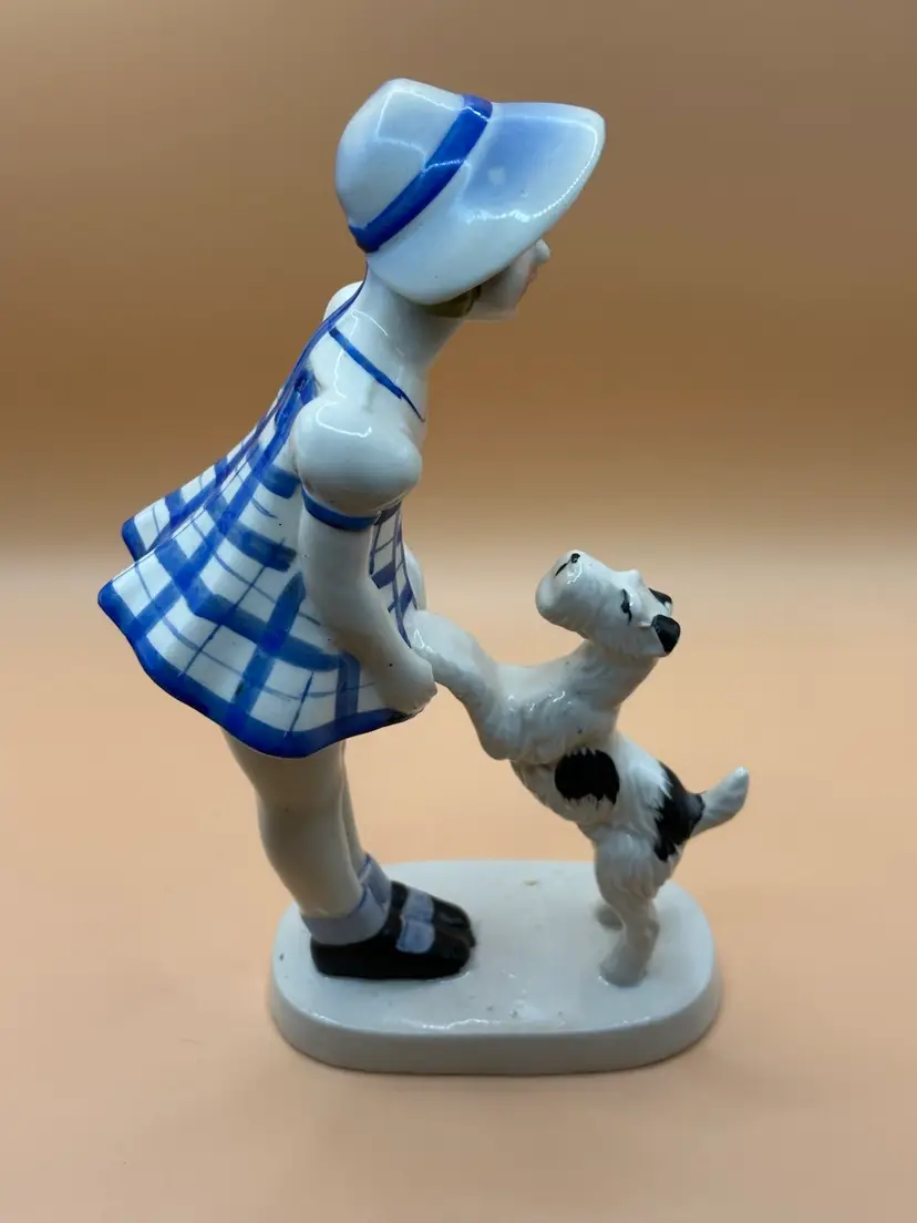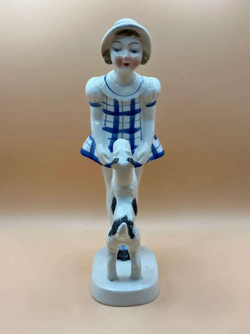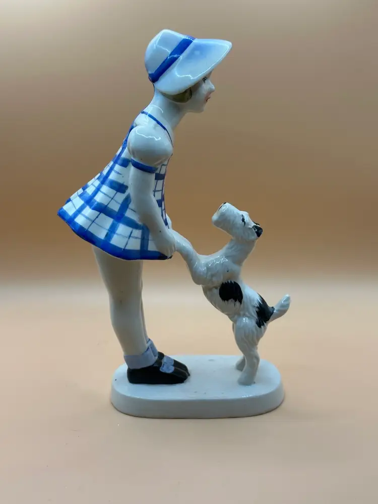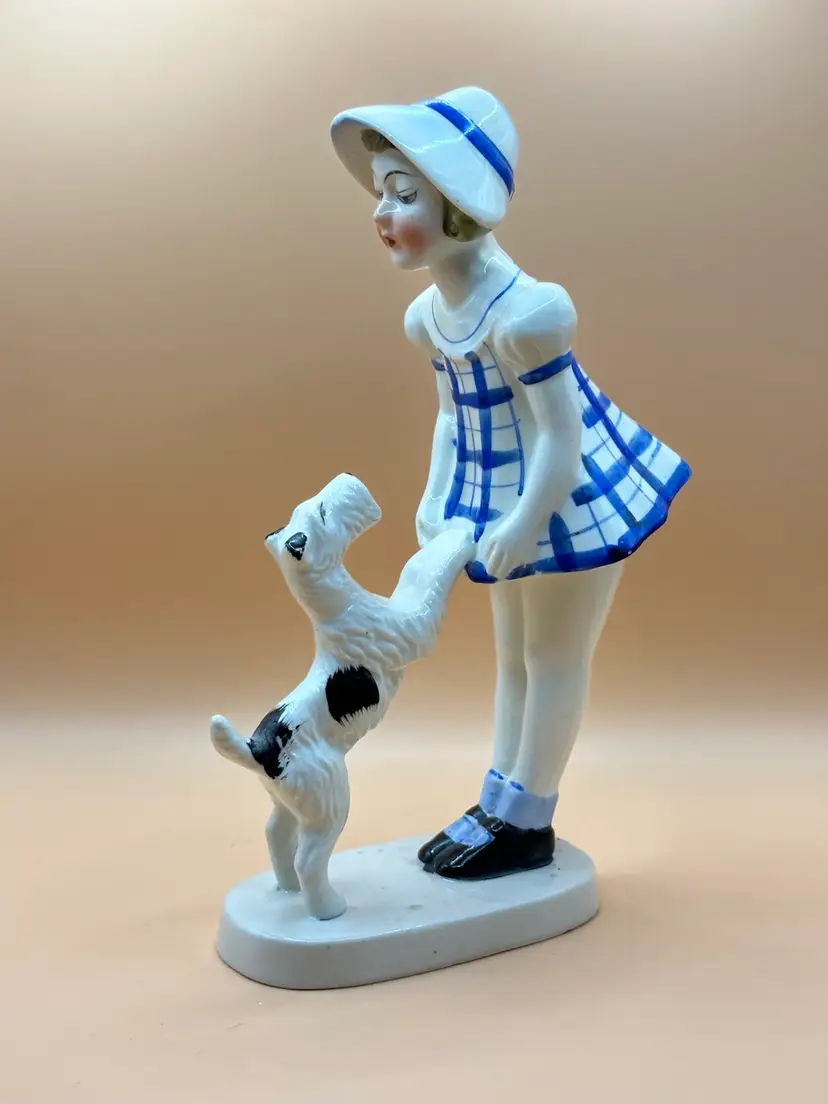 This antique ceramic figurine features a young girl in a blue dress with a terrier dog jumping up towards her. The Art Deco style and hand-painted details make it a charming piece for all occasions. This original figurine, made in Japan in the 1940s, stands at 8 inches tall and showcases a nostalgic theme with a touch of whimsy, perfect for collectors of animals and figurines. Beautiful piece no chips or cracks.