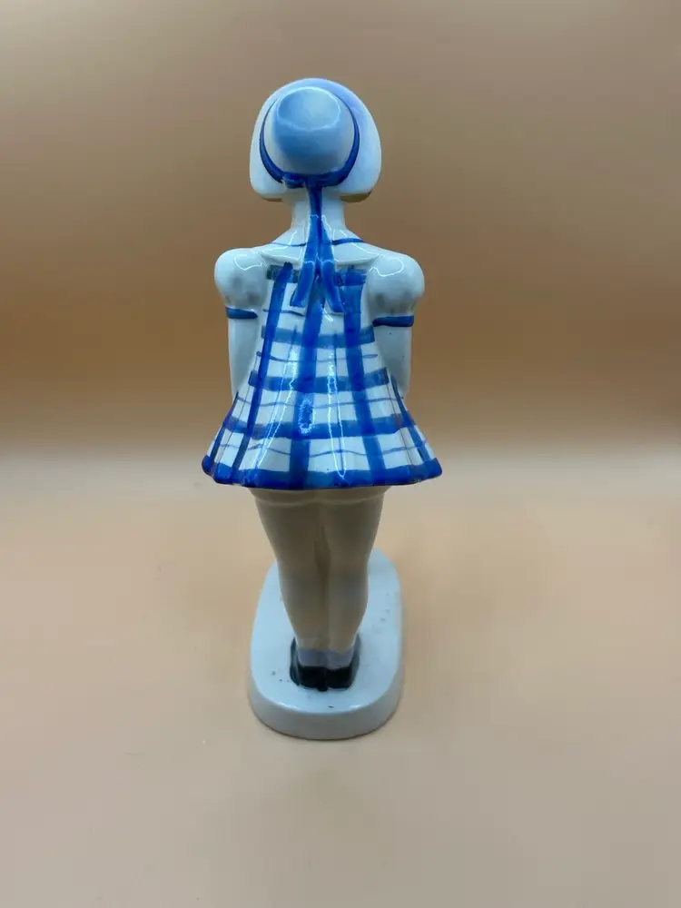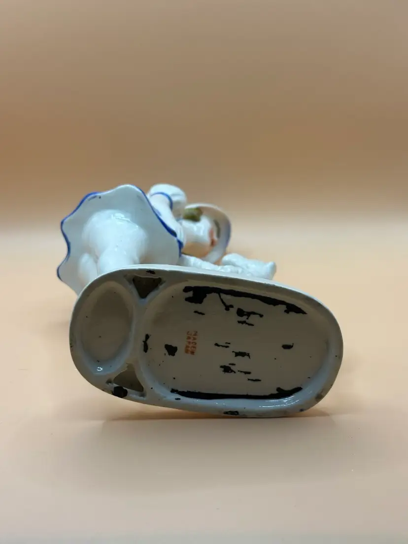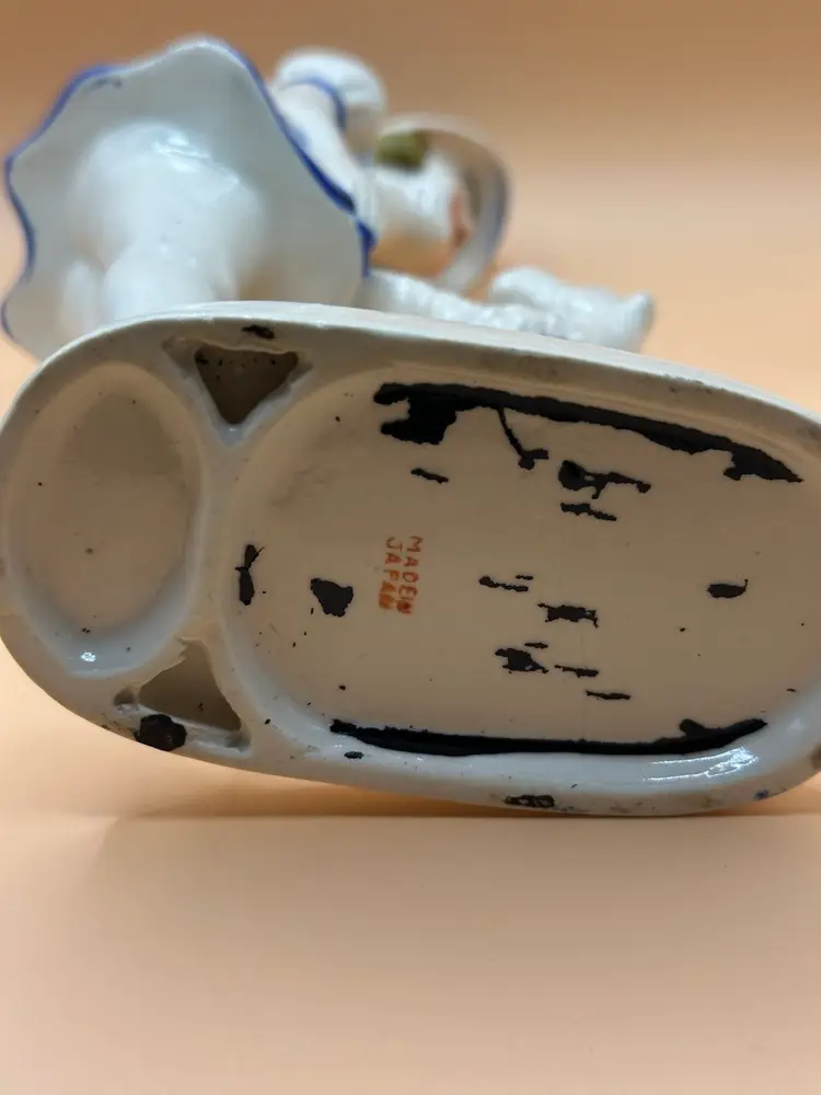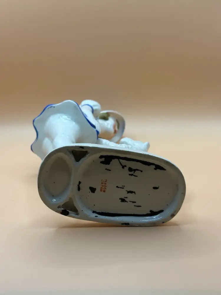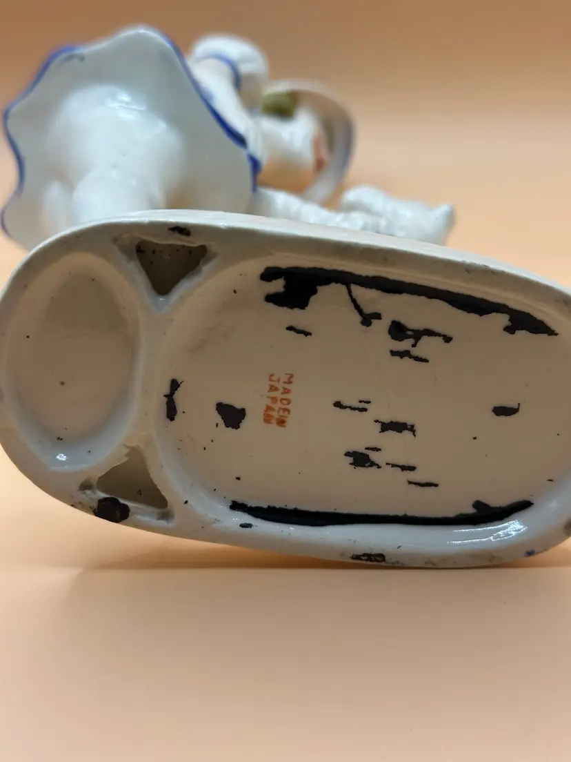 This antique ceramic figurine features a young girl in a blue dress with a terrier dog jumping up towards her. The Art Deco style and hand-painted details make it a charming piece for all occasions. This original figurine, made in Japan in the 1940s, stands at 8 inches tall and showcases a nostalgic theme with a touch of whimsy, perfect for collectors of animals and figurines. Beautiful piece no chips or cracks.