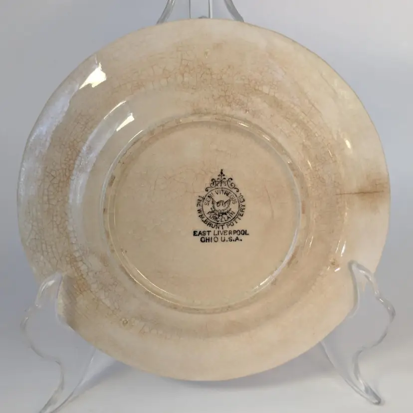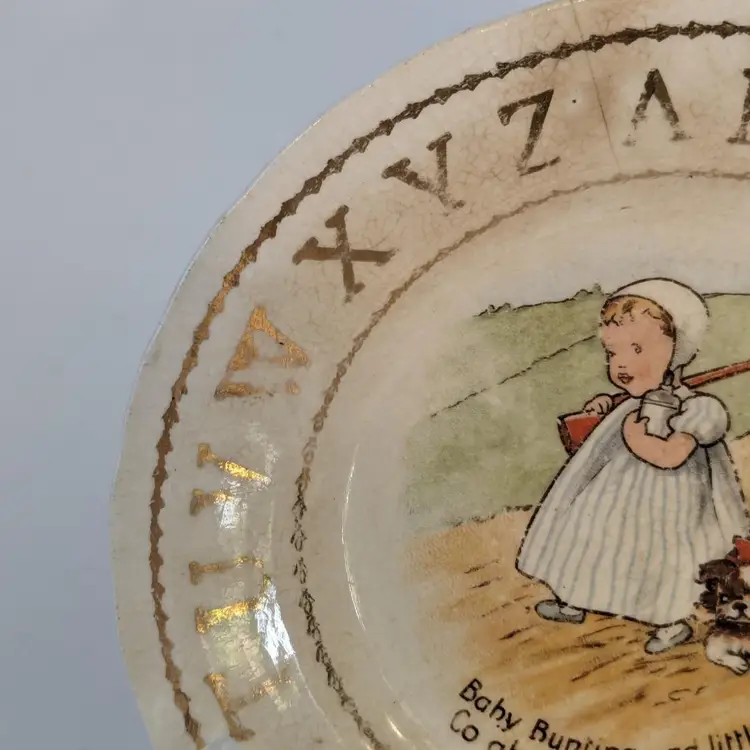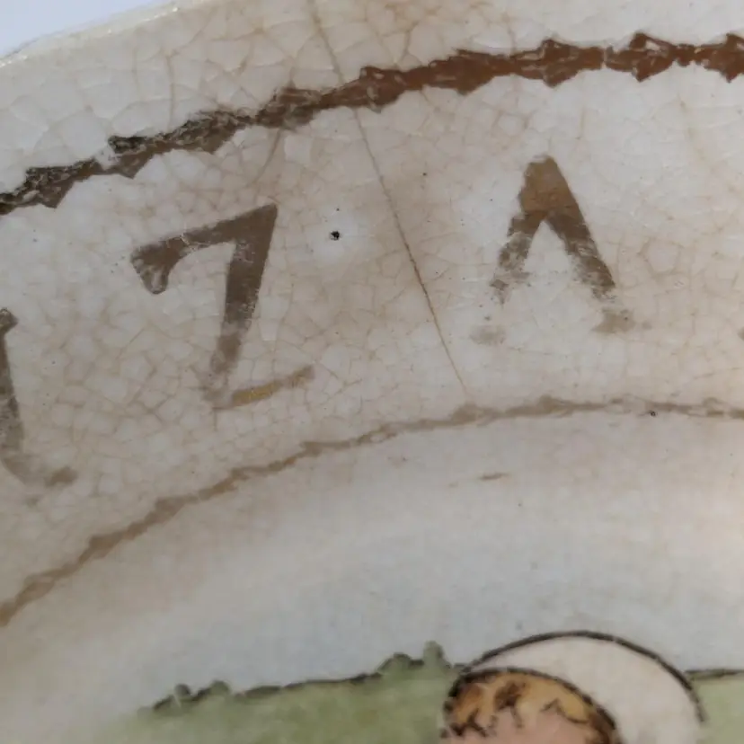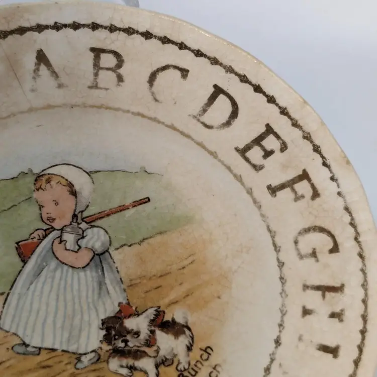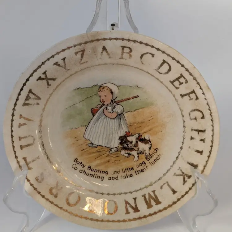 Charming old child's plate has age related crazing and wear to the lettering. There is a crack on top of plate, front and back between the A and Z. This defect is depicted in the last two photos. Semi vitreous porcelain. Measures 6 1/4". Made by the WM. Brunt Pottery Company in East Liverpool, Ohio USA Circa 1892-1911.