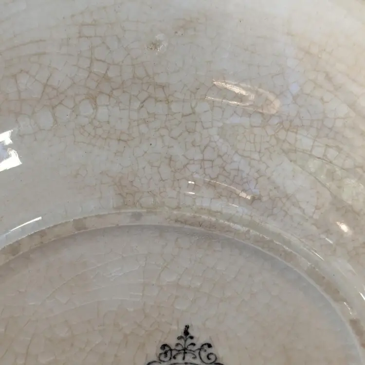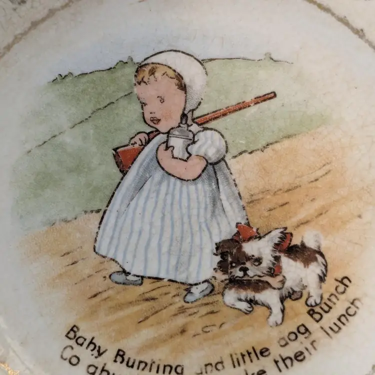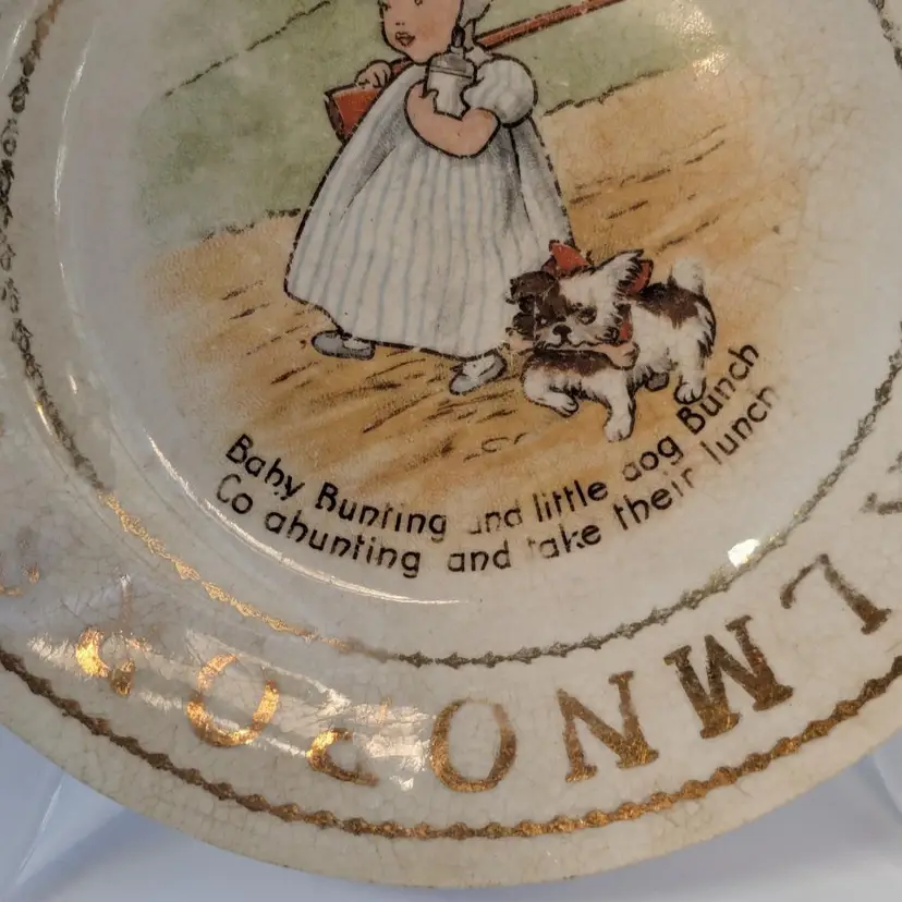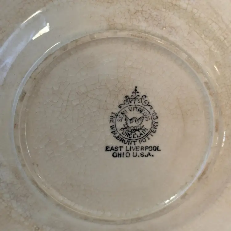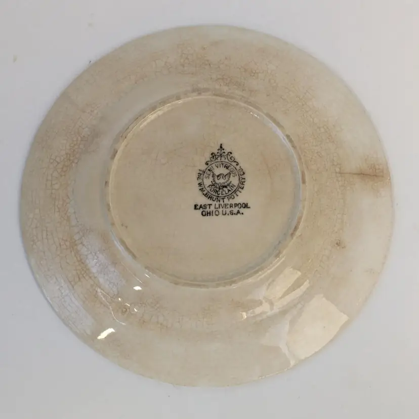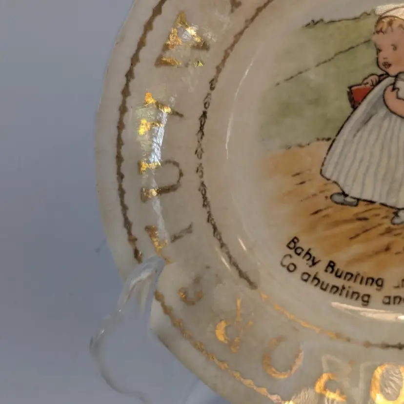 Charming old child's plate has age related crazing and wear to the lettering. There is a crack on top of plate, front and back between the A and Z. This defect is depicted in the last two photos. Semi vitreous porcelain. Measures 6 1/4". Made by the WM. Brunt Pottery Company in East Liverpool, Ohio USA Circa 1892-1911.