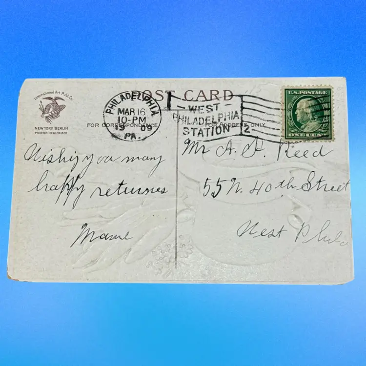 International Art Publishing Co postcard; printed in Germany; ©️1908; posted 1909 (Philadelphia, PA). Postcard has slight vintage wear, incl bottom left corner.