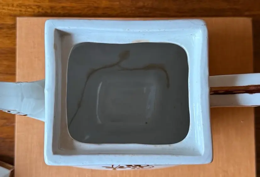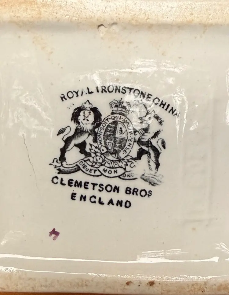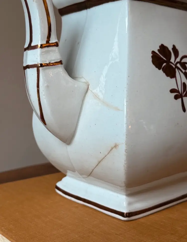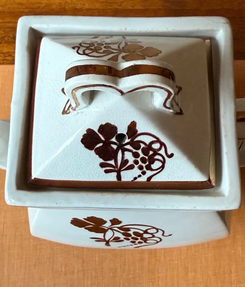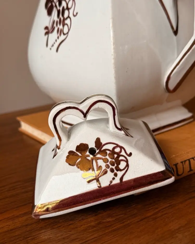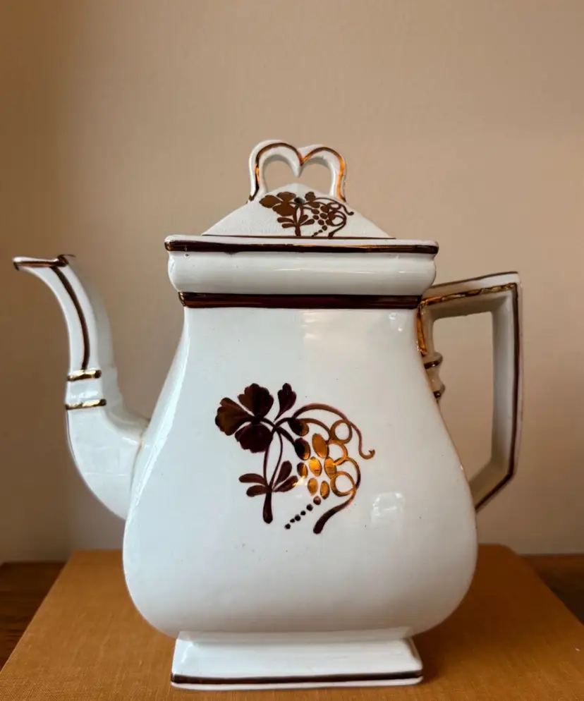 Antique English ironstone coffee pot/teapot by Clementson Bros with a beautiful brown Coffeeberry-style motif and copper/gold lustre accents. Marked on the bottom “Royal Ironstone China – Clementson Bros – England.” Classic square body with matching lid. Approx. 9” tall.