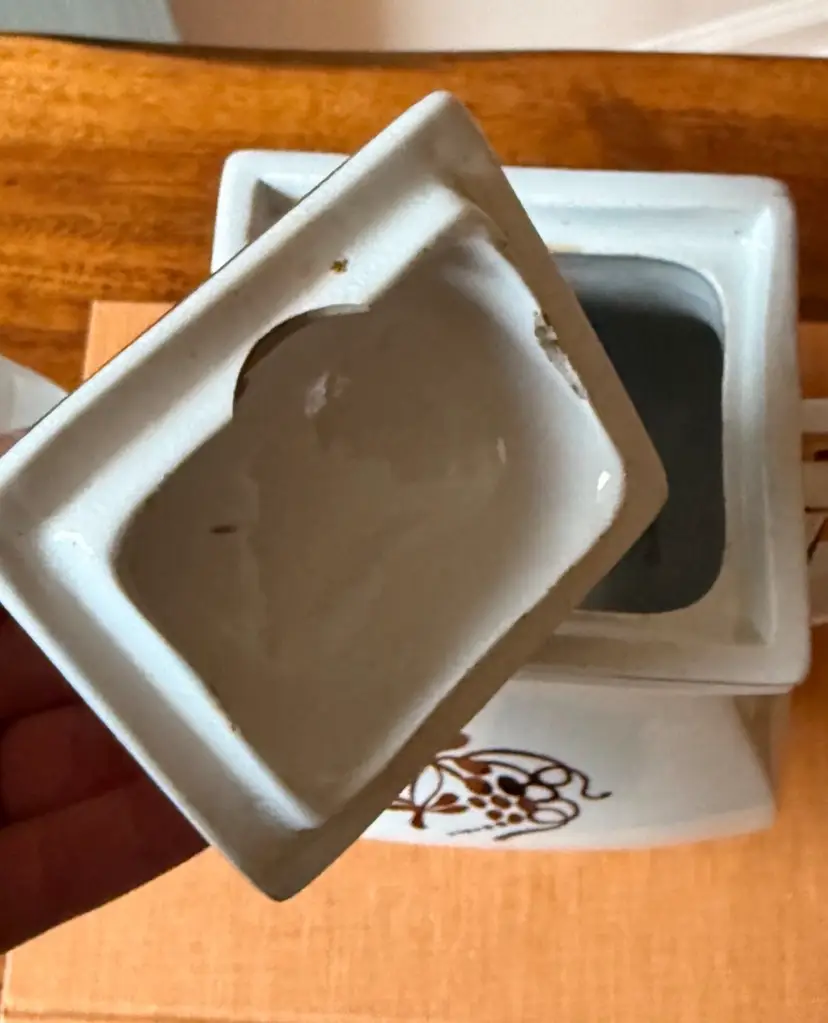 Condition notes: this piece has age-related crazing and staining, and there are hairline cracks and a chip on the underside of the lid(see photos). Because of that, it’s best as a display/collector piece.