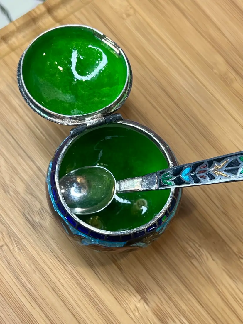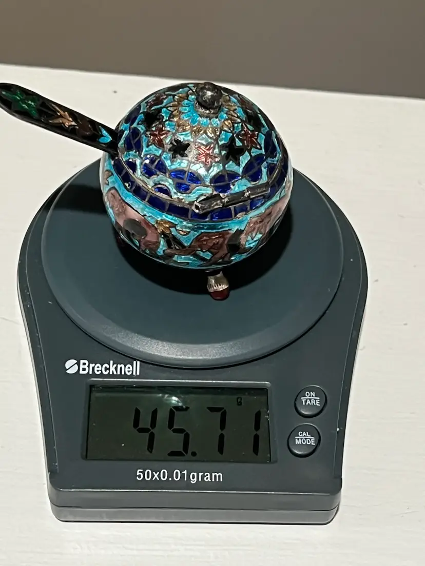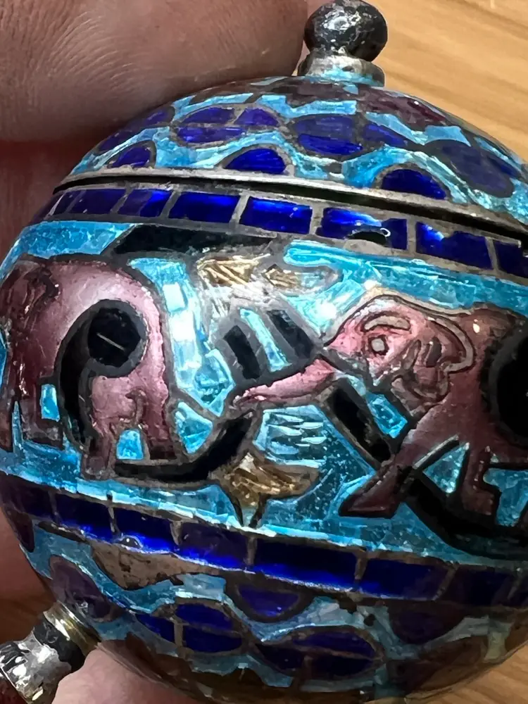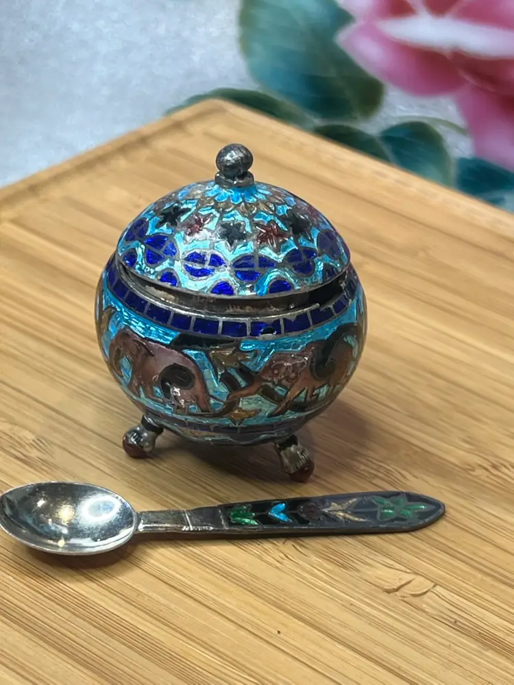 Antique Mughal salt cellar in sterling silver and enamel with elephants. Wonderful condition.