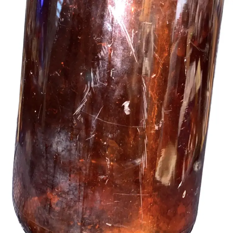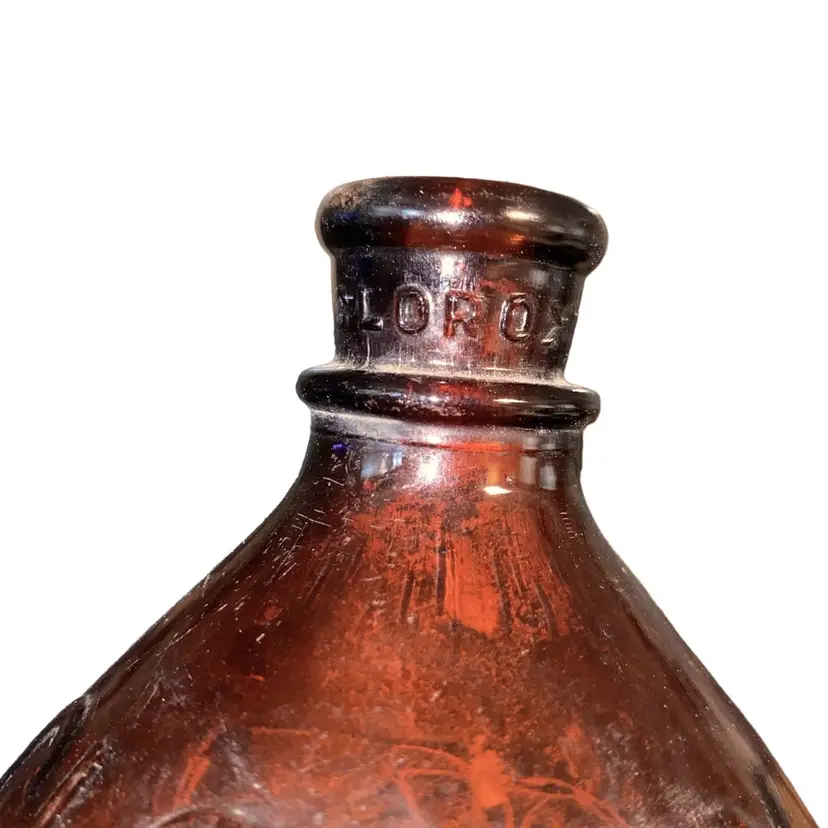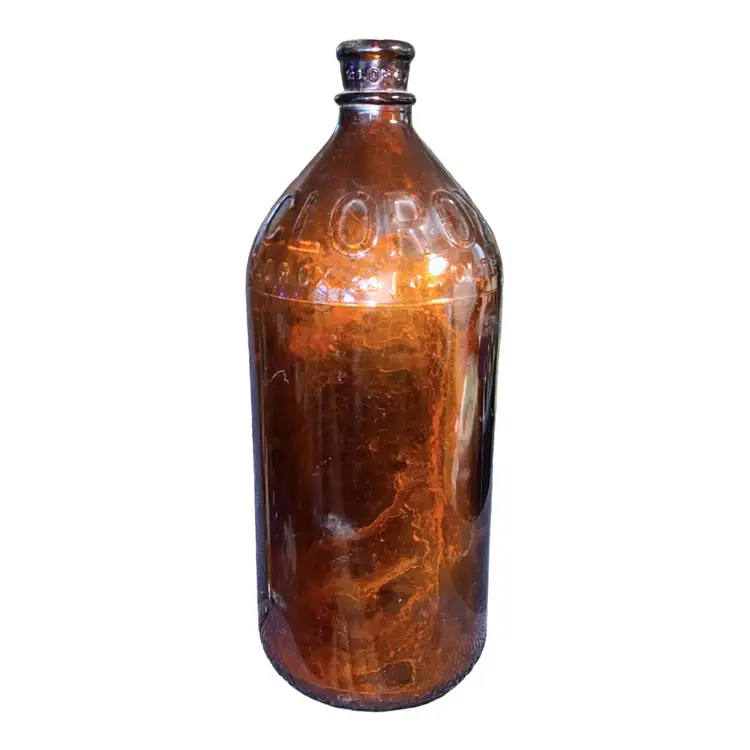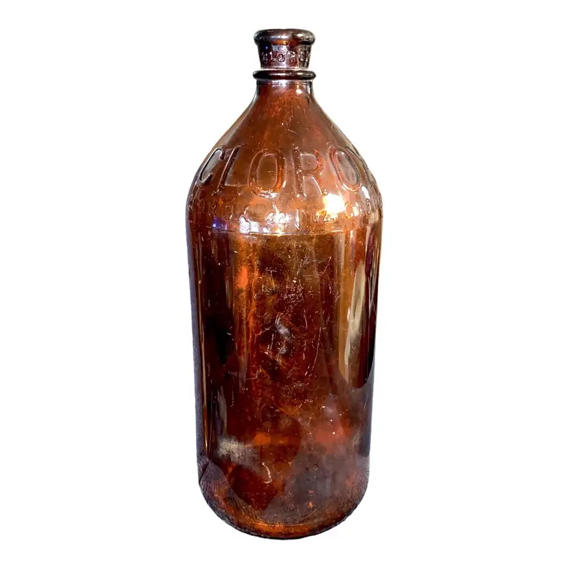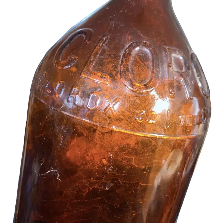 •large brown glass bottle (32 oz) incised “Clorox” throughout, from ~1930s •has some sediment/cloudiness inside and some scratches outside