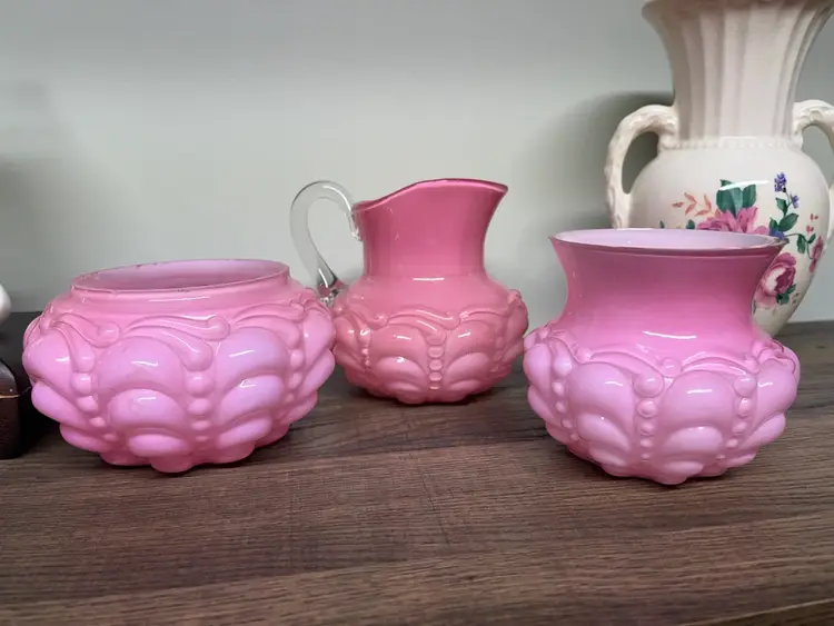 Note crack on pitcher! Still beautiful to have it turned towards the back. Jar is missing lid.