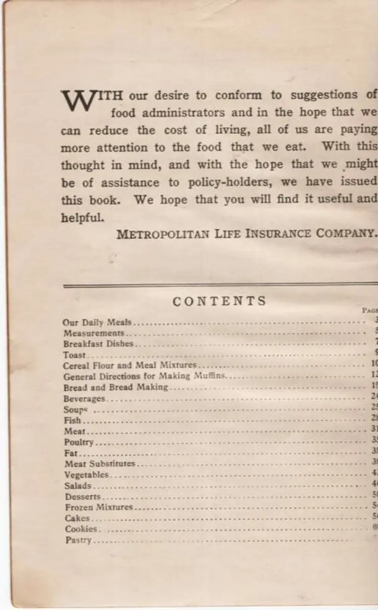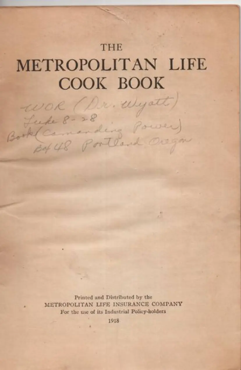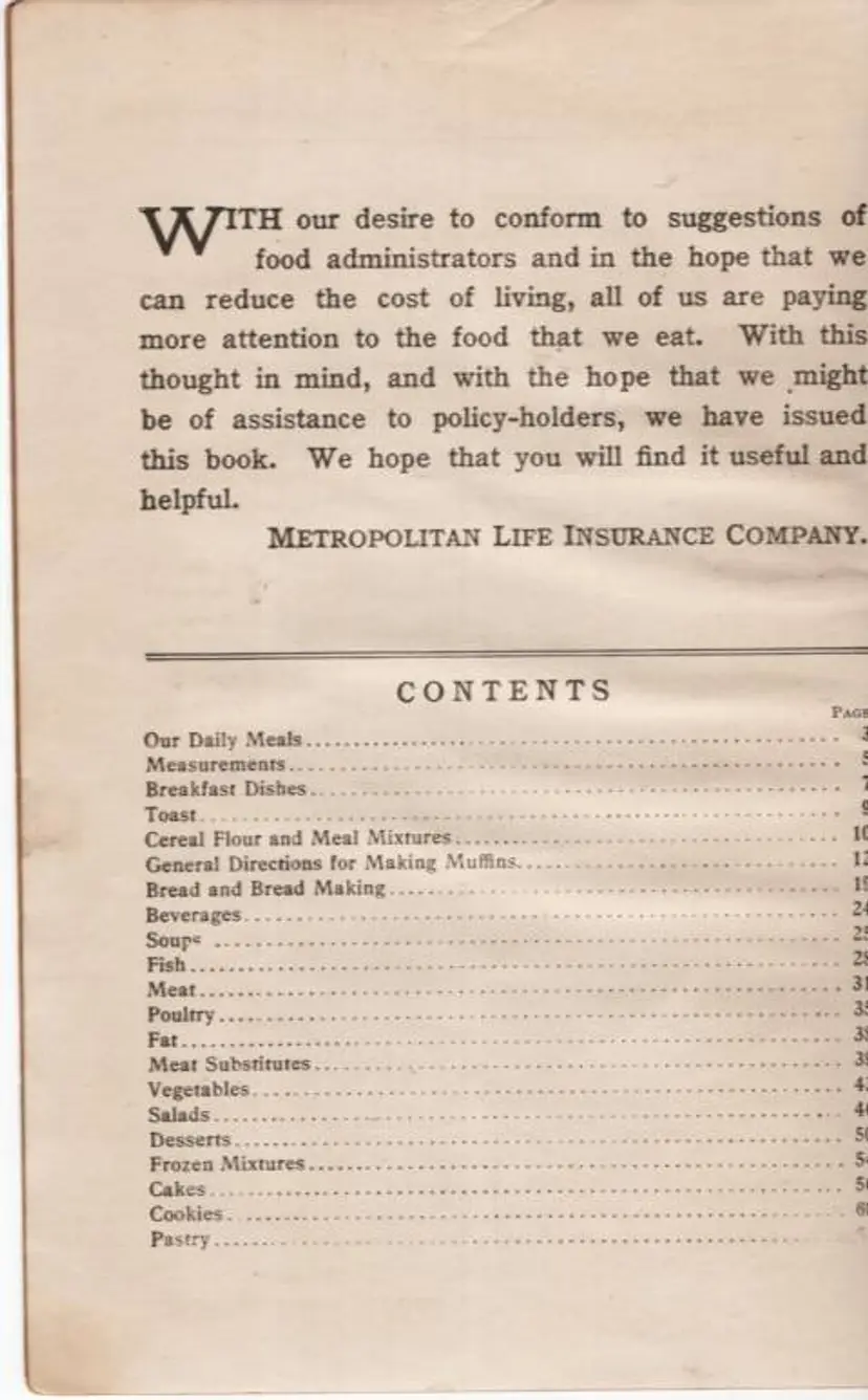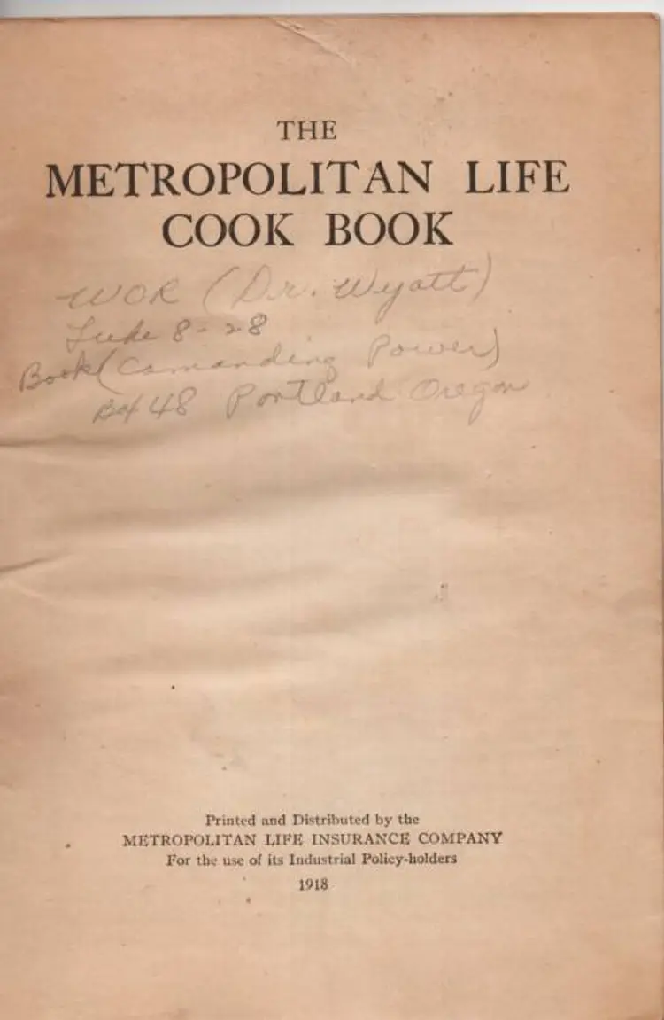 This cookbook was given to policy holders of The Metropolitan Insurance Company. Printed in 1918.