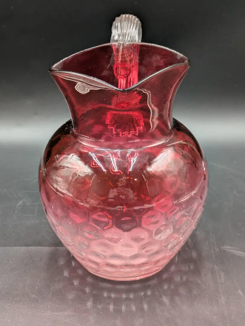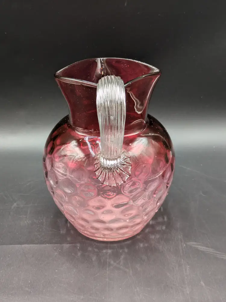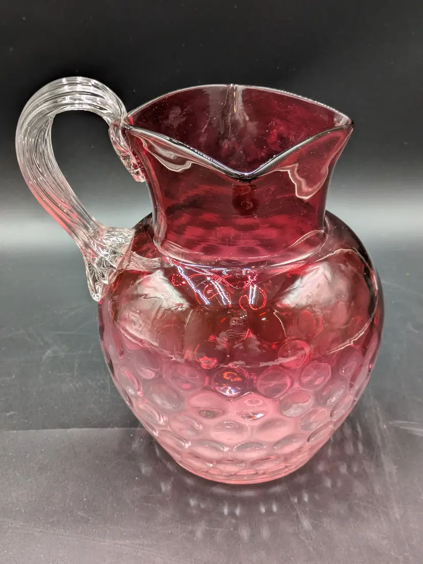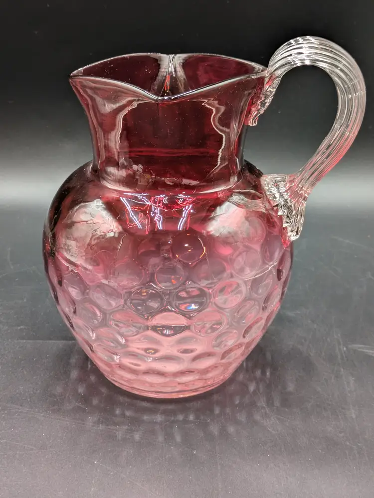 Gorgeous large cranberry glass coin dot pitcher with a unique diamond shaped opening. The color fades to a lovely pink towards the bottom. I'm not sure about the age but I've seen similar dating back to Victorian times. Condition is great with a couple of small flaws (see photos). There is some scuffing on the bottom, but if this piece is as old as Victorian, it's in wonderful shape. 8.5" tall, 4.5" wide, 7" handle to spout.