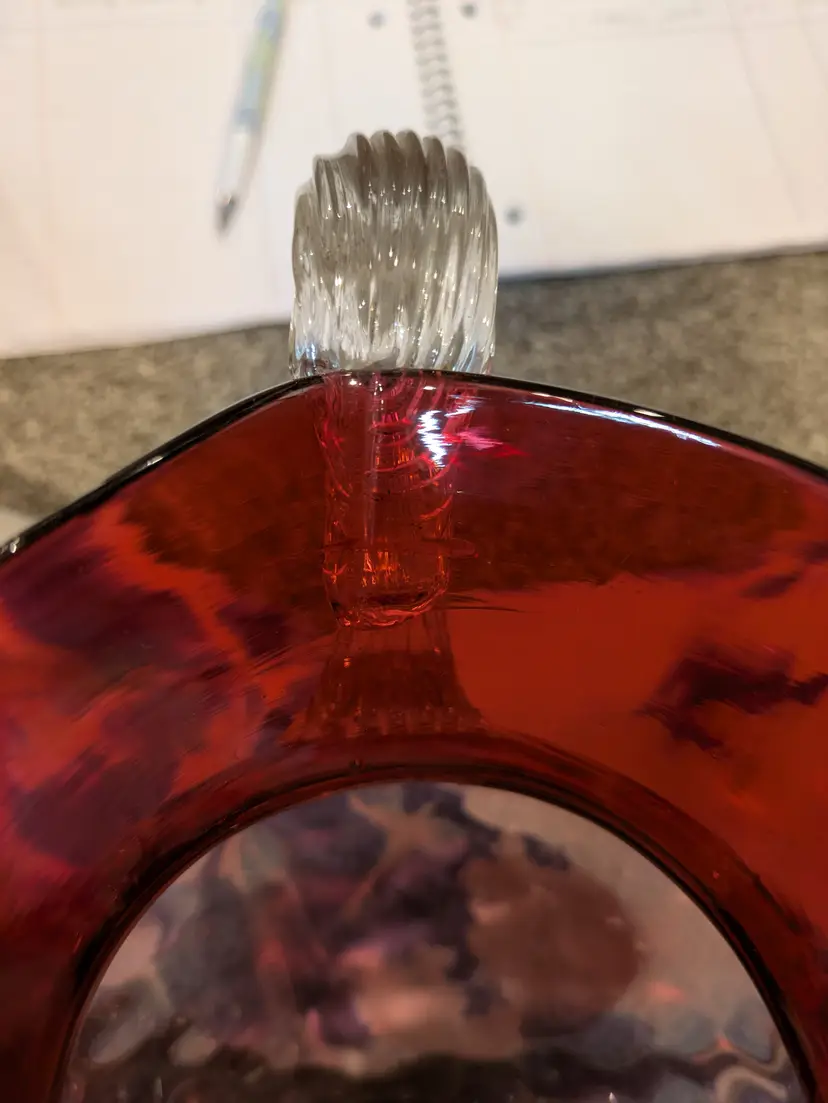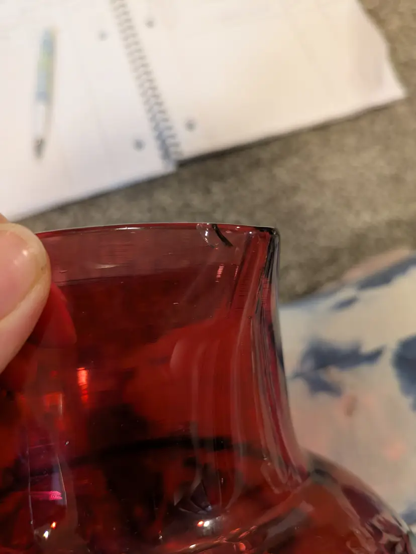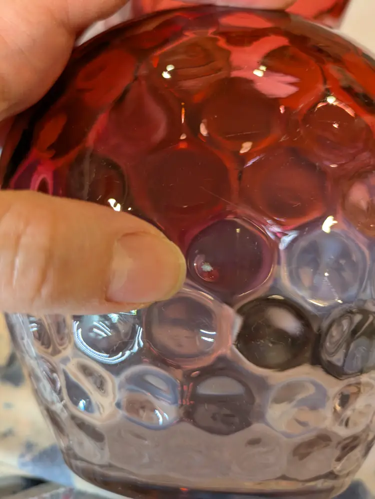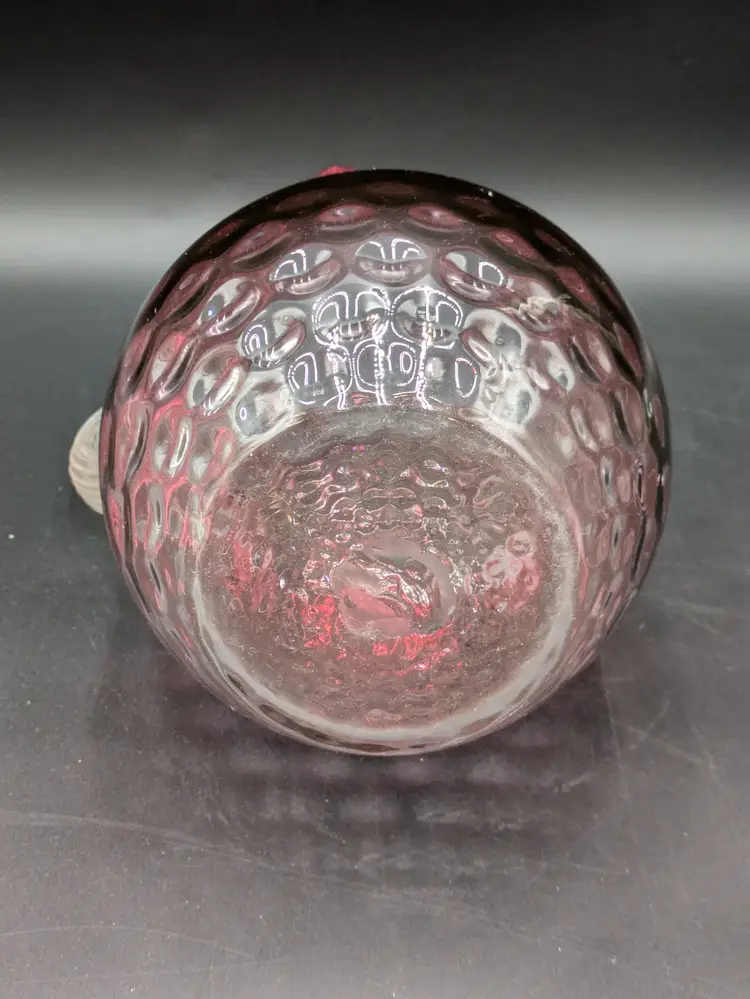 Gorgeous large cranberry glass coin dot pitcher with a unique diamond shaped opening. The color fades to a lovely pink towards the bottom. I'm not sure about the age but I've seen similar dating back to Victorian times. Condition is great with a couple of small flaws (see photos). There is some scuffing on the bottom, but if this piece is as old as Victorian, it's in wonderful shape. 8.5" tall, 4.5" wide, 7" handle to spout.