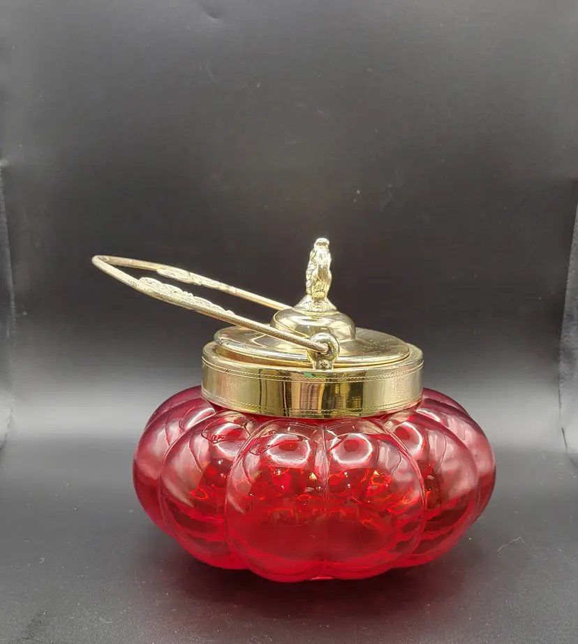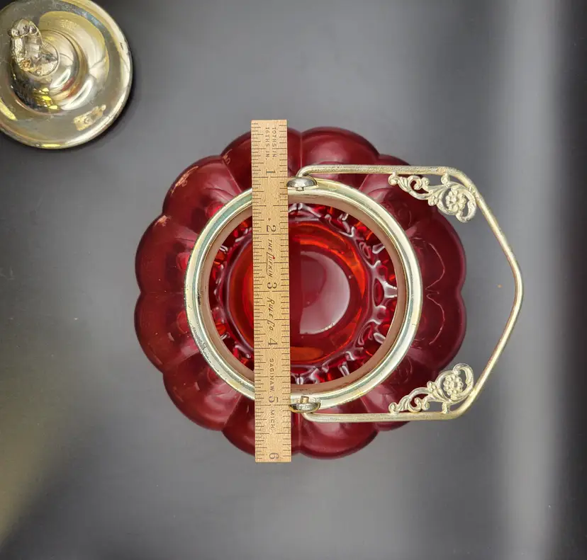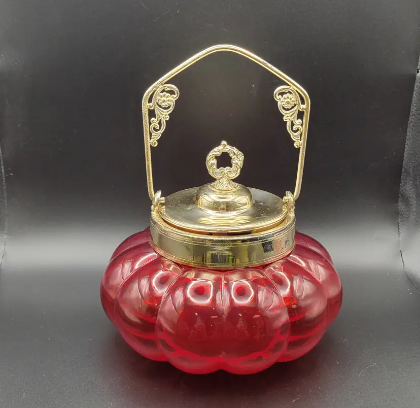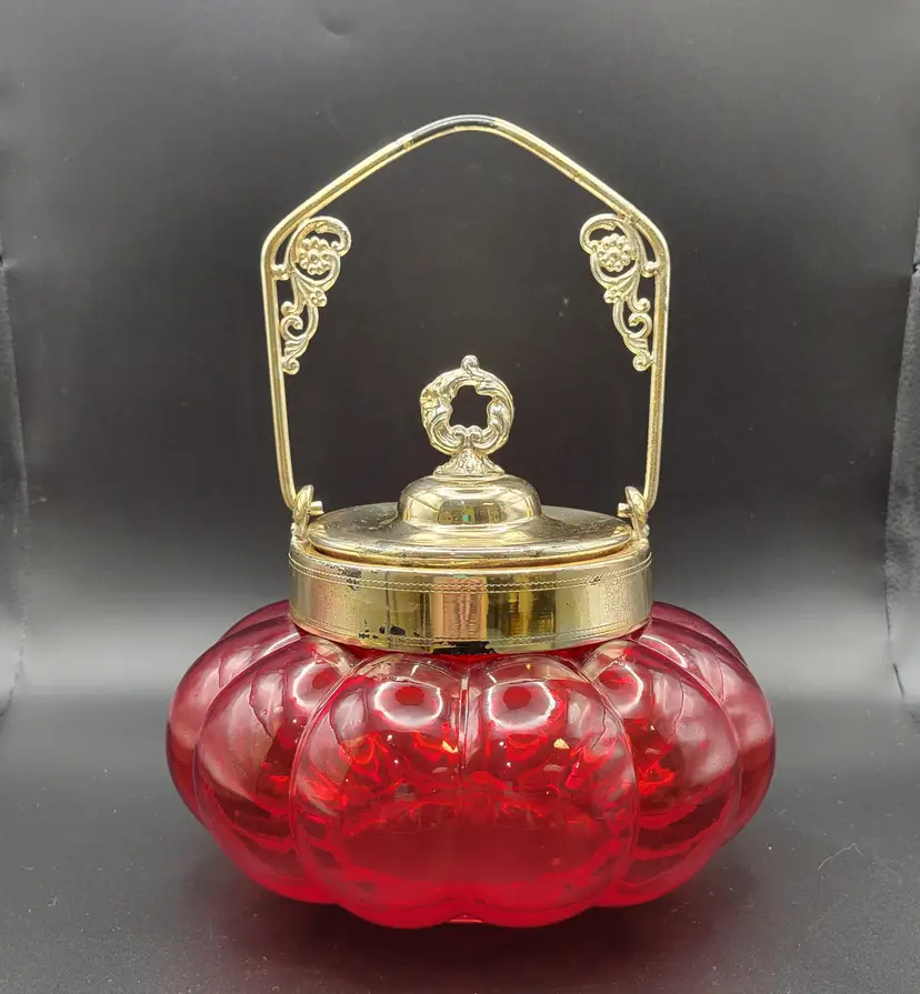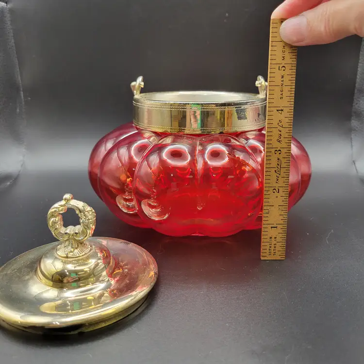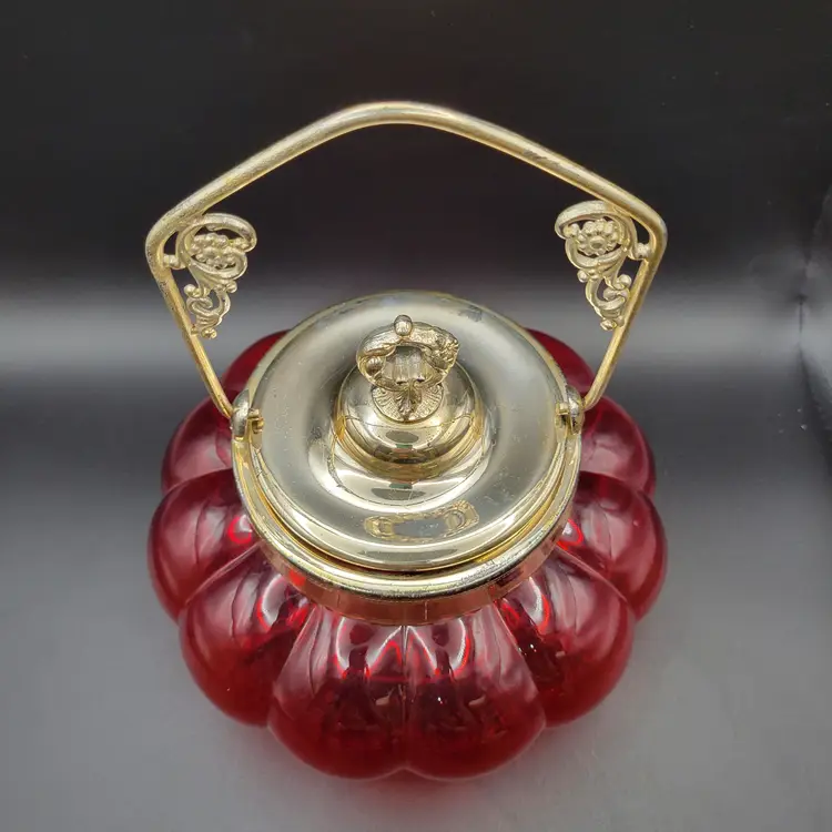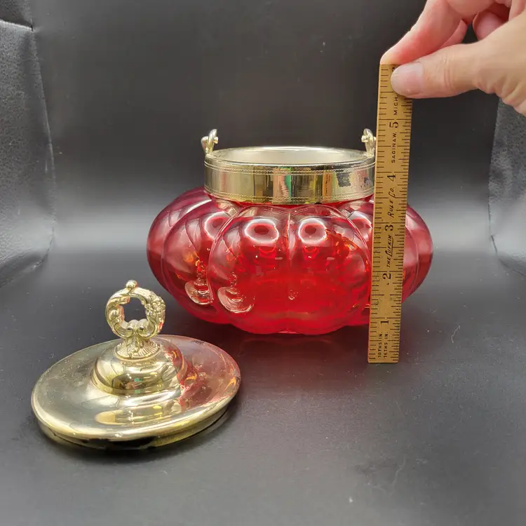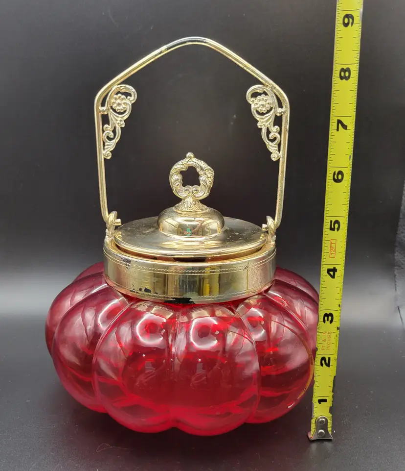 19th Century Victorian era cranbery glass melon shaped biscuit jar with lid and handle, Unknown maker Measures overall 8.5 inches tall with handle and 6 inches in diameter. In good antique used condition crisp clean vibrant no glass chips cracks breaks or stains, silver plate lid has some wear through on lid as shown in pictures. Thank you for looking and have a great day!